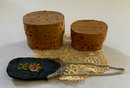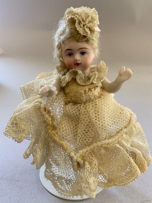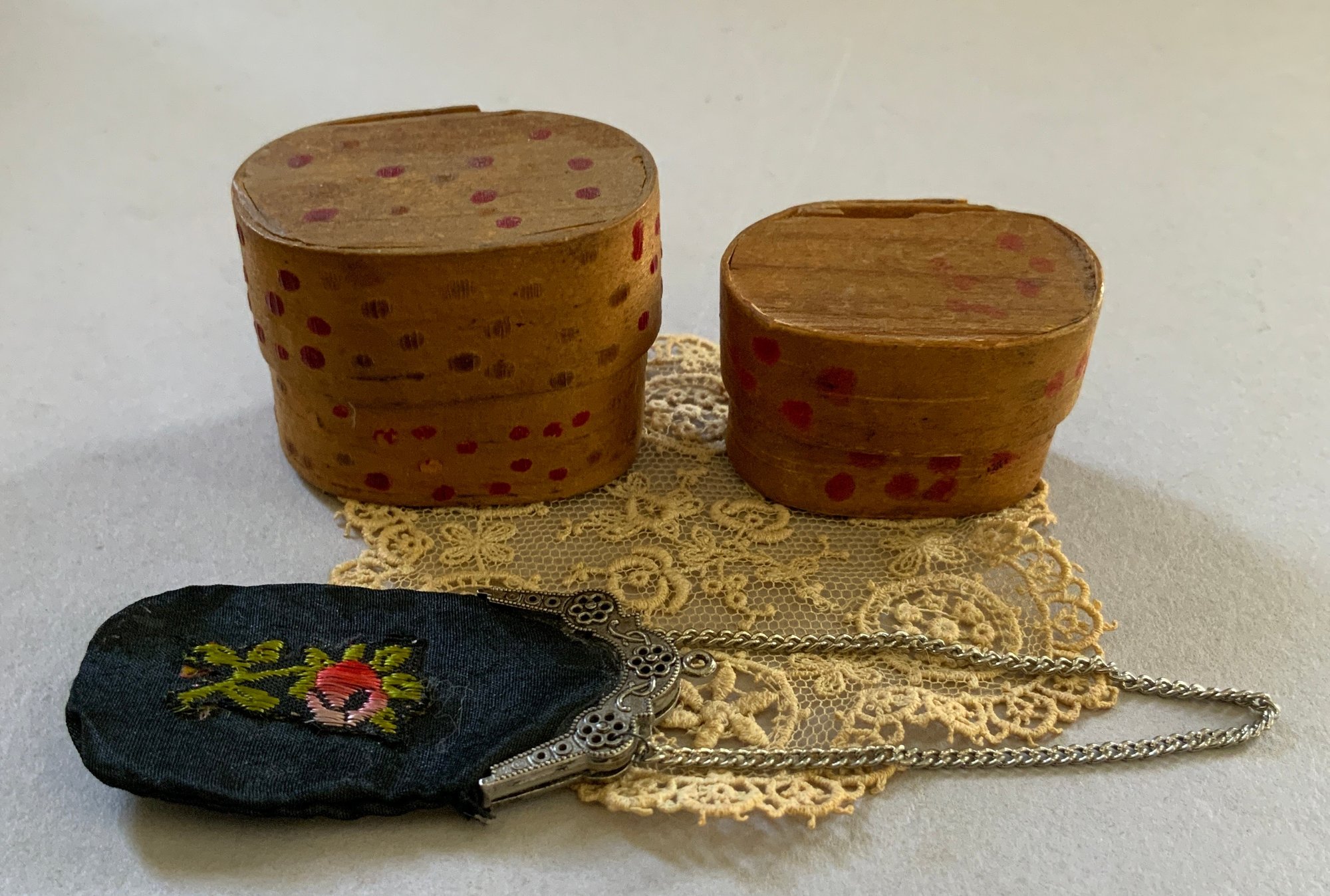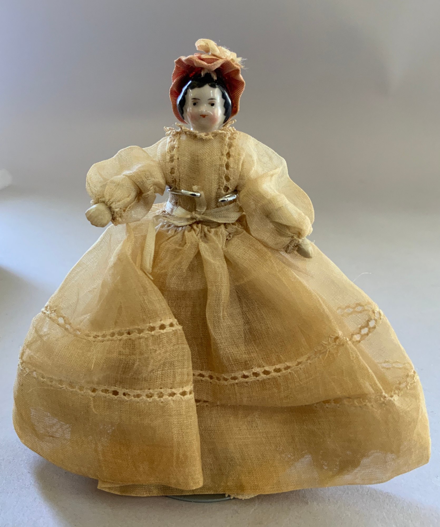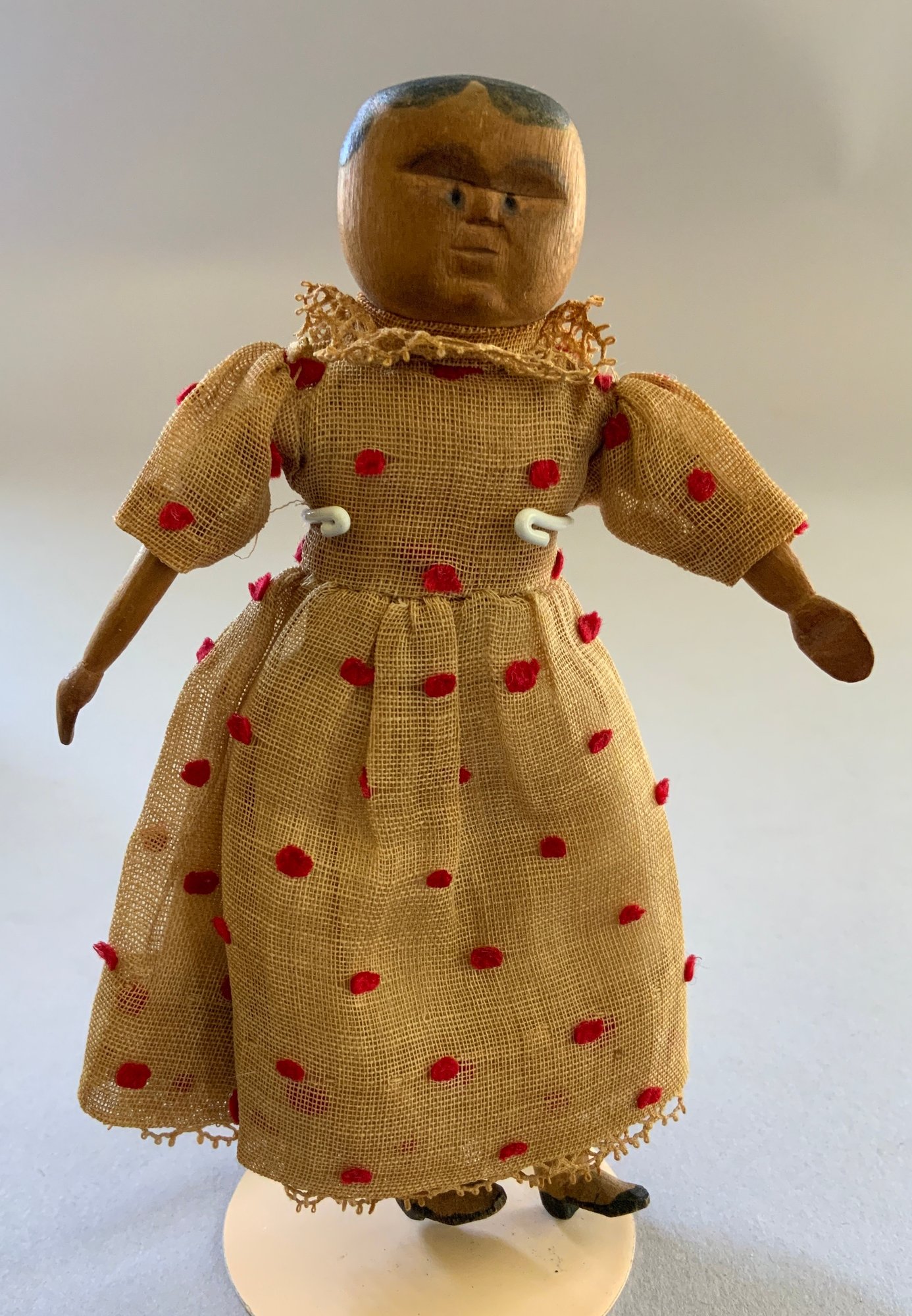 3 – Small dolls, 1 – 4 ½” carved wooden doll, wood & cloth body, red dot dress, with 2 small oval boxes, 1 – 3” all bisque, painted features, needlework dress, & 1 – 4” black hair china, painted features