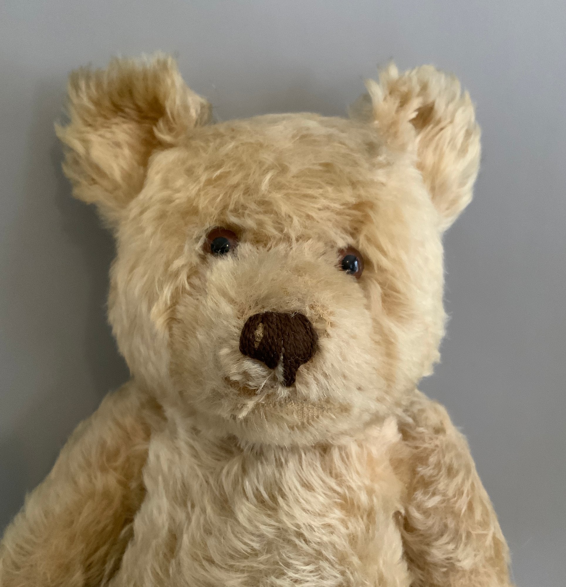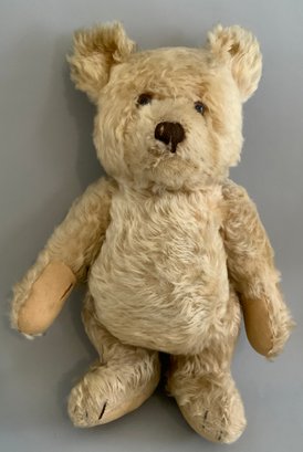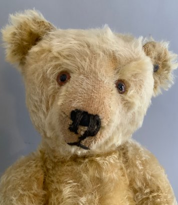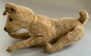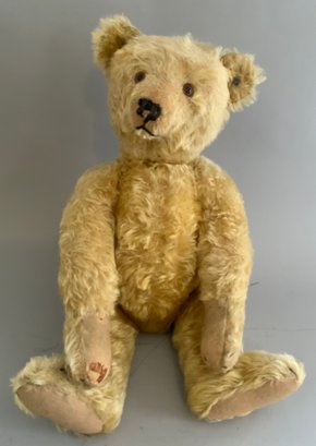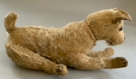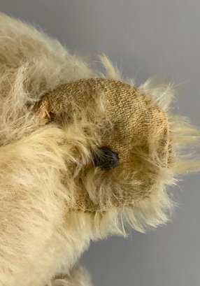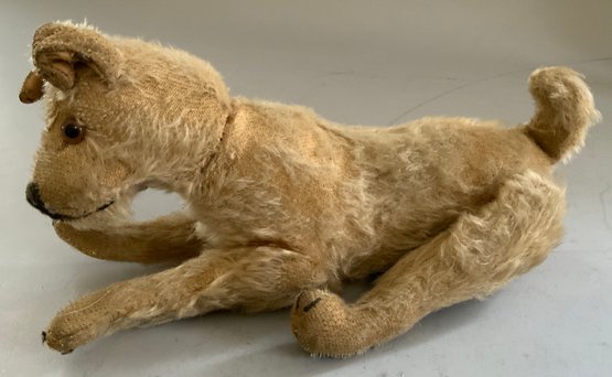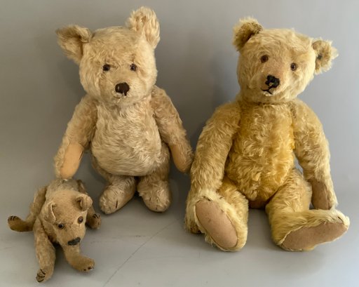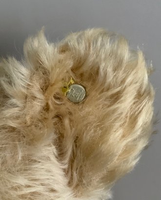 3 – Steiff animals, 18” Steiff golden blonde mohair bear with underscore f button (wear), 9” blonde mohair jointed dog with underscore f button (wear), 13” blonde mohair bear with button in ear, light wear, jointed
