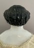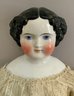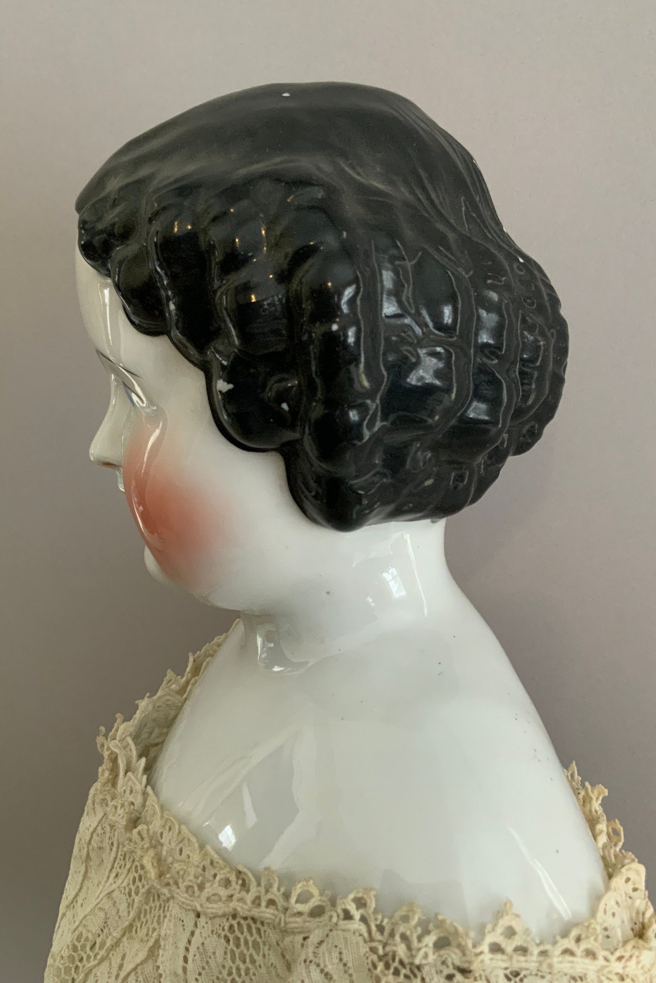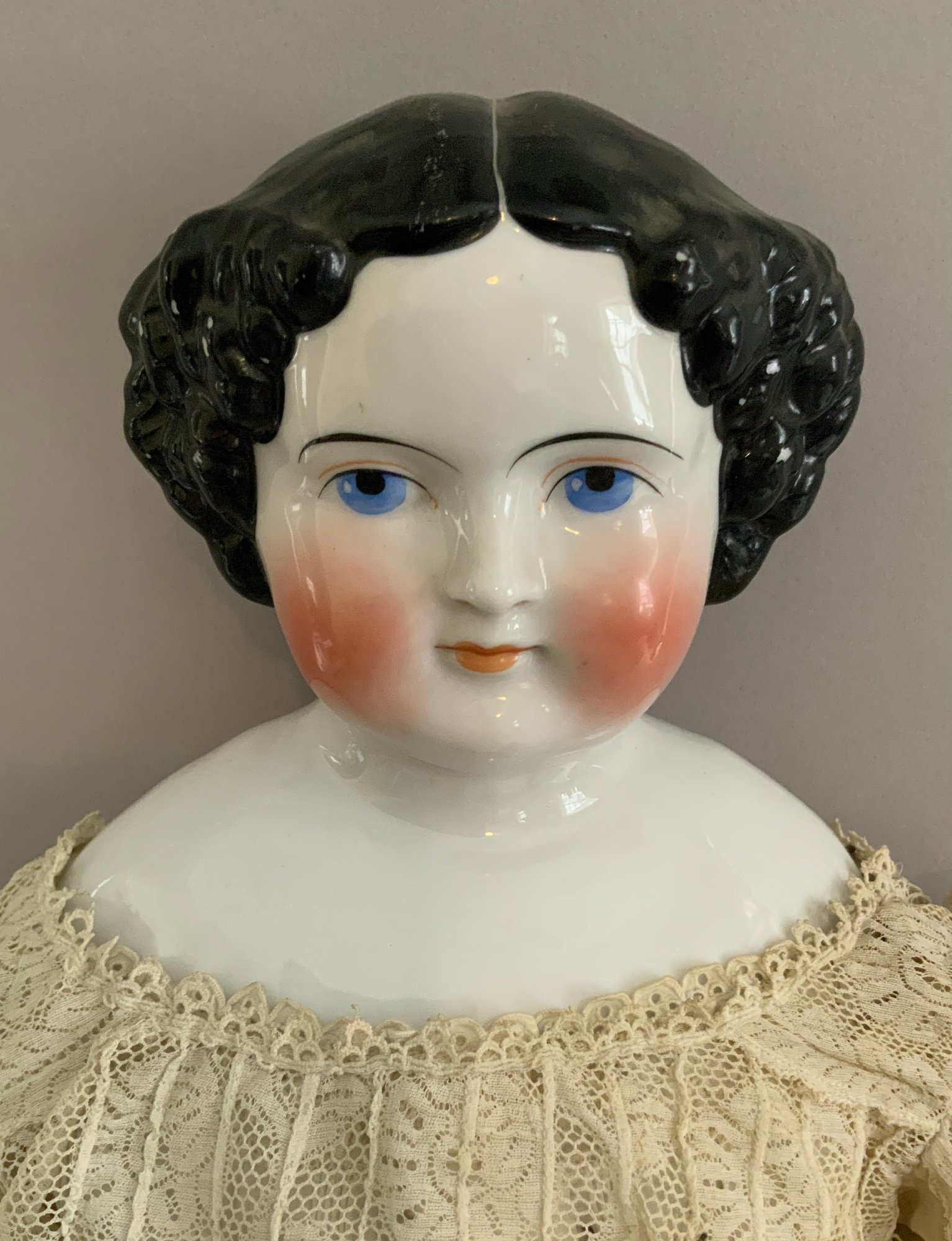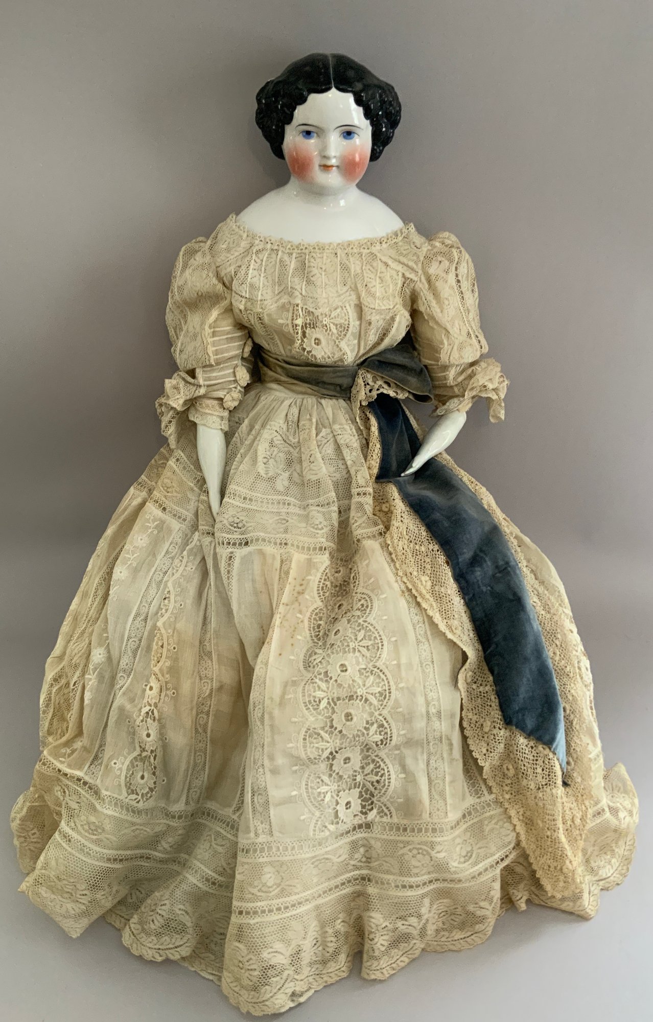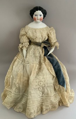 30” Black hair china, painted features, center part sculpted hair (rubs), clot body with china limbs (loose left arm), embroidered white lace dress