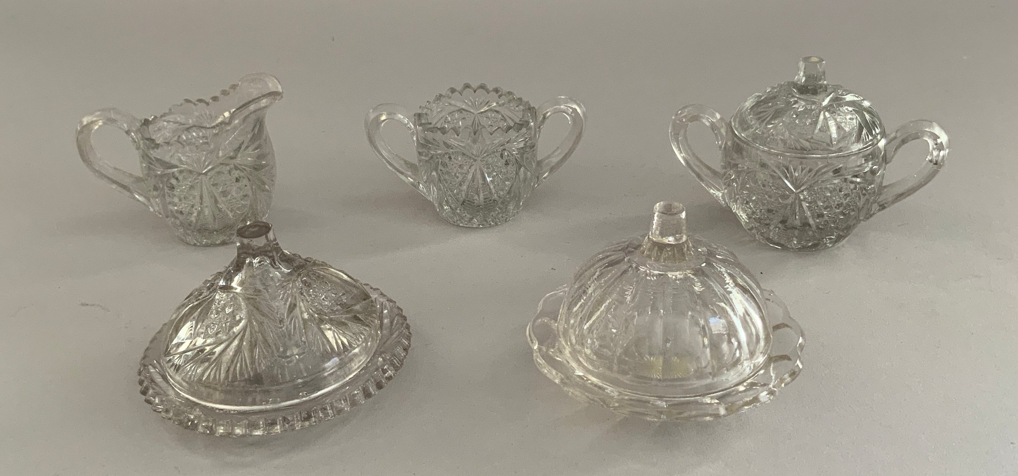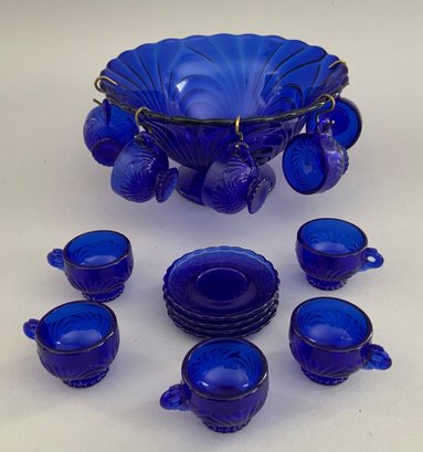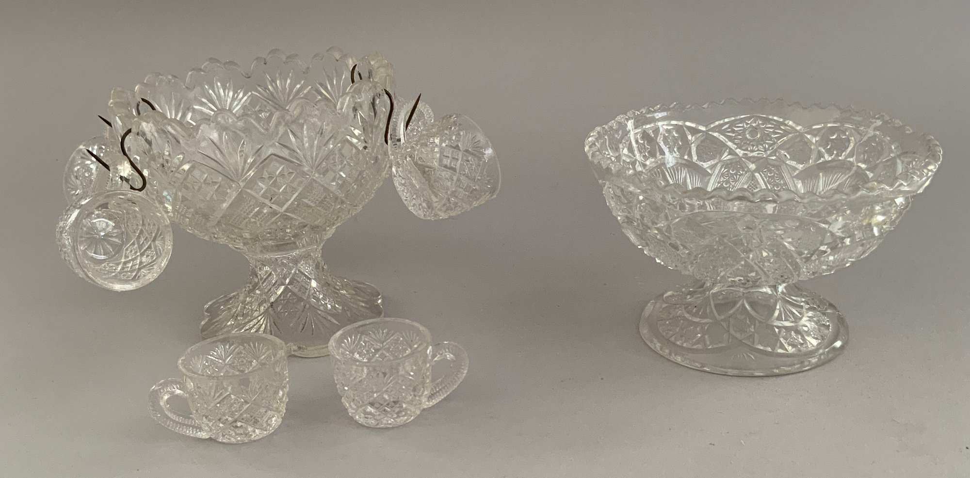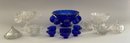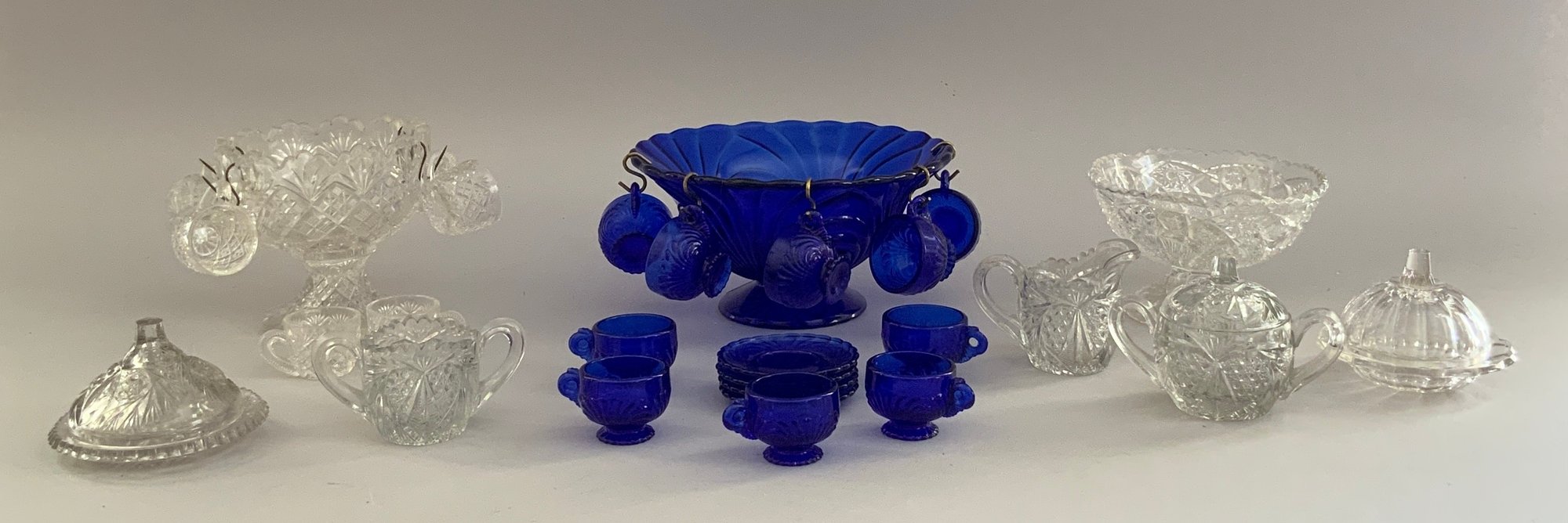 30 Pieces of assorted child’s party glass dishes, pressed glass, punch bowls, cups, etc., clear & blue glass
