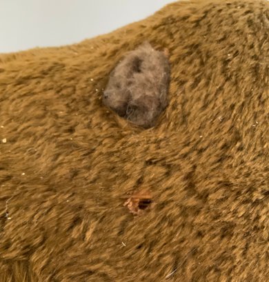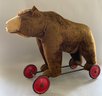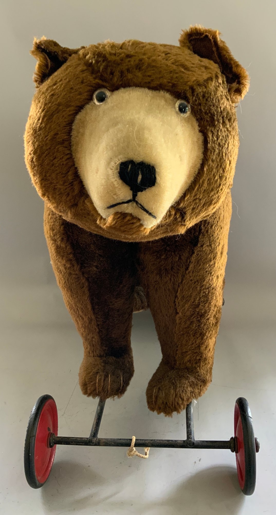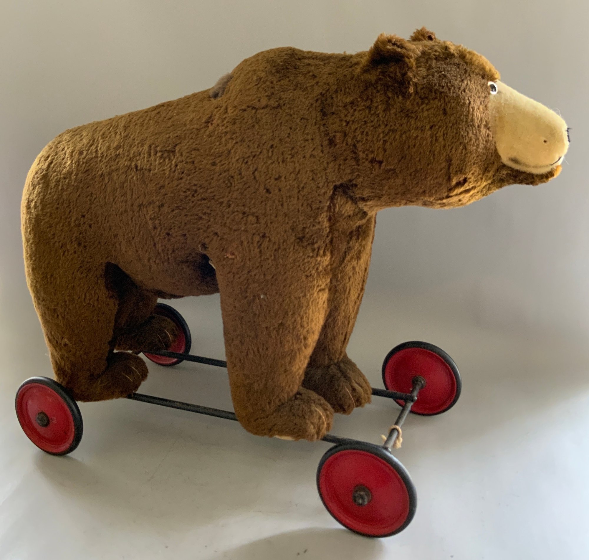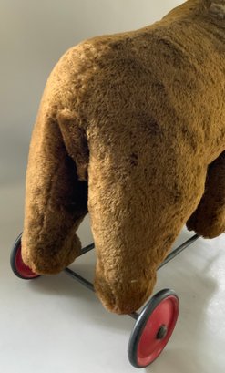 30” Steiff brown mohair bear on wheels with pull growler in back, (damage around pull wire), no button, some wear, (oversize extra shipping charges)