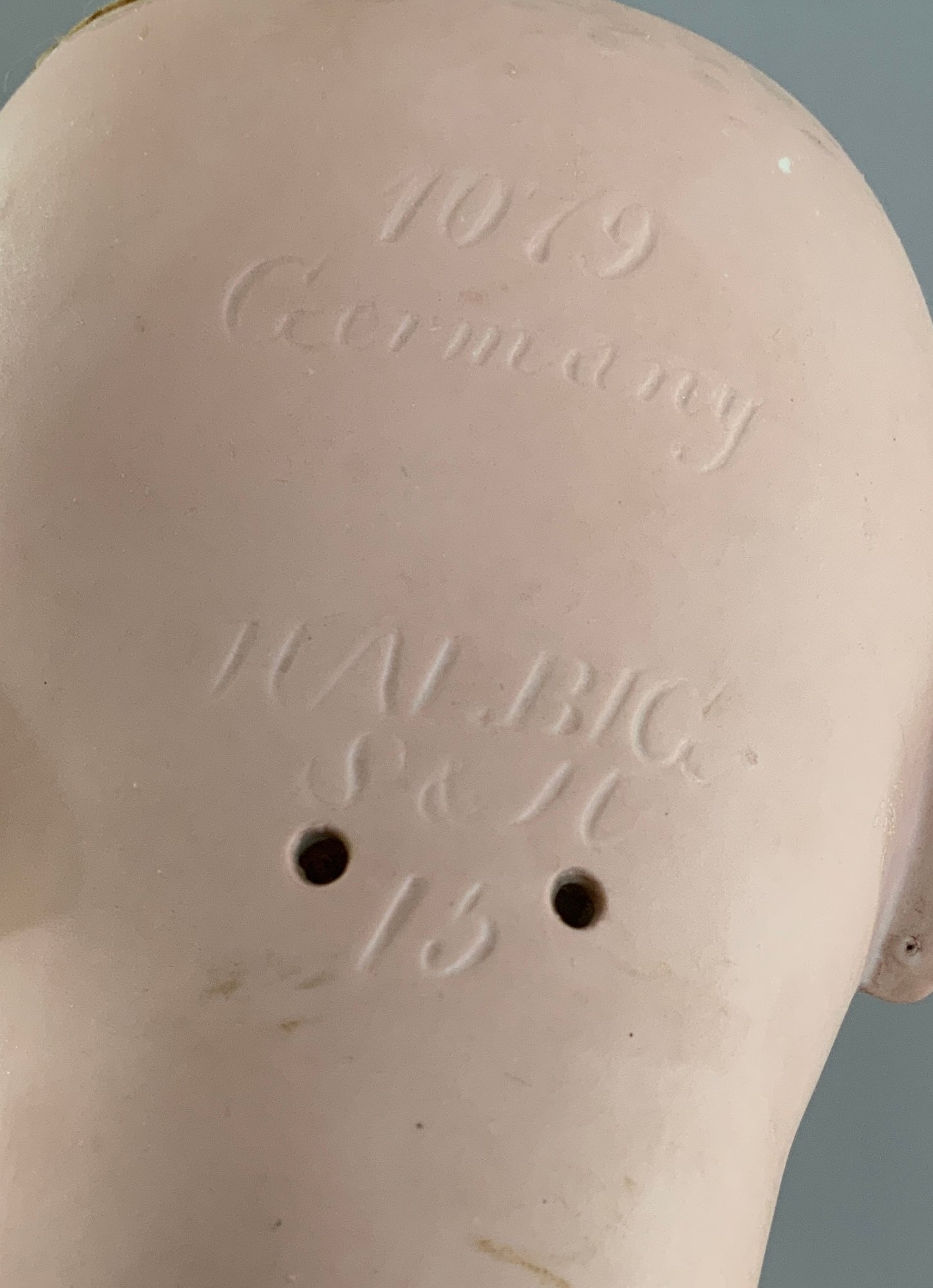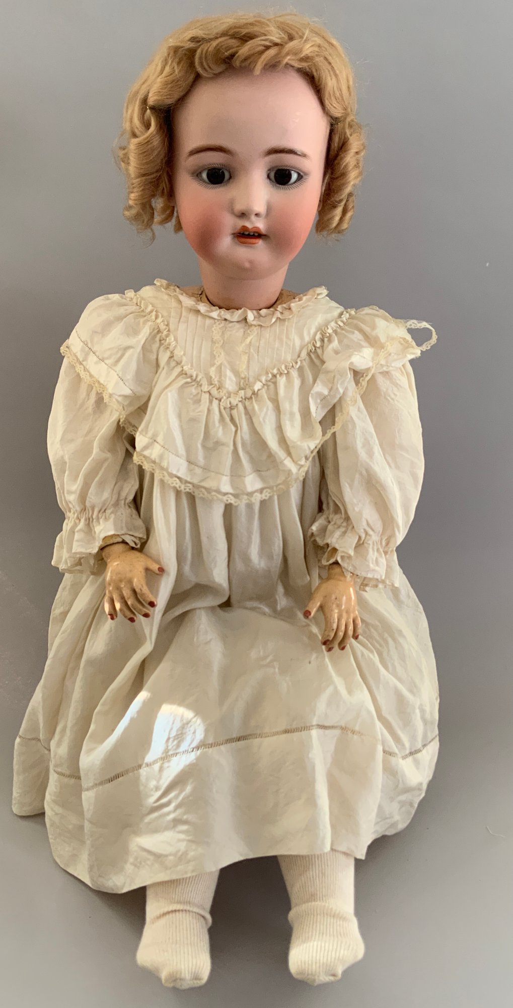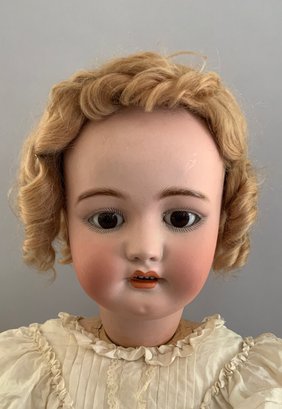 32” Simon & Halbig 1079, brown glass sleep eyes, OM with teeth, PE, blonde mohair wig, BJCB (rough around the neck), white dress, (left eye fleck, eyes have been re-set)
