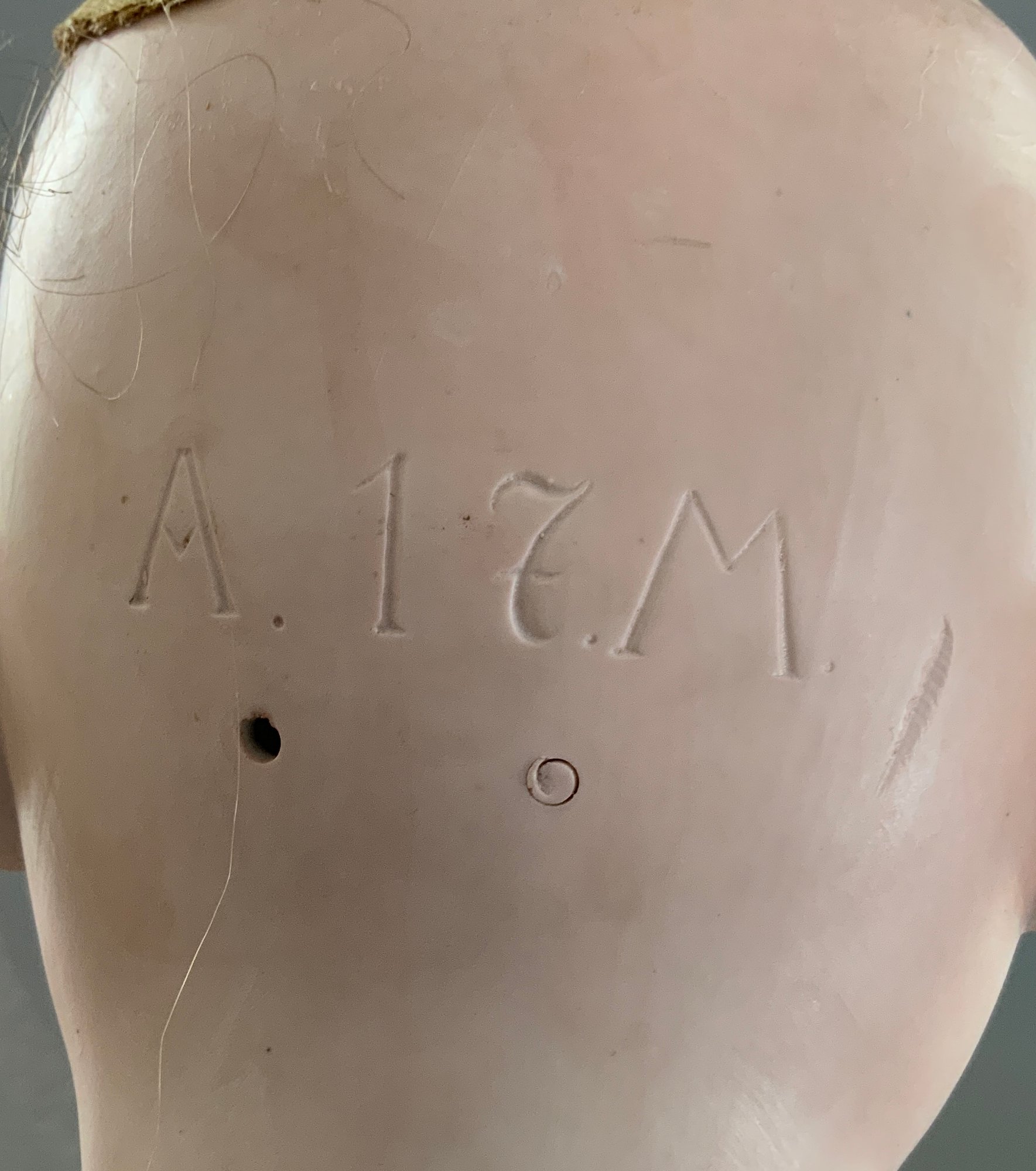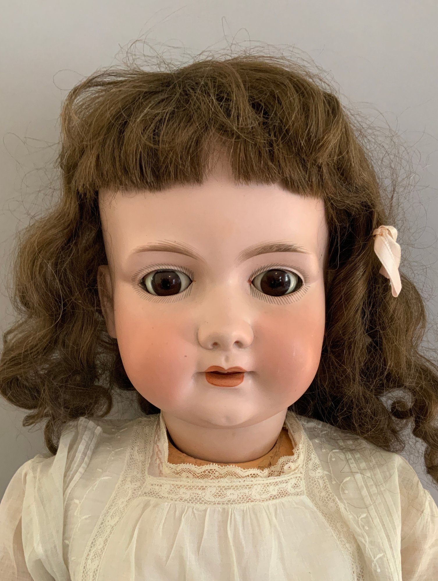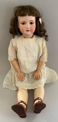38” A17M Armand Marseille, brown glass sleep eyes, OM with teeth, Brown HH wig, BJCB, white dress, (professional repair to left forehead)