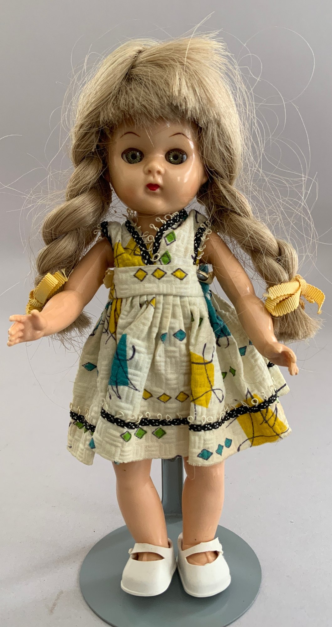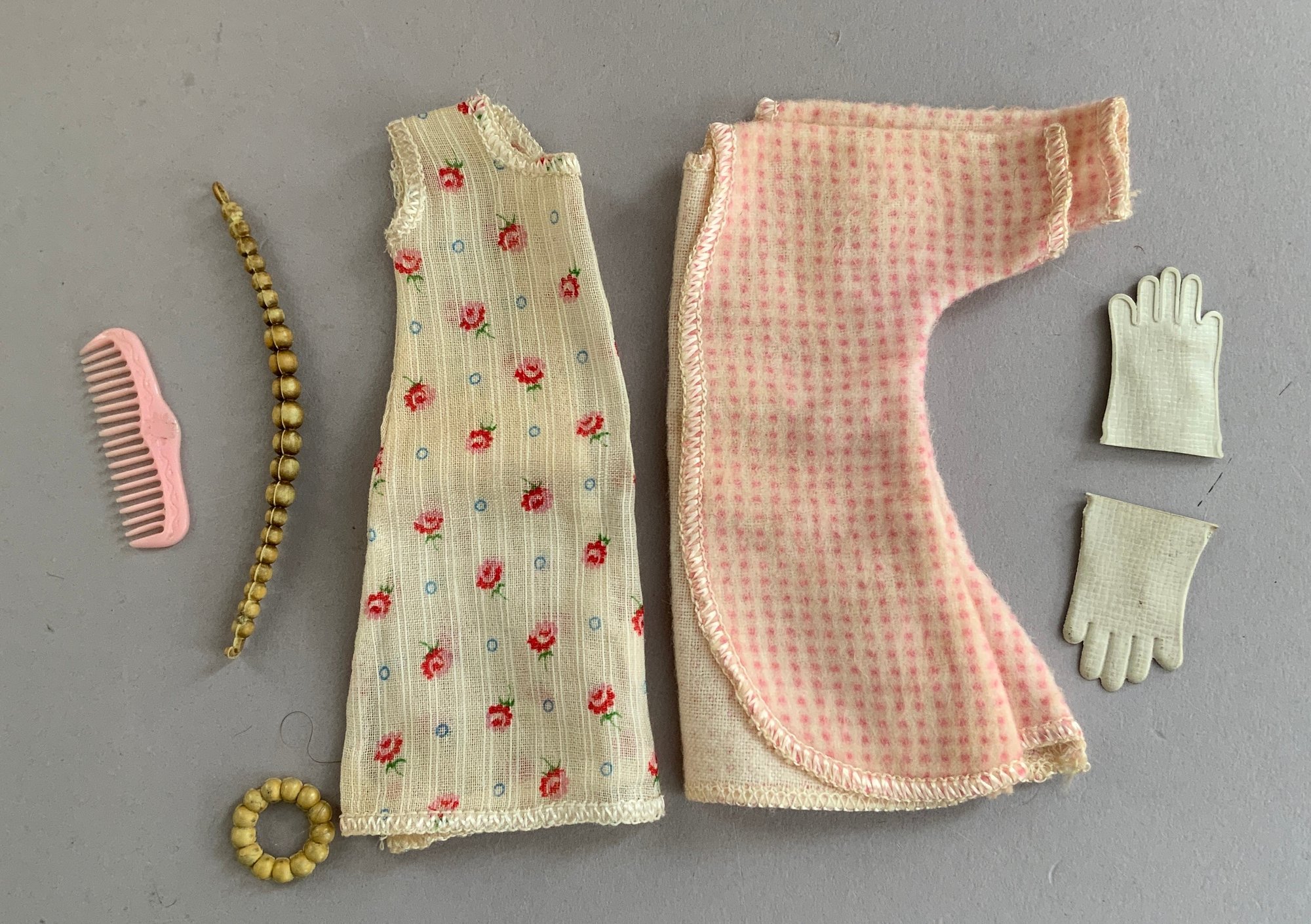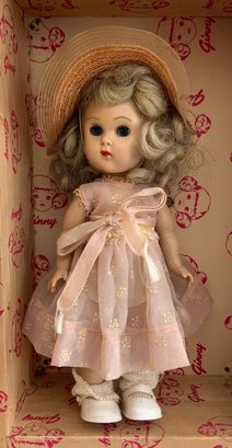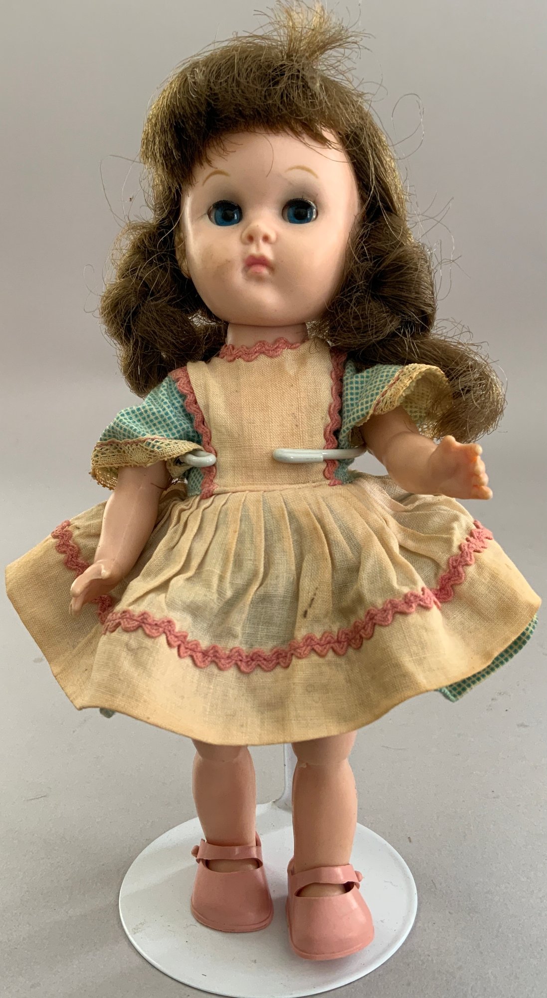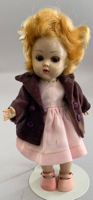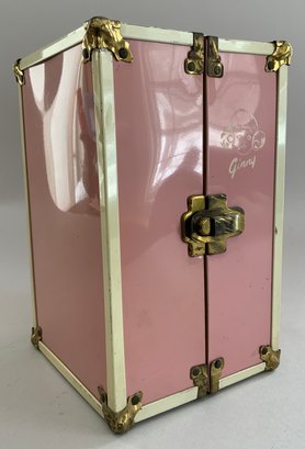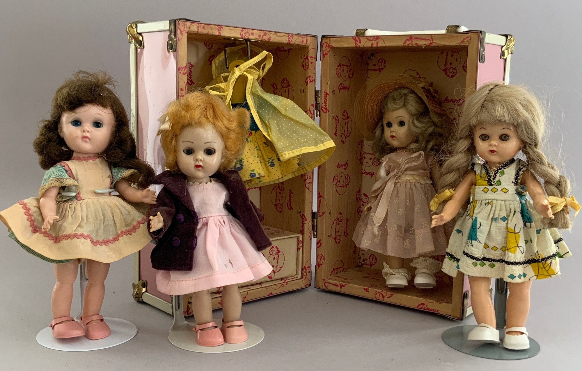 4 – 7” Vintage Vogue Ginny dolls in pink trunk, 2 – walkers, with 4 extra outfits, played-with condition