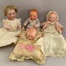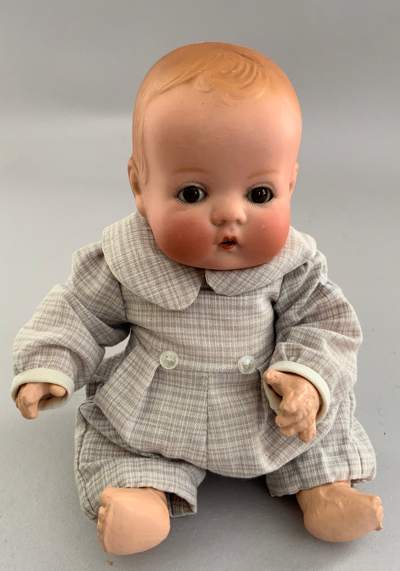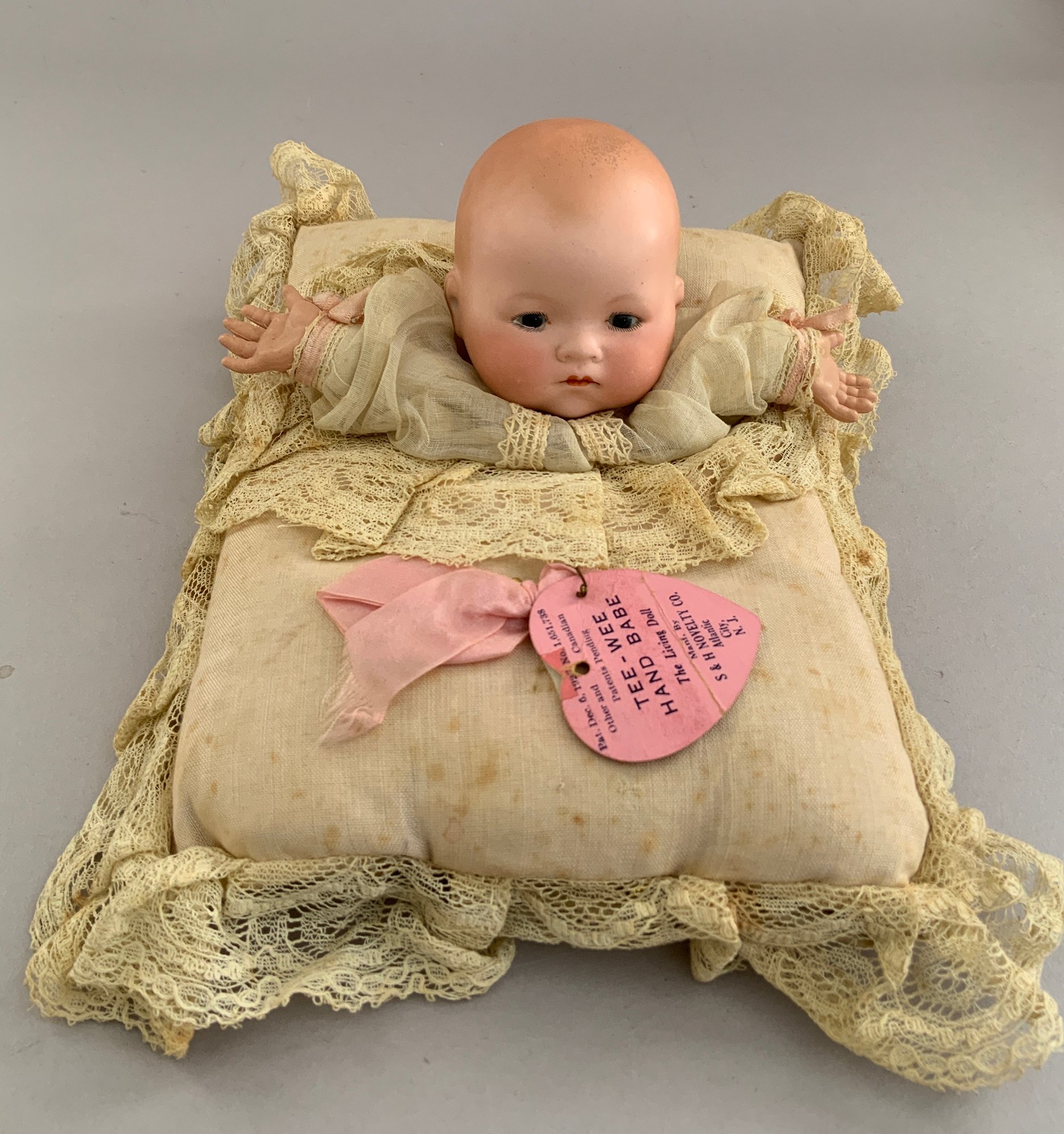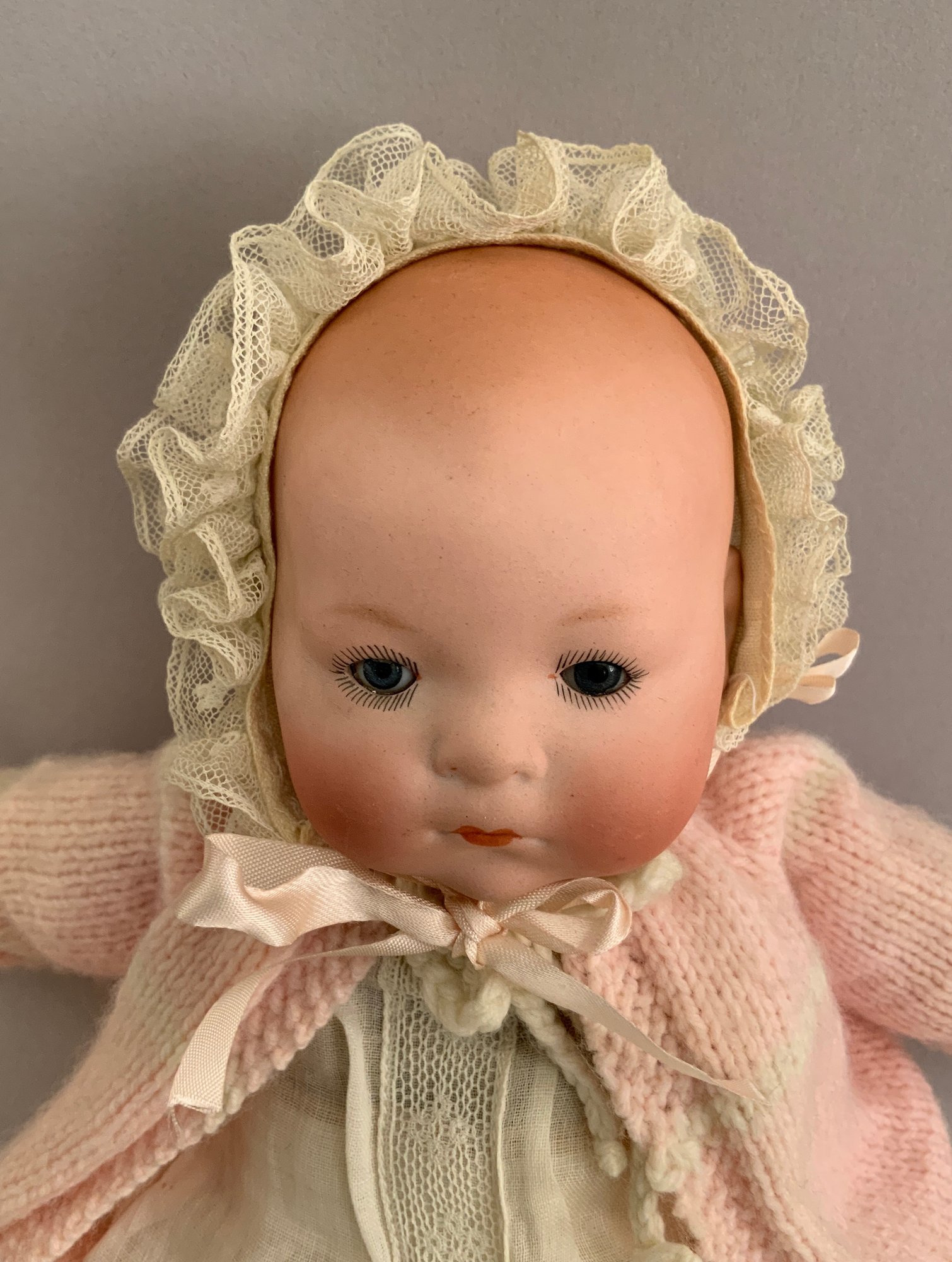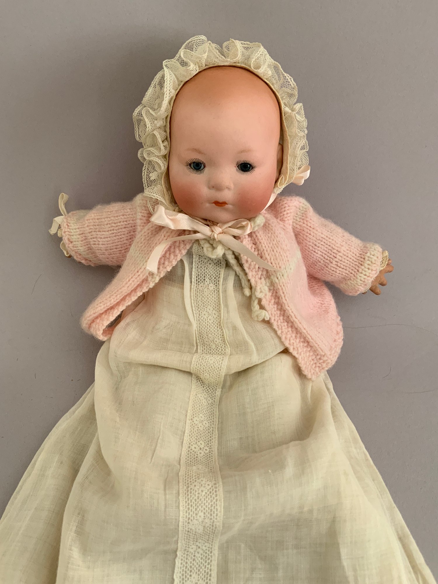 4 – Bisque baby dolls, 1 – 11” Hertel & Schwab “Skippy”, brown glass sleep eyes, OM with teeth, baby compo body, 1 – 11” A & B 4 George Borgfeldt, blue glass sleep eyes, OM with teeth, blonde mohair wig, baby compo body, white dress, 1 – 11” Heubach Koppelsdorf 349, blue glass sleep eyes, CM, cloth body, compo hands, white dress with pink knit sweater, & 1 – AM pillow puppet head inc. 341, with original tag, blue glass eyes, resting on a pillow