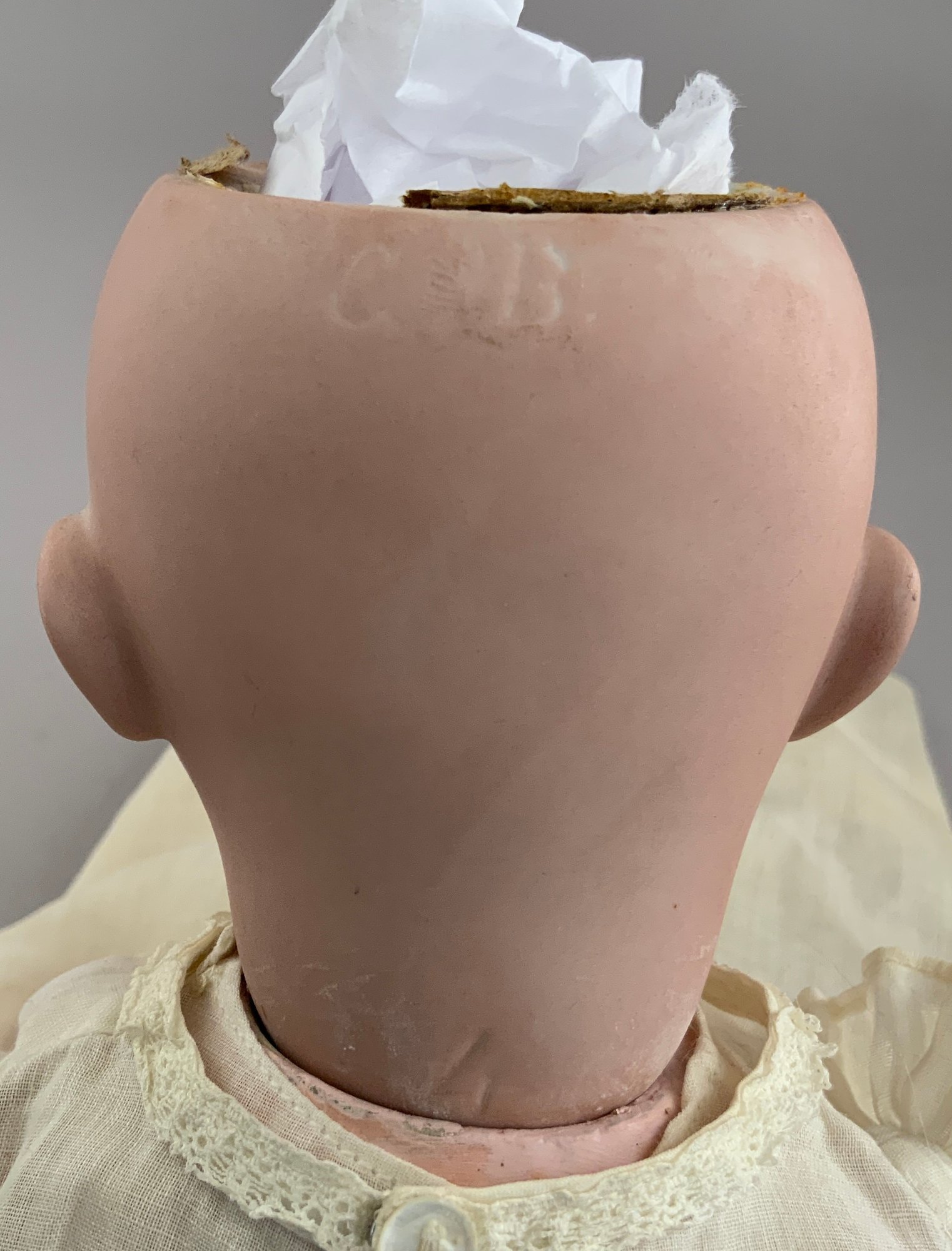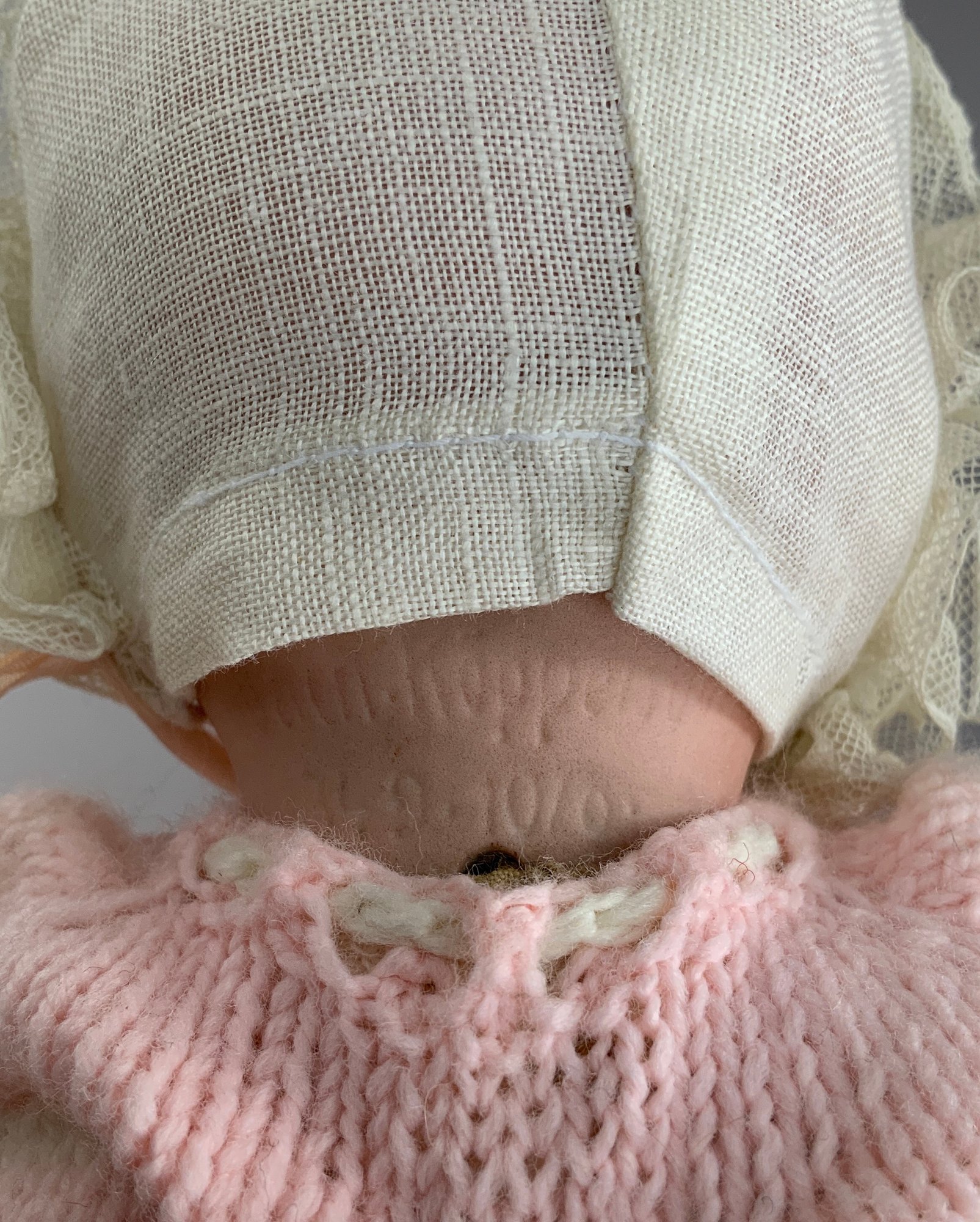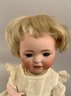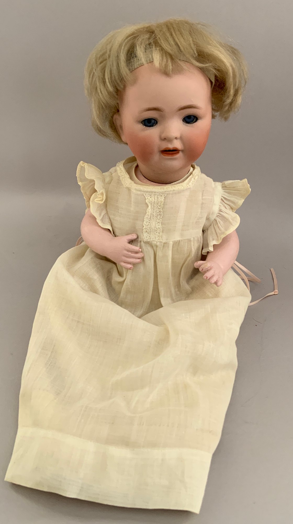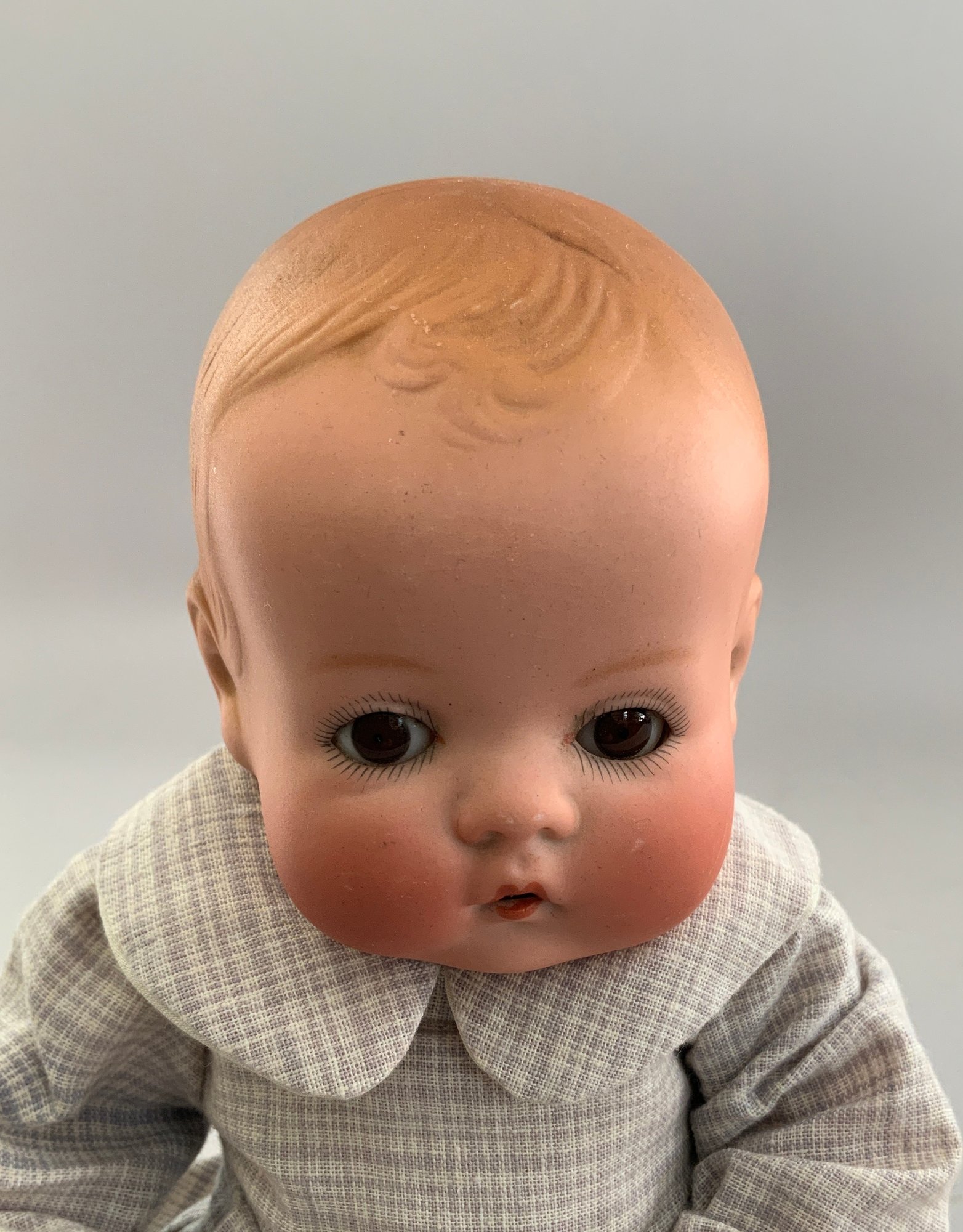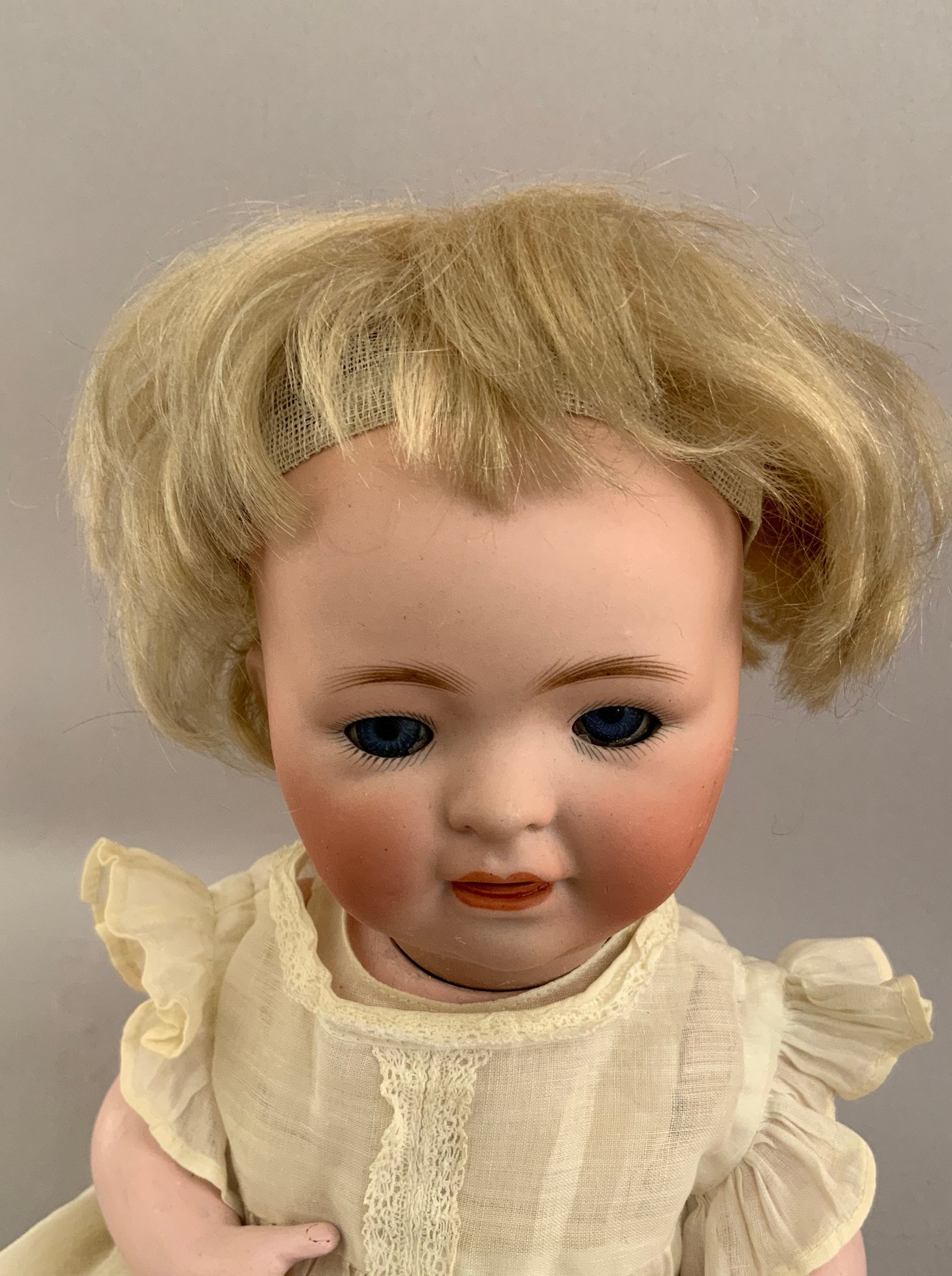 4 – Bisque baby dolls, 1 – 11” Hertel & Schwab “Skippy”, brown glass sleep eyes, OM with teeth, baby compo body, 1 – 11” A & B 4 George Borgfeldt, blue glass sleep eyes, OM with teeth, blonde mohair wig, baby compo body, white dress, 1 – 11” Heubach Koppelsdorf 349, blue glass sleep eyes, CM, cloth body, compo hands, white dress with pink knit sweater, & 1 – AM pillow puppet head inc. 341, with original tag, blue glass eyes, resting on a pillow