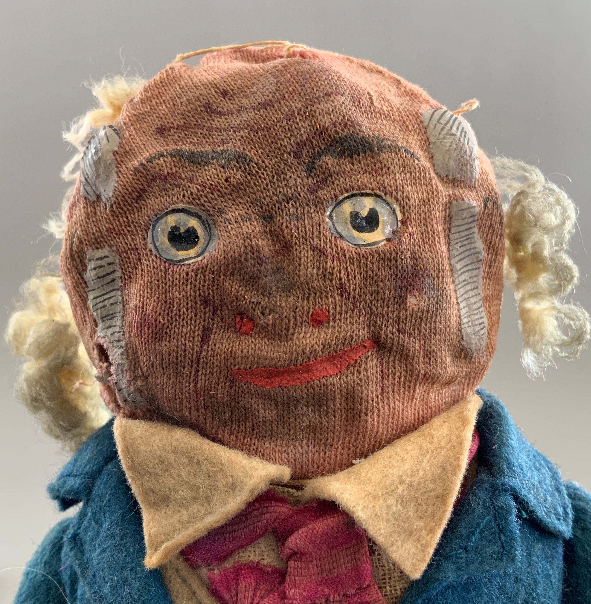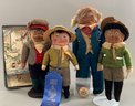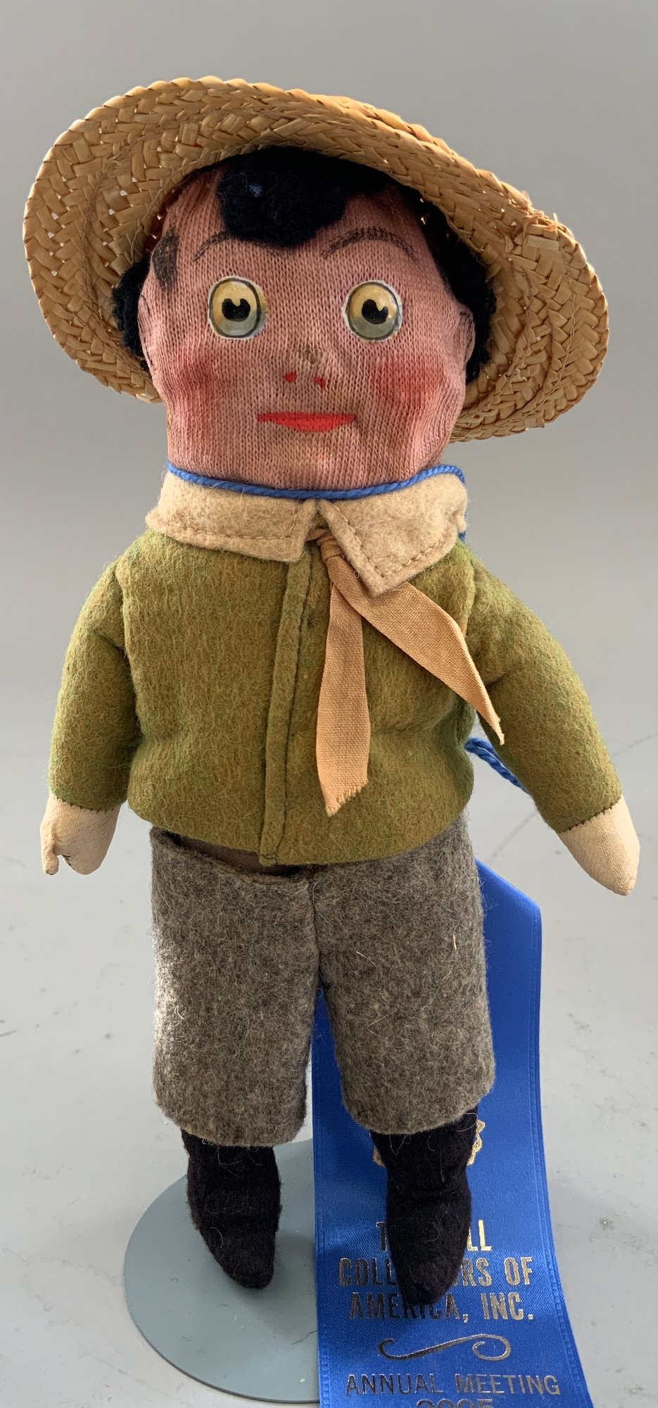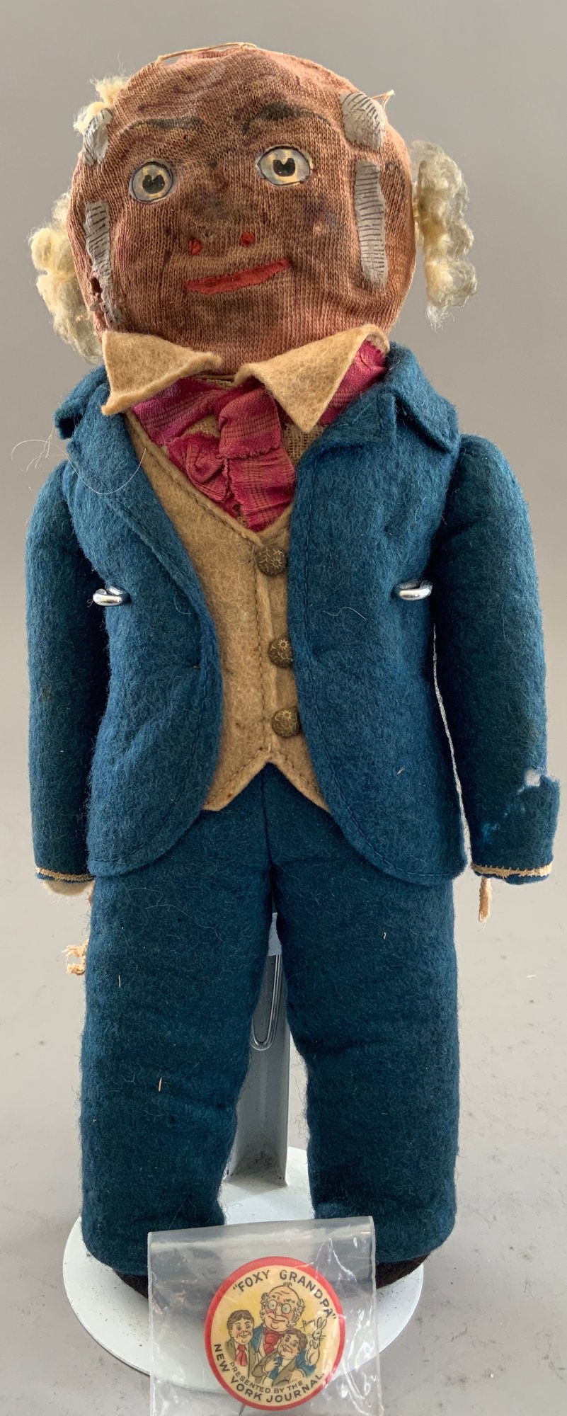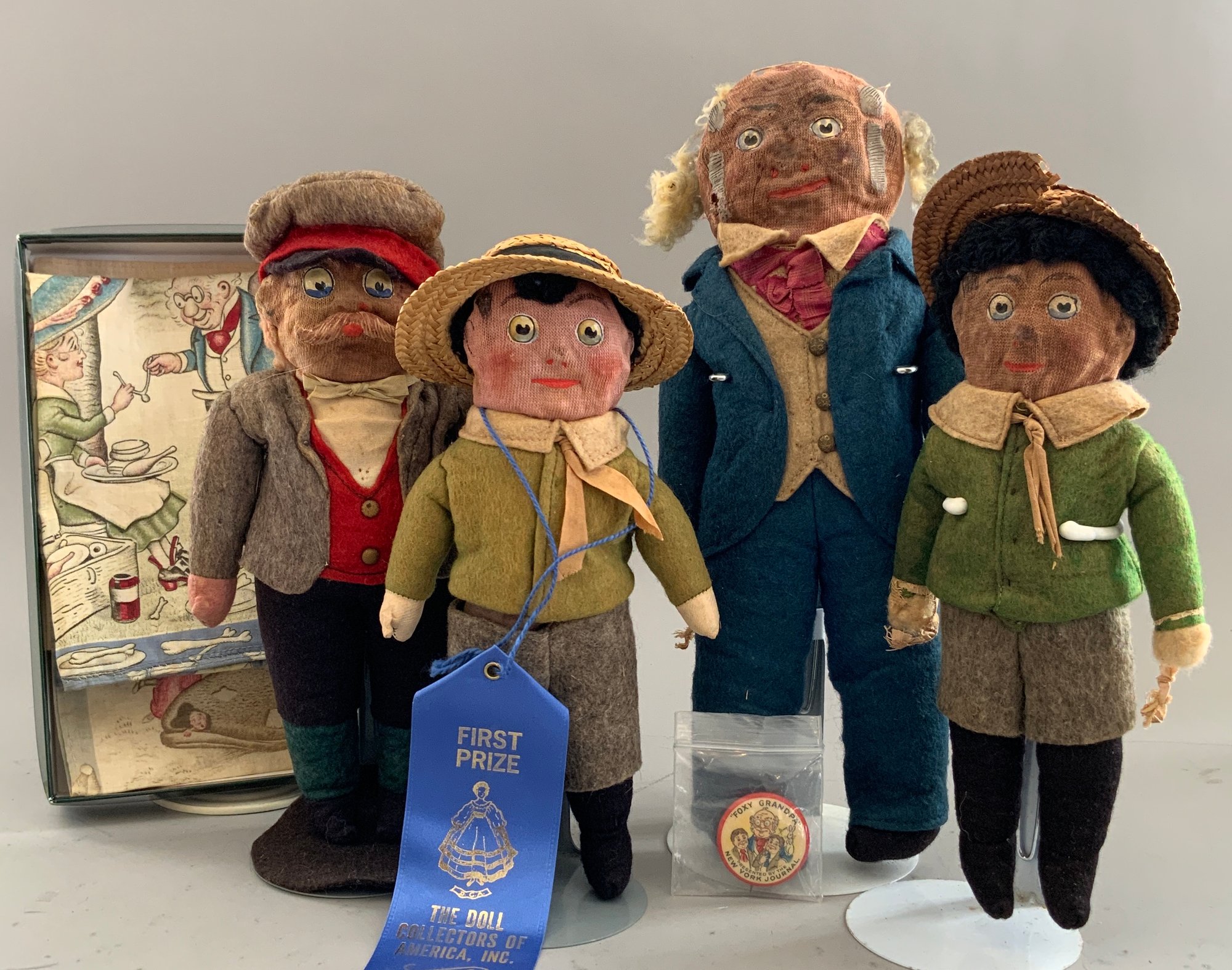 4 – Cloth Foxy Grandpa and the boys character dolls, sculpted & painted features, 8 ½” – 11”, 1 has DCA 2005 1st place ribbon, some holes & wear, along with a Foxy Grandpa pin & 4 – Foxy Grandpa handkerchiefs (2 sewn together)