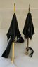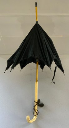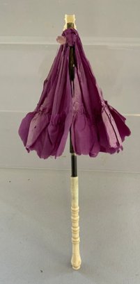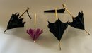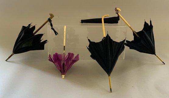 4 – Doll parasols 7 ½” – 11 ½” long, 3 - black, 1 – purple, 3 - with ivory handles, 1 – with brass dog handle, as is