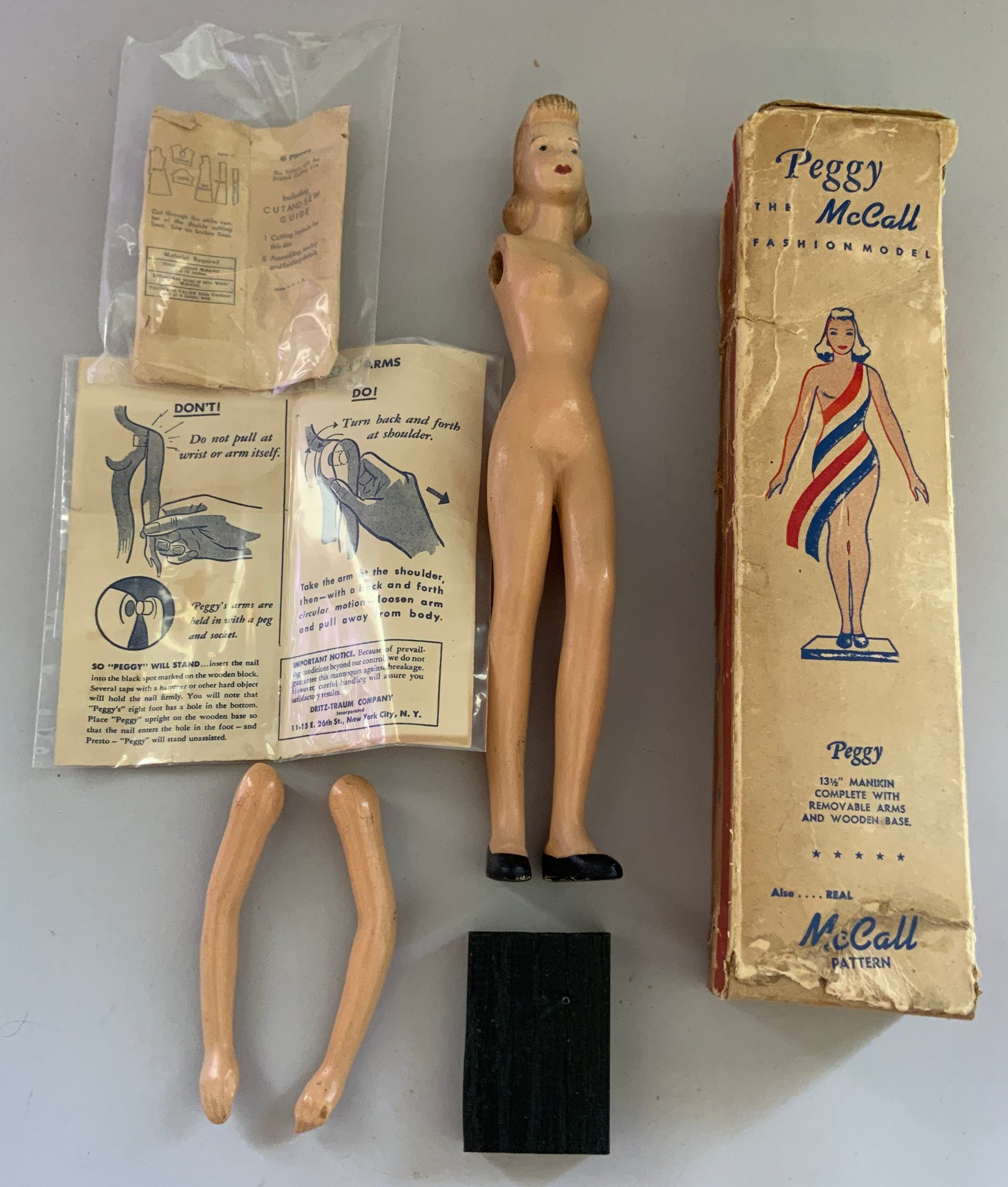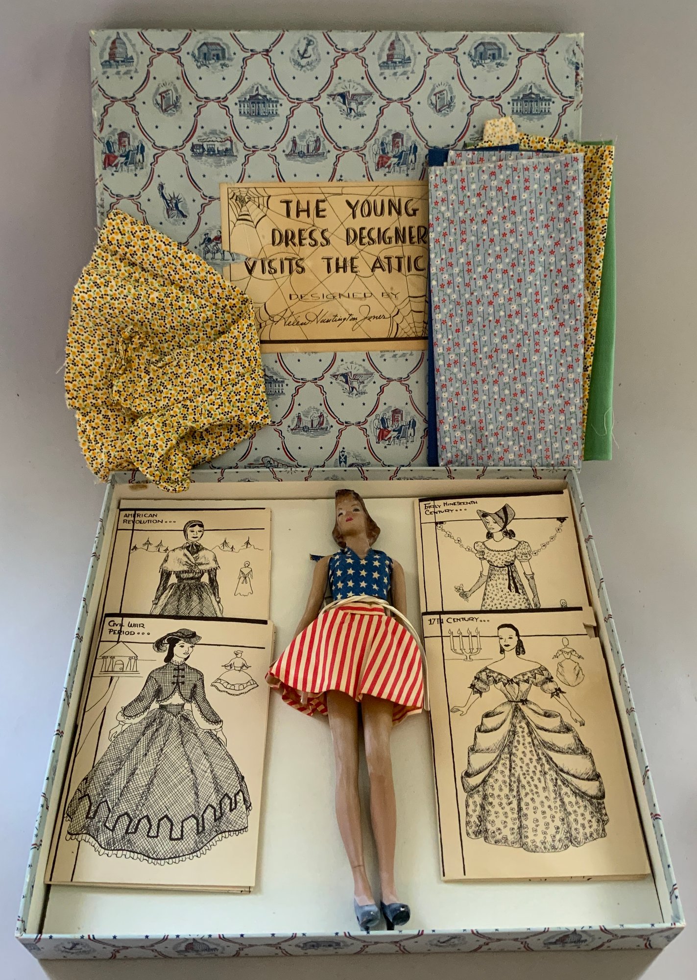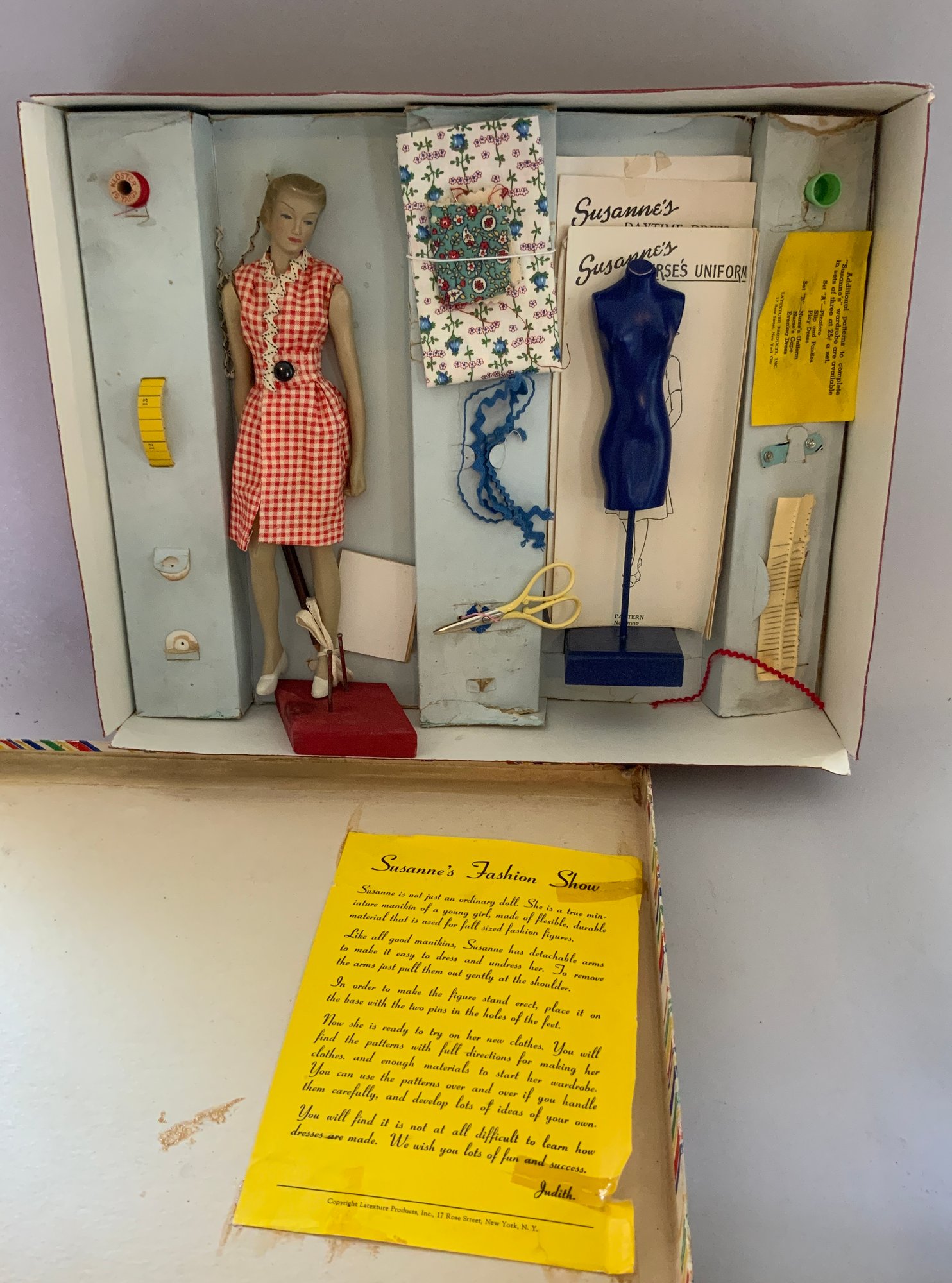4 – Mannequin Sewing Sets, Peggy McCall Fashion Model 1940’s Dritz-Traum Co., The Young Dress Designer Visits the Attic, designed by Helen Huntington Jones 1943 for FAO Schwartz, Vivianne’s Fashion Designing Set 1940’s, Latexture, NY, Susanne’s Fashion Show 1940’s, Latexture Products, original boxes some wear