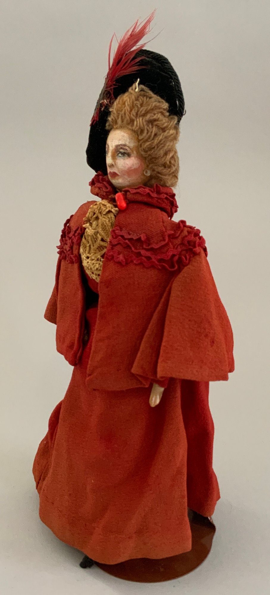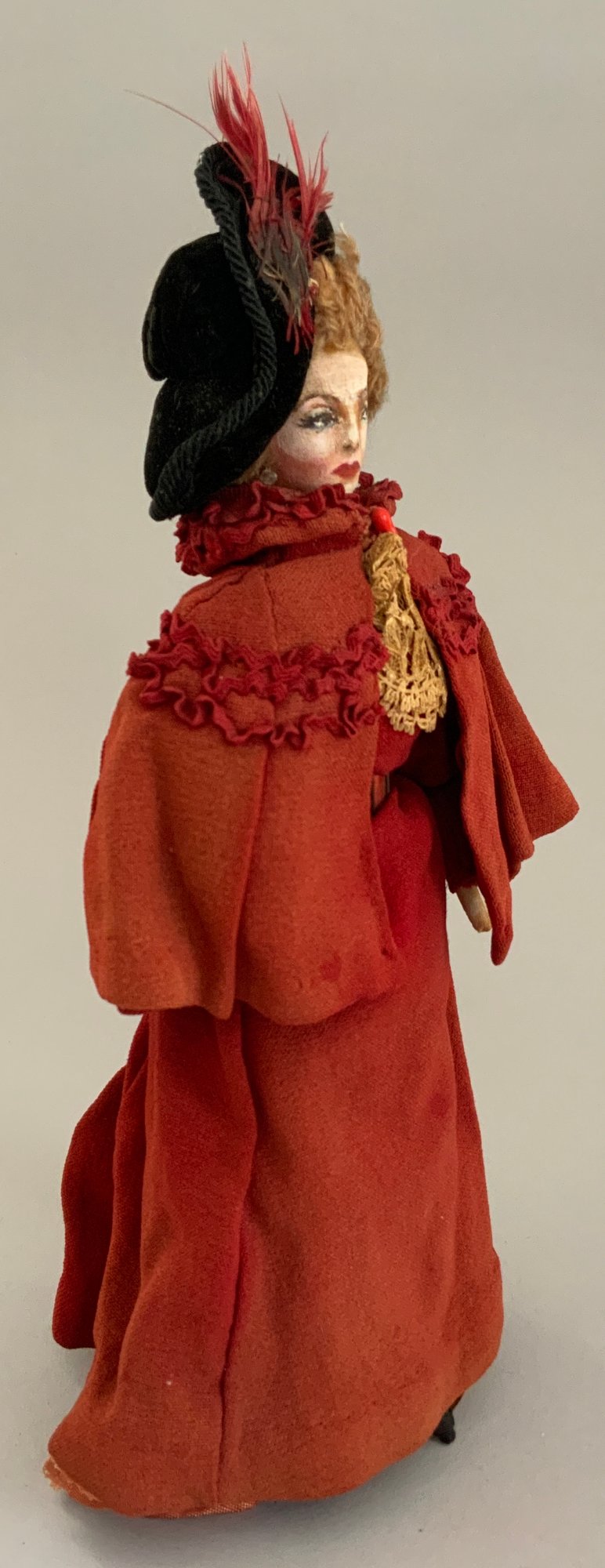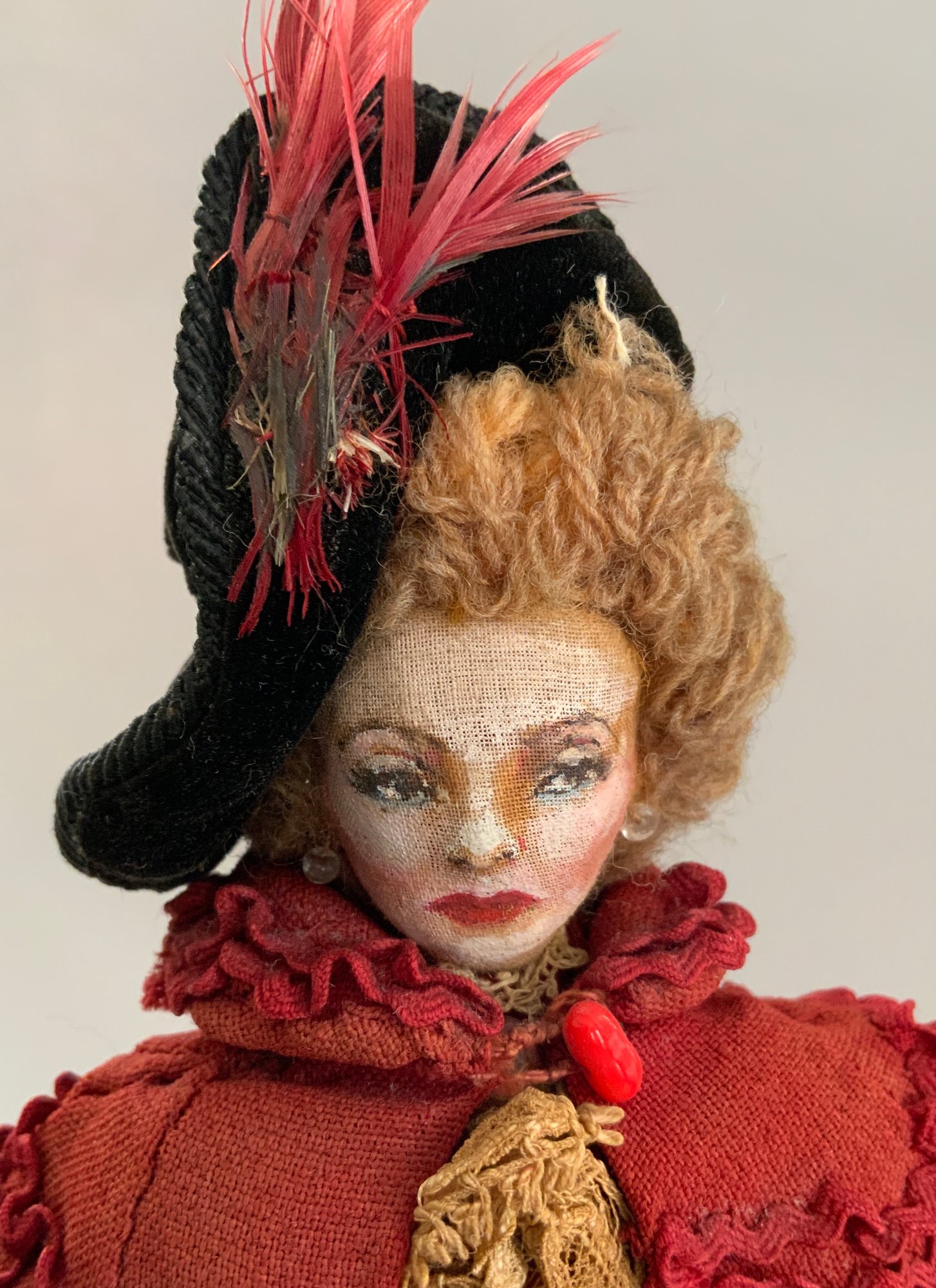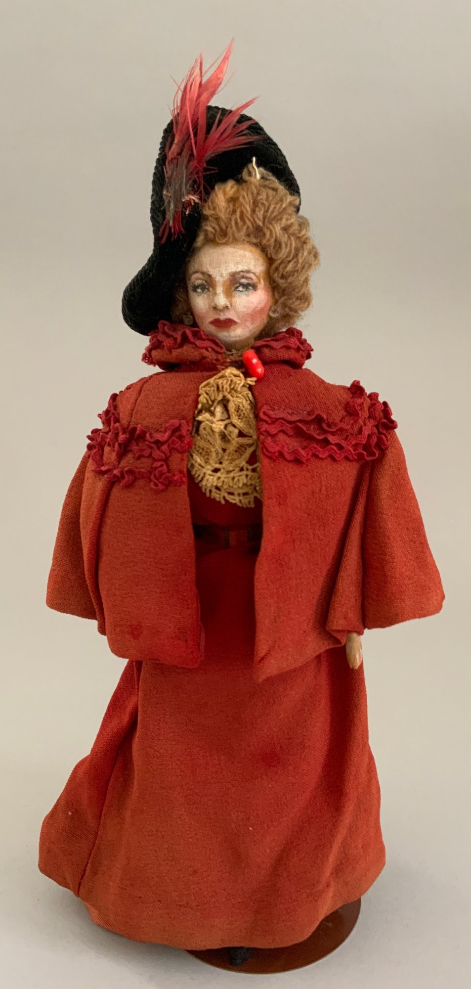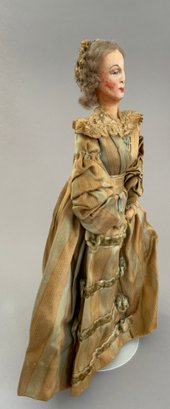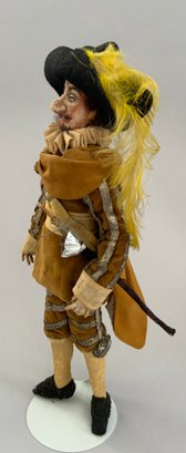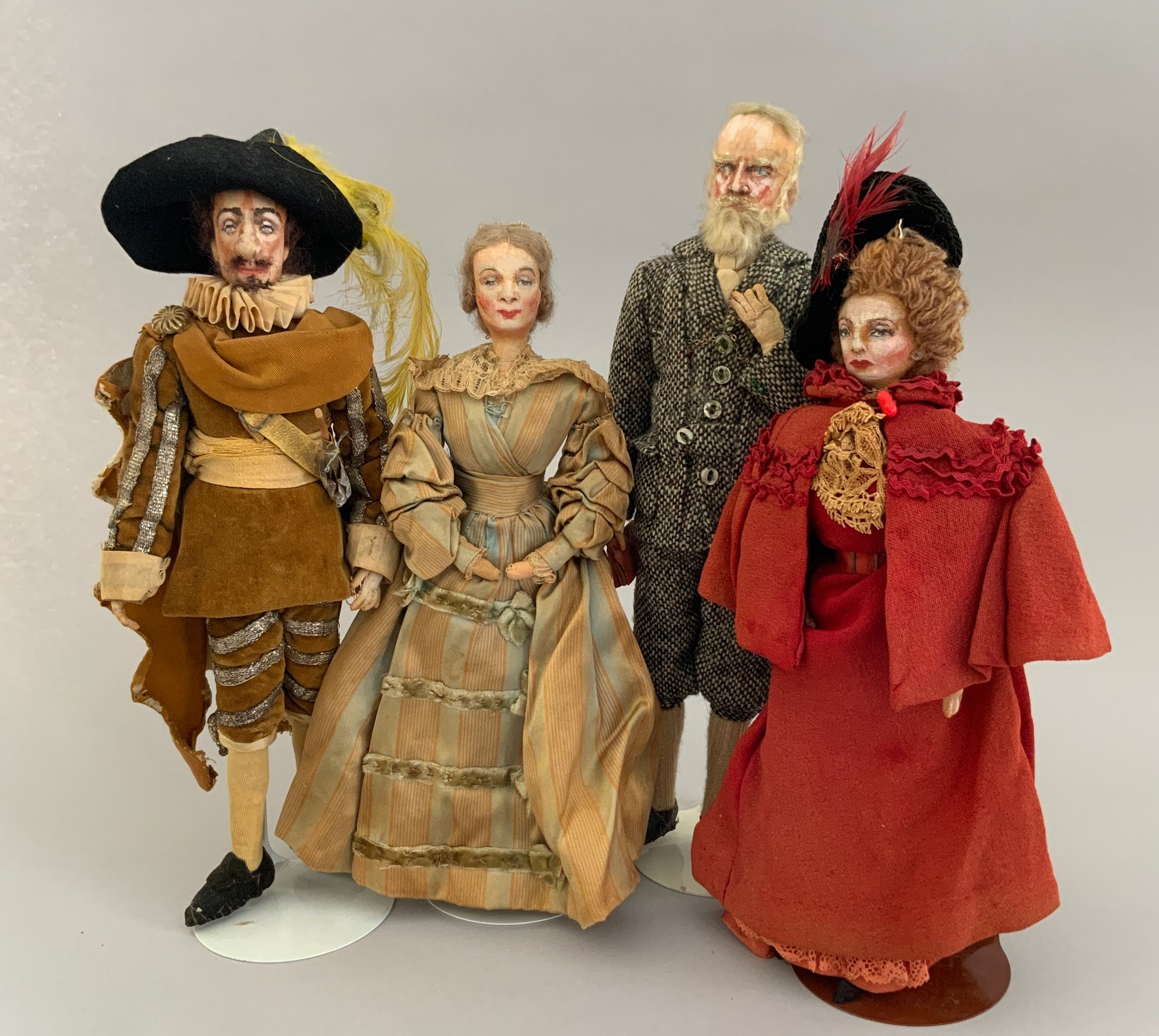 4 – Mary Green artist dolls, 2 - 10” women & 2 - 10” men, sculpted cloth, painted features, women in red cape dress & striped silk dress, men are George Bernard Shaw & Cyrano de Bergerac, (rubs & light wear)