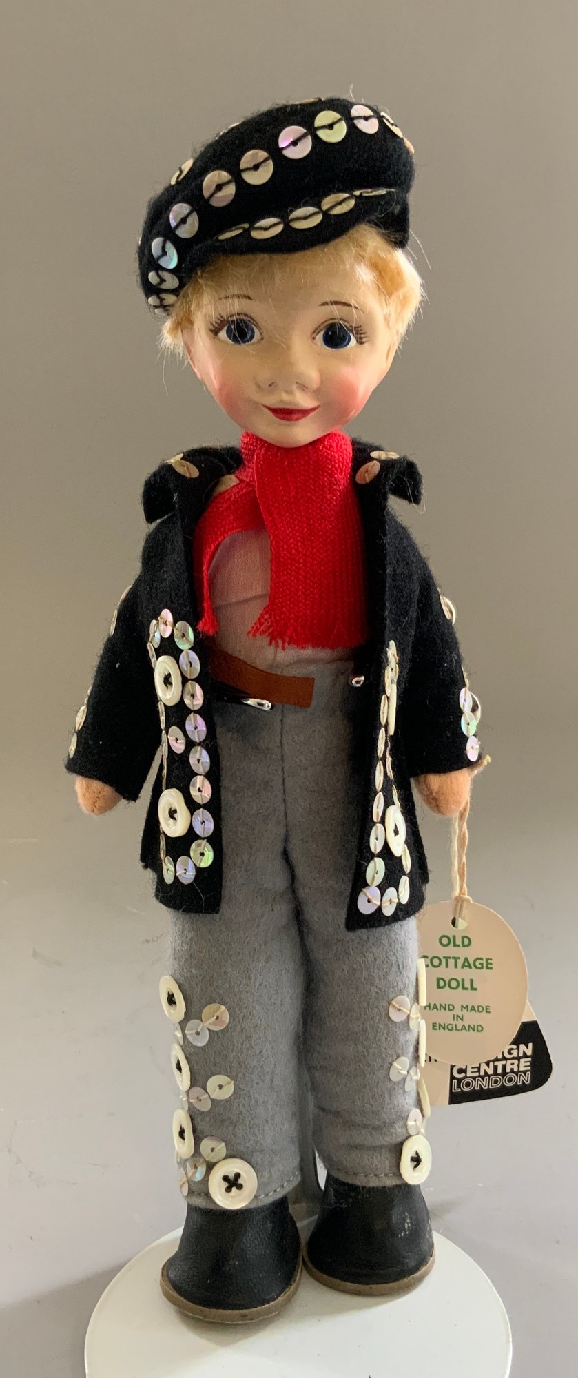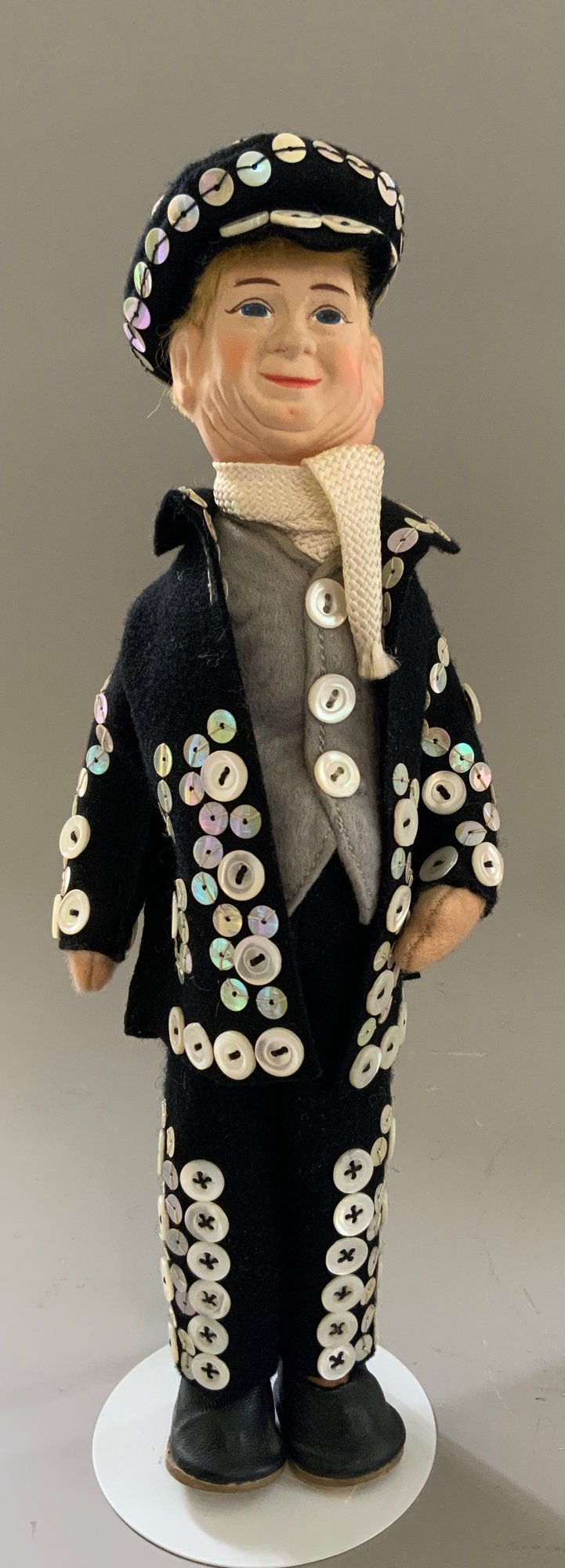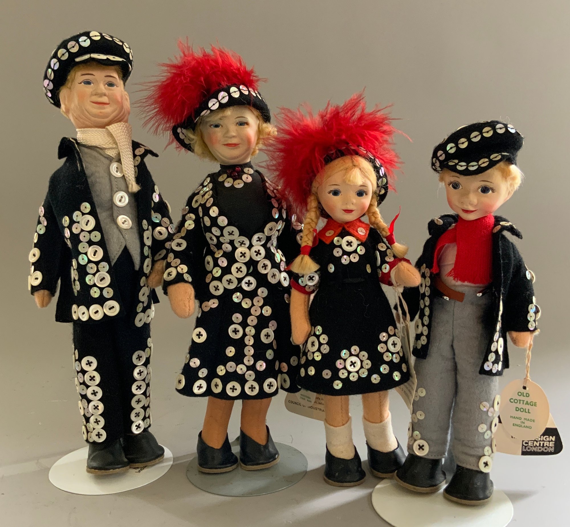 4 – Old English Cottage Dolls replicate English Pearlies from the 1900’s, 2 – 10” tall, 2 – 7 ½” tall, 3 with original tag 3/14/56? on one, very good condition