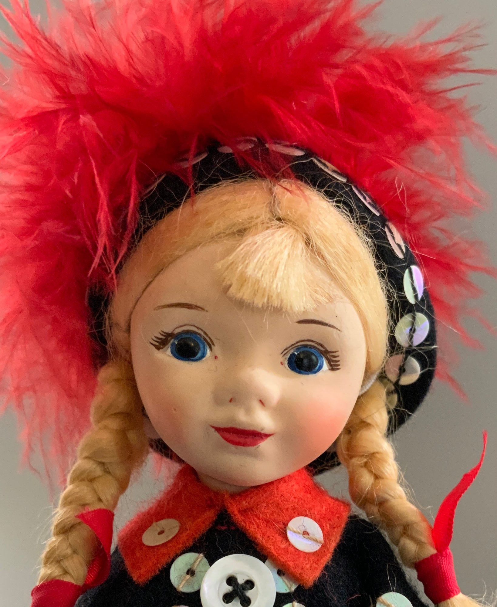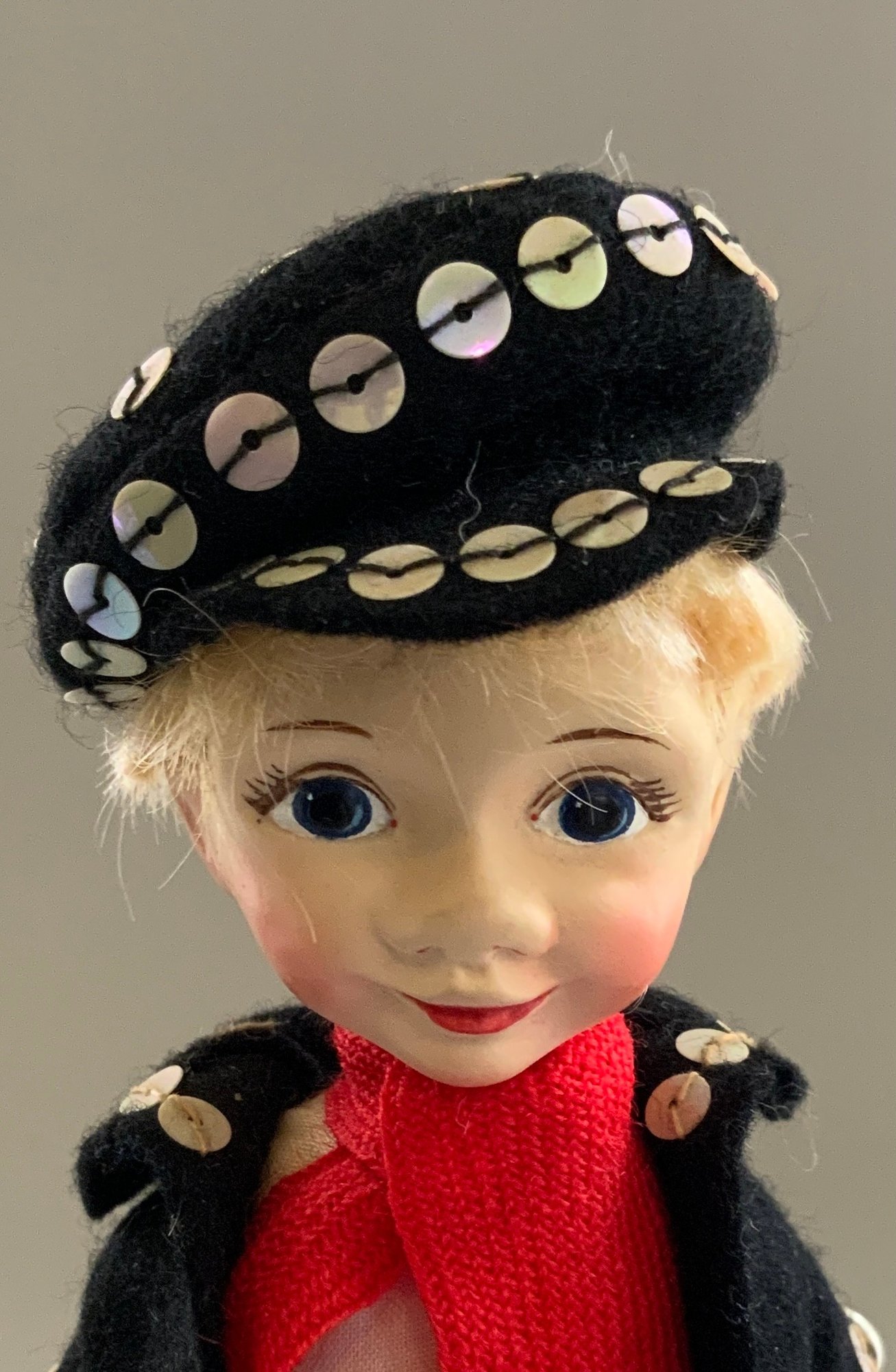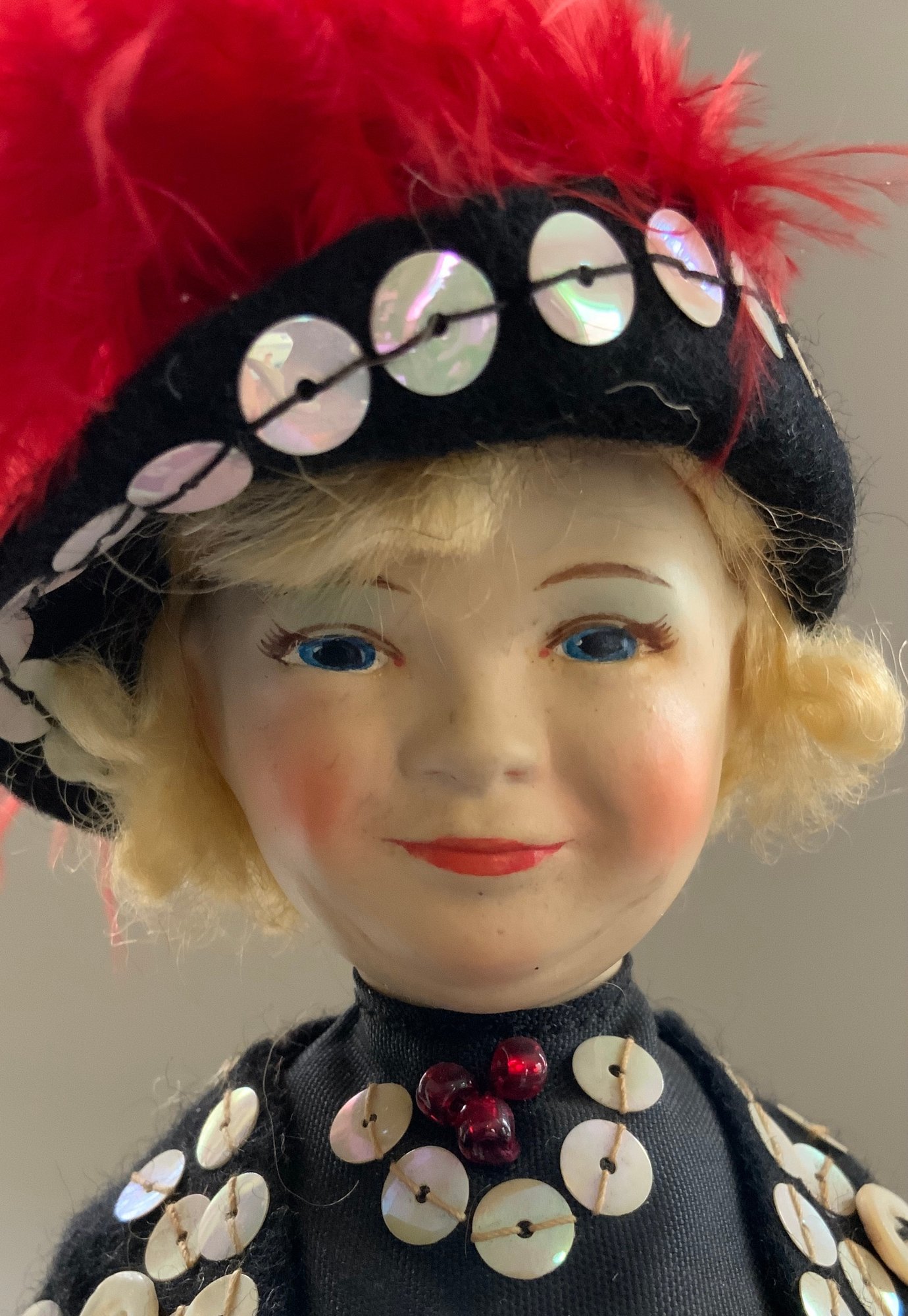 4 – Old English Cottage Dolls replicate English Pearlies from the 1900’s, 2 – 10” tall, 2 – 7 ½” tall, 3 with original tag 3/14/56? on one, very good condition