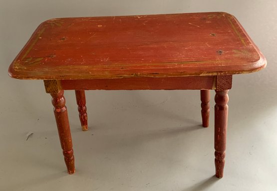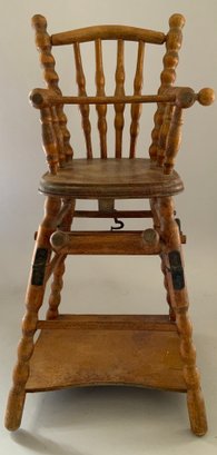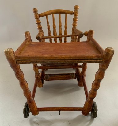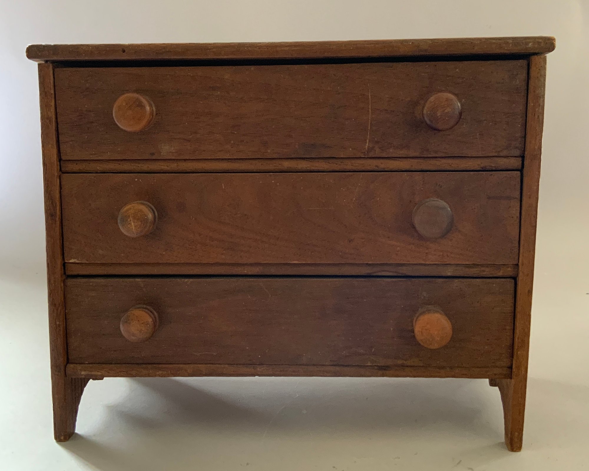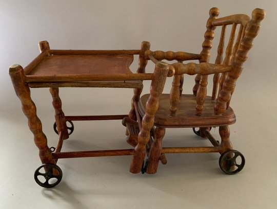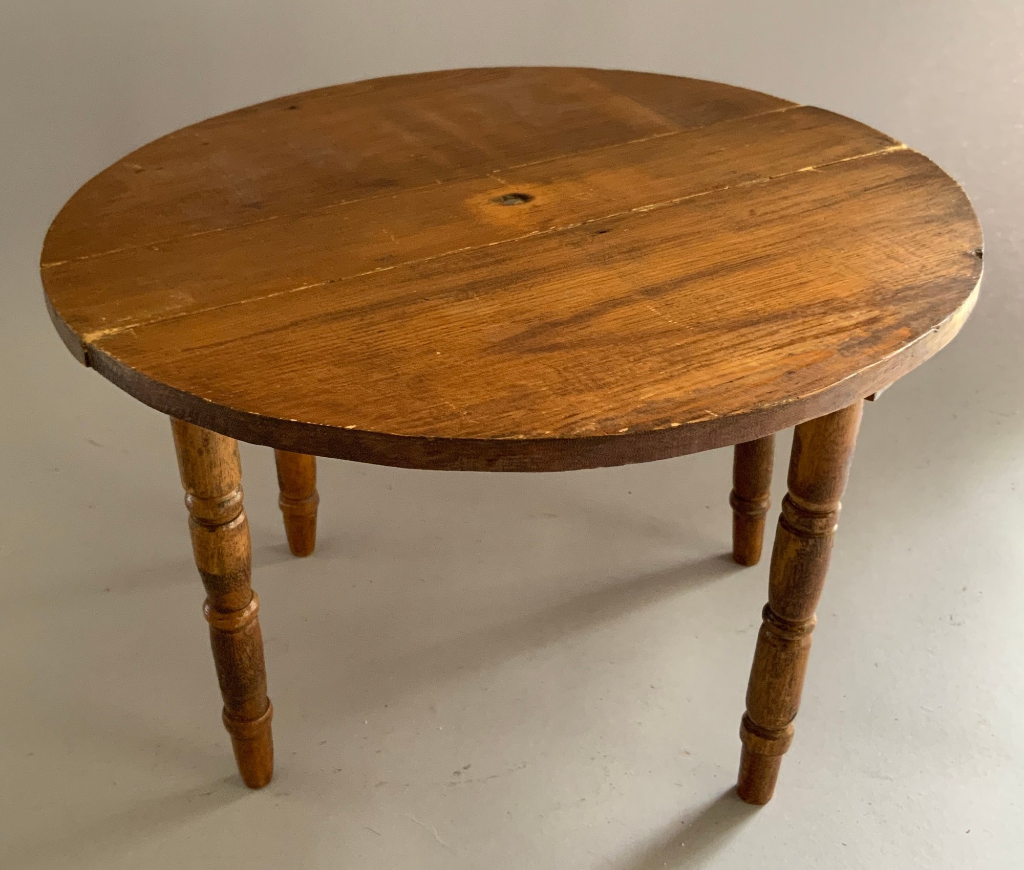 4 Pcs. of asst. Doll’s furniture (apx. 9” Tall): 4-leged Table, round D/L Table, 3-Drawer oak chest w/ knobs & Convertible baby play table