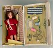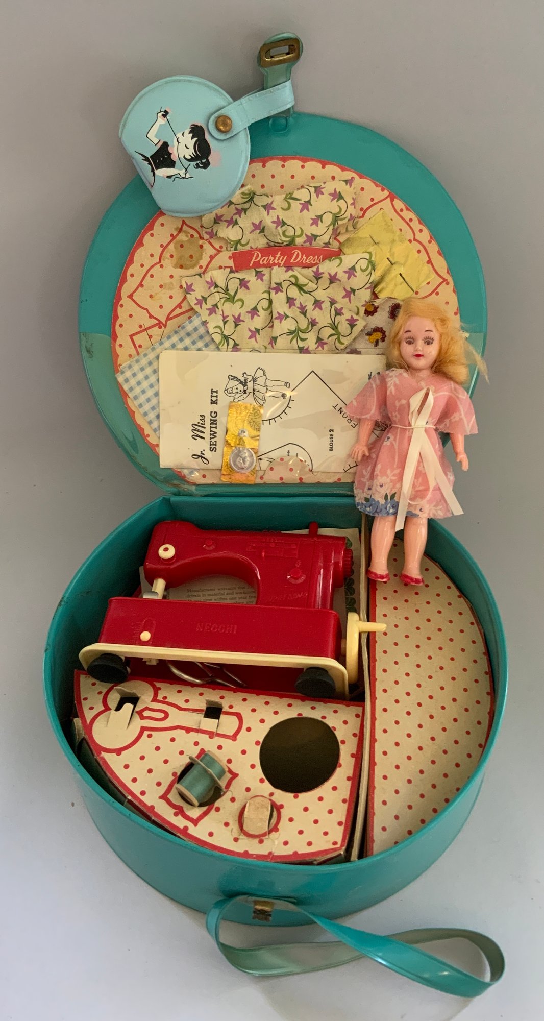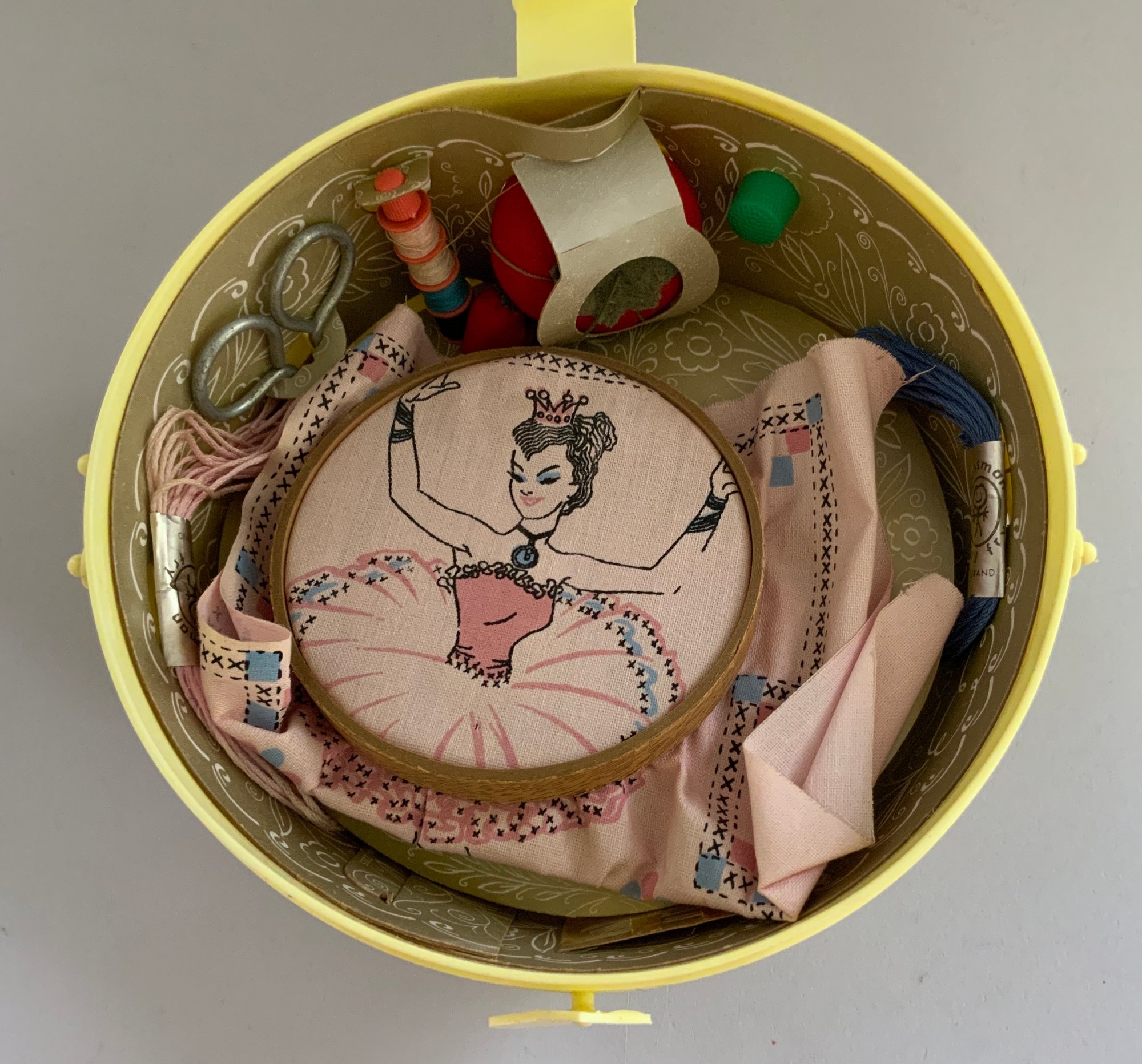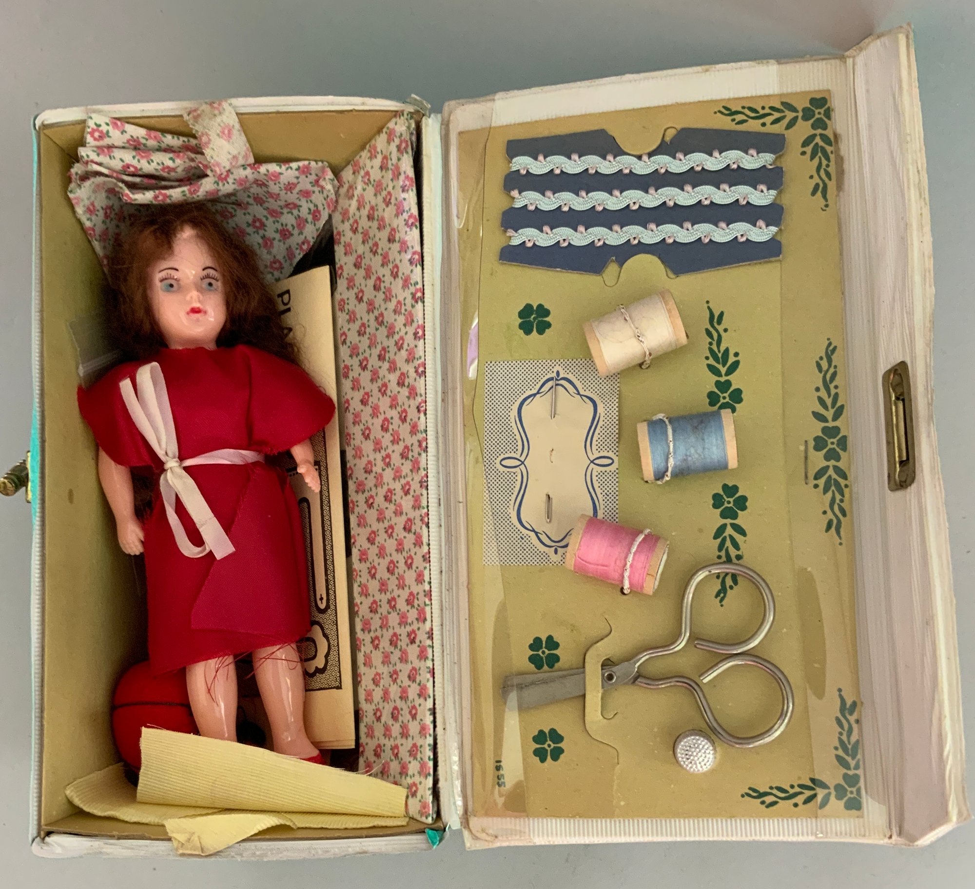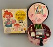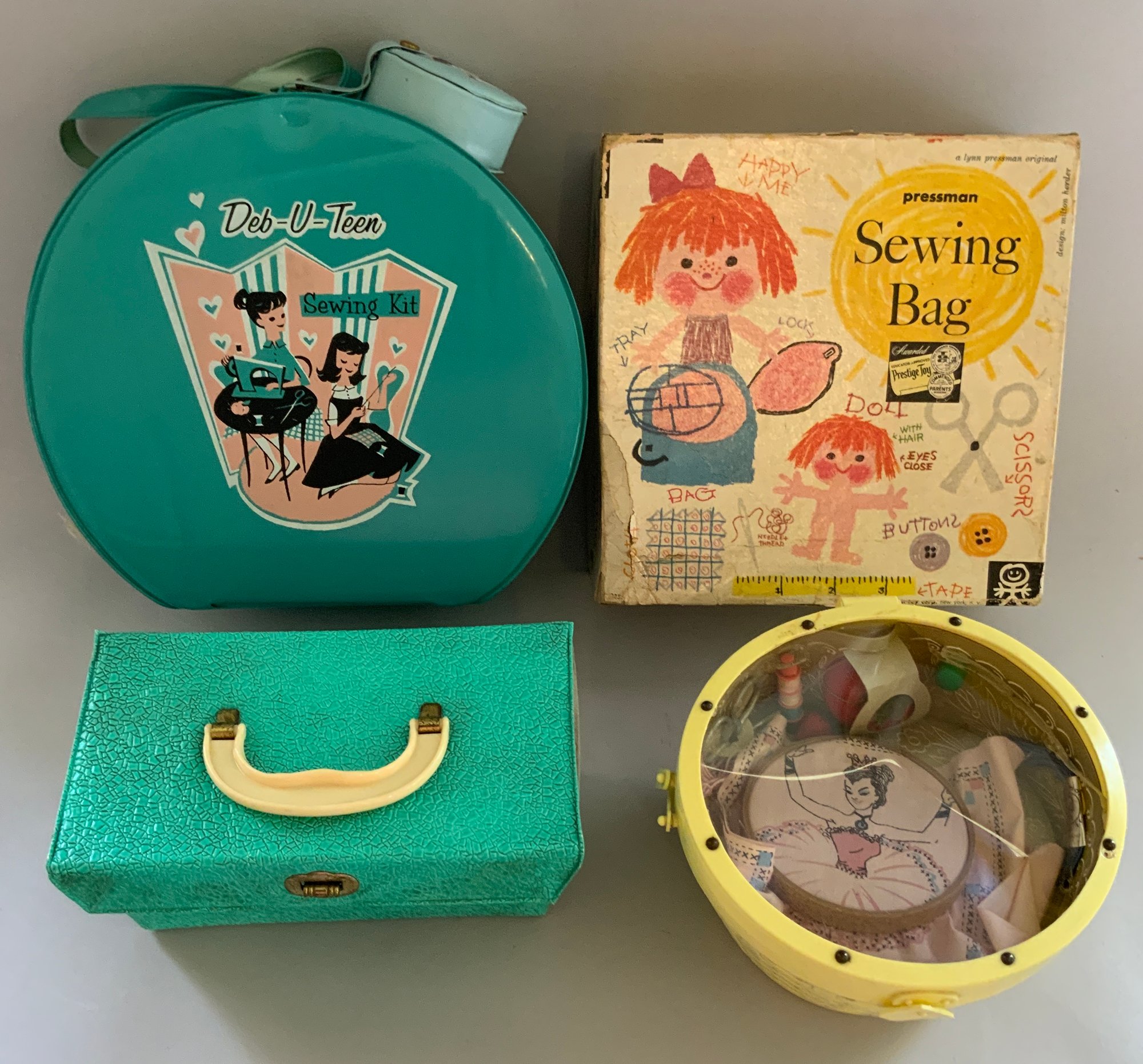 4 – Sewing Sets, Pressman Sewing Bag, Yellow Basket Embroidery Set, Deluxe Sewing Basket #1555 Hassenfeld 1956, Deb-U-Turn Sewing Kit #1546 Hassenfeld 1960