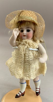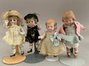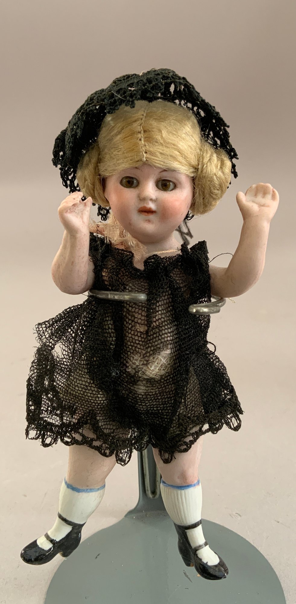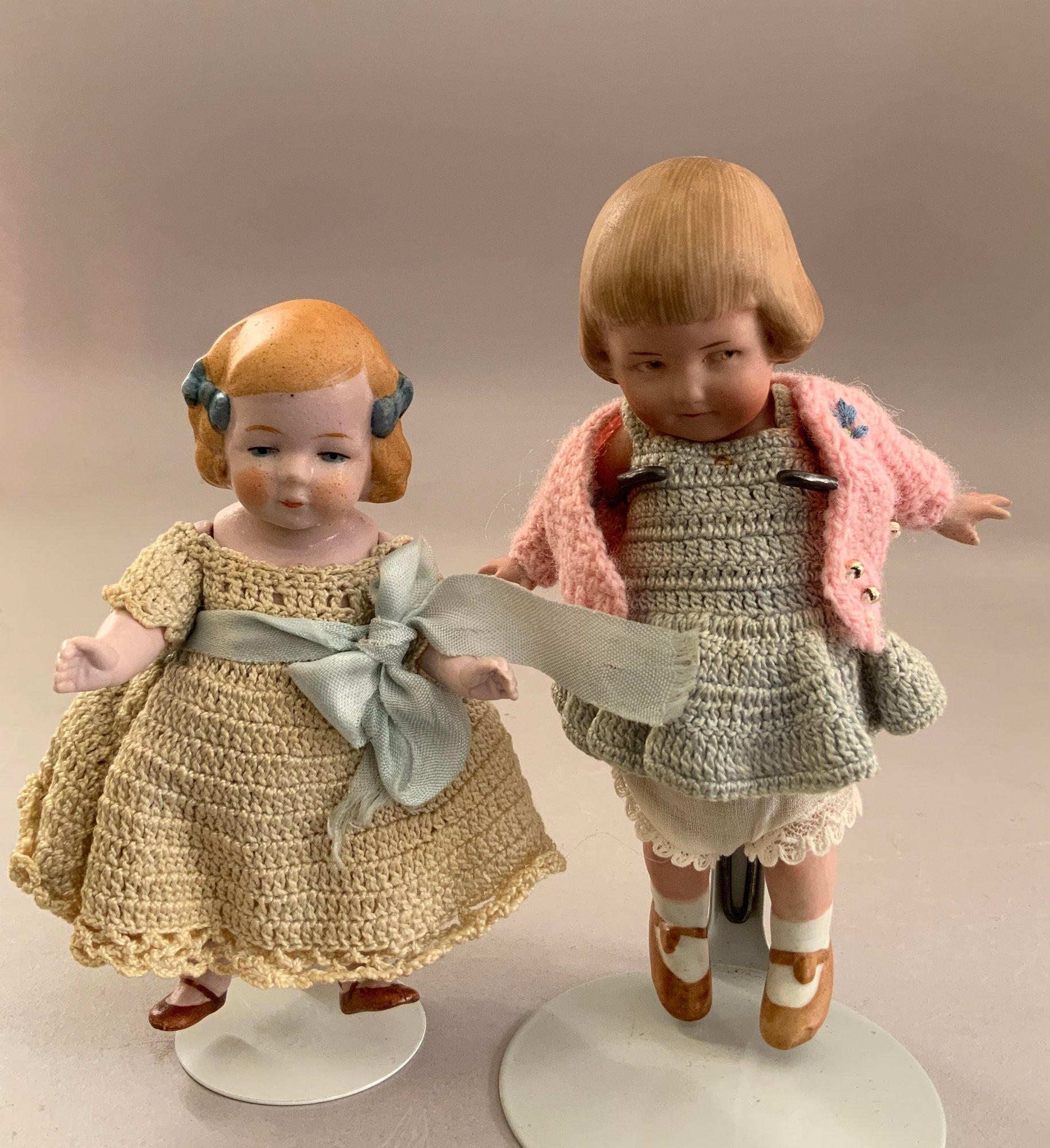 4 – Small all bisque dolls, 1 – 5 ½” incised 4, blue glass sleep eyes, CM, blonde mohair wig, knit outfit, 1 – 5” brown glass eyes, CM, blonde mohair wig, black lace outfit, 1 – 6” Heubach, painted features knit outfit, & 1 – 5” Heubach, painted features, knit outfit