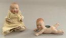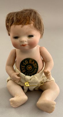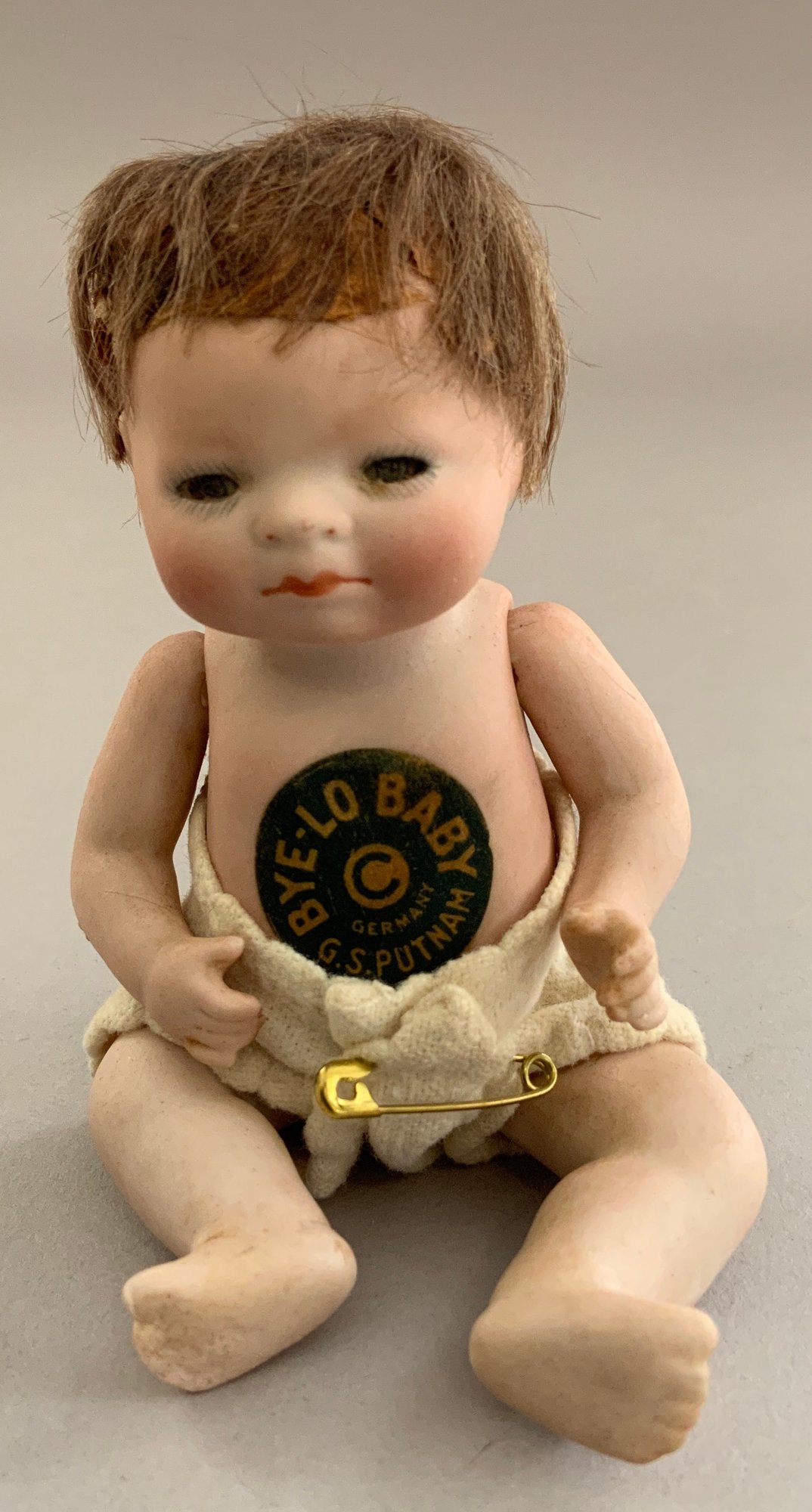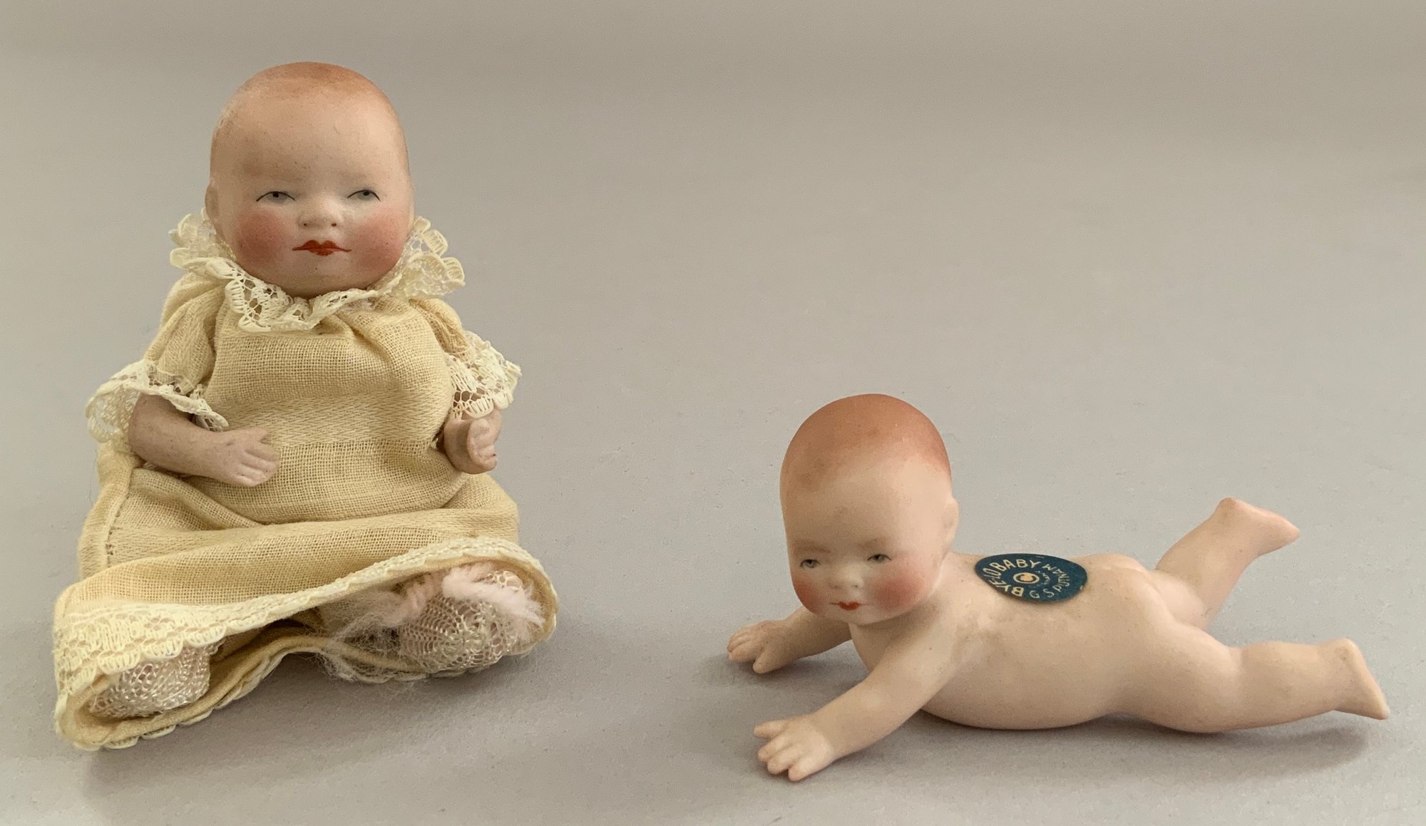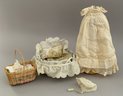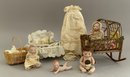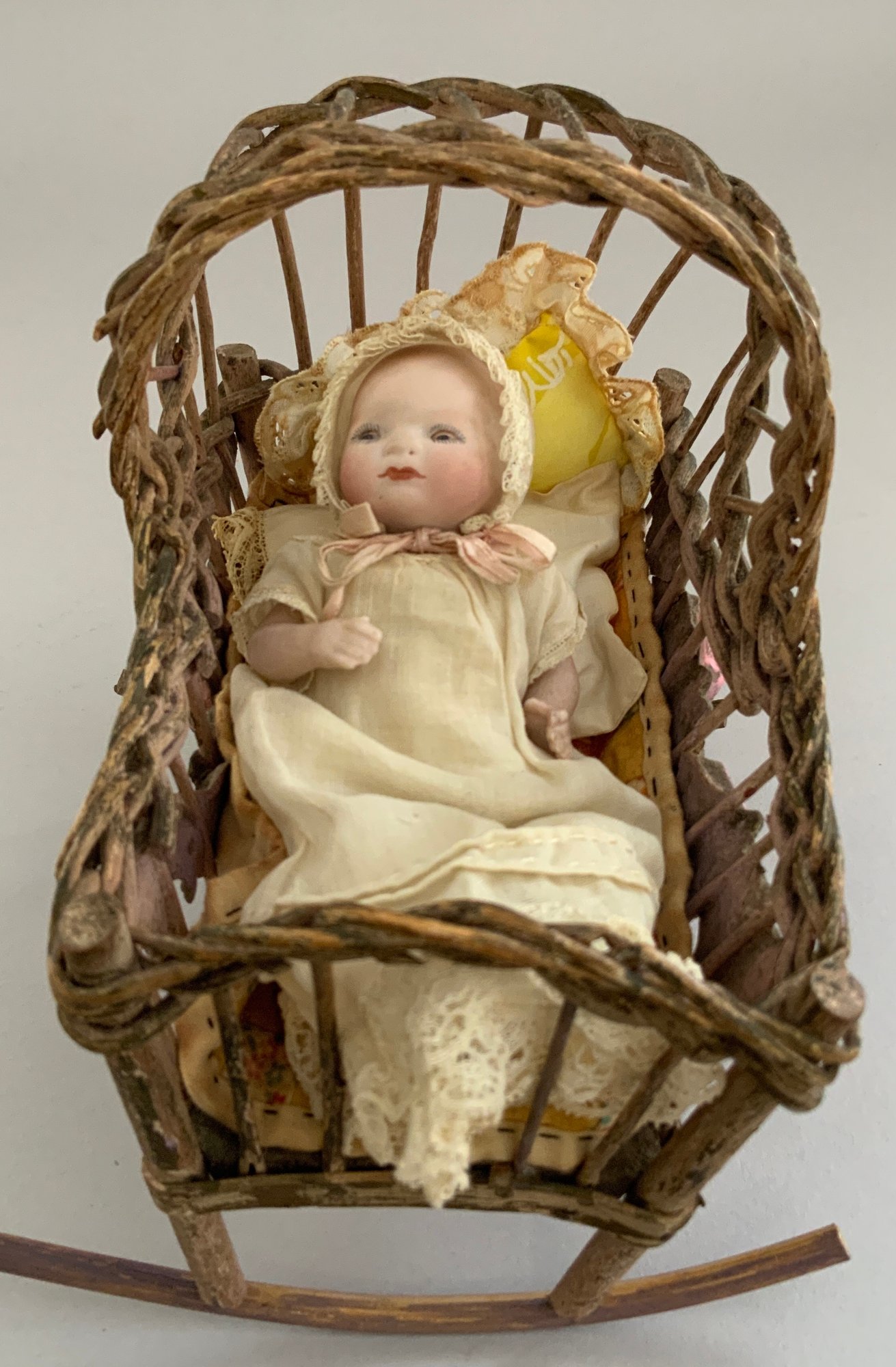 4 – Small Grace S Putnam Bye-Lo baby dolls, 3” – 4 ½” long, 1 with mohair wig, 1 – laying down with paper label, 1 – in wicker basket, 1 – in twig cradle