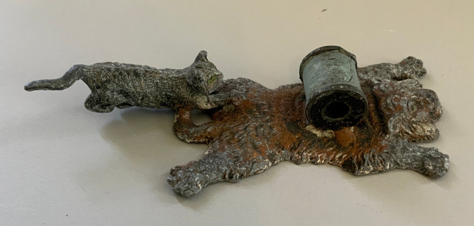 4 - Small Vienna bronze cold painted figures, 1 – 2 ½” cat in row boat with paddle, 1 – 1 7/8” tall cat with top hat, 1 – 3 ½” long cat on bear skin, & 1 – 1 ¾” fox hunter holding a fox with 2 dogs, (all have age wear)