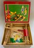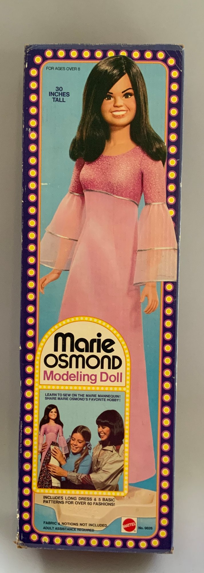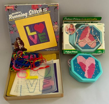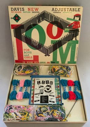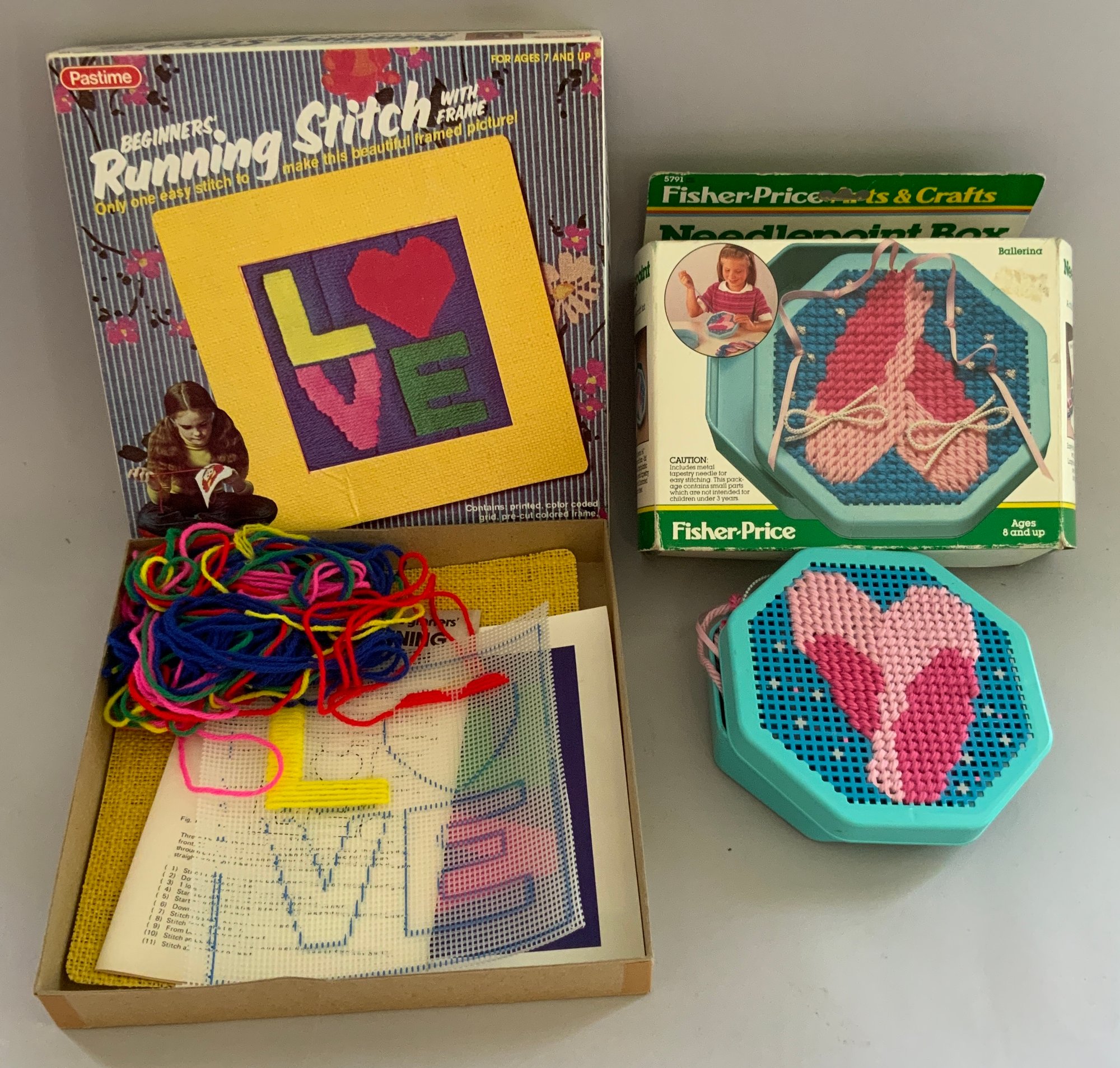 4 – Weaving Sets & 1 Doll, Pastime Beginner’s Running Stitch, Fisher Price Needlepoint Box, Davis New Adjustable Loom for Boys and Girls #602, K W Weaving Loom F A O Schwartz catalog 1955, & 30” Marie Osmond Modeling Doll, Mattel 1976