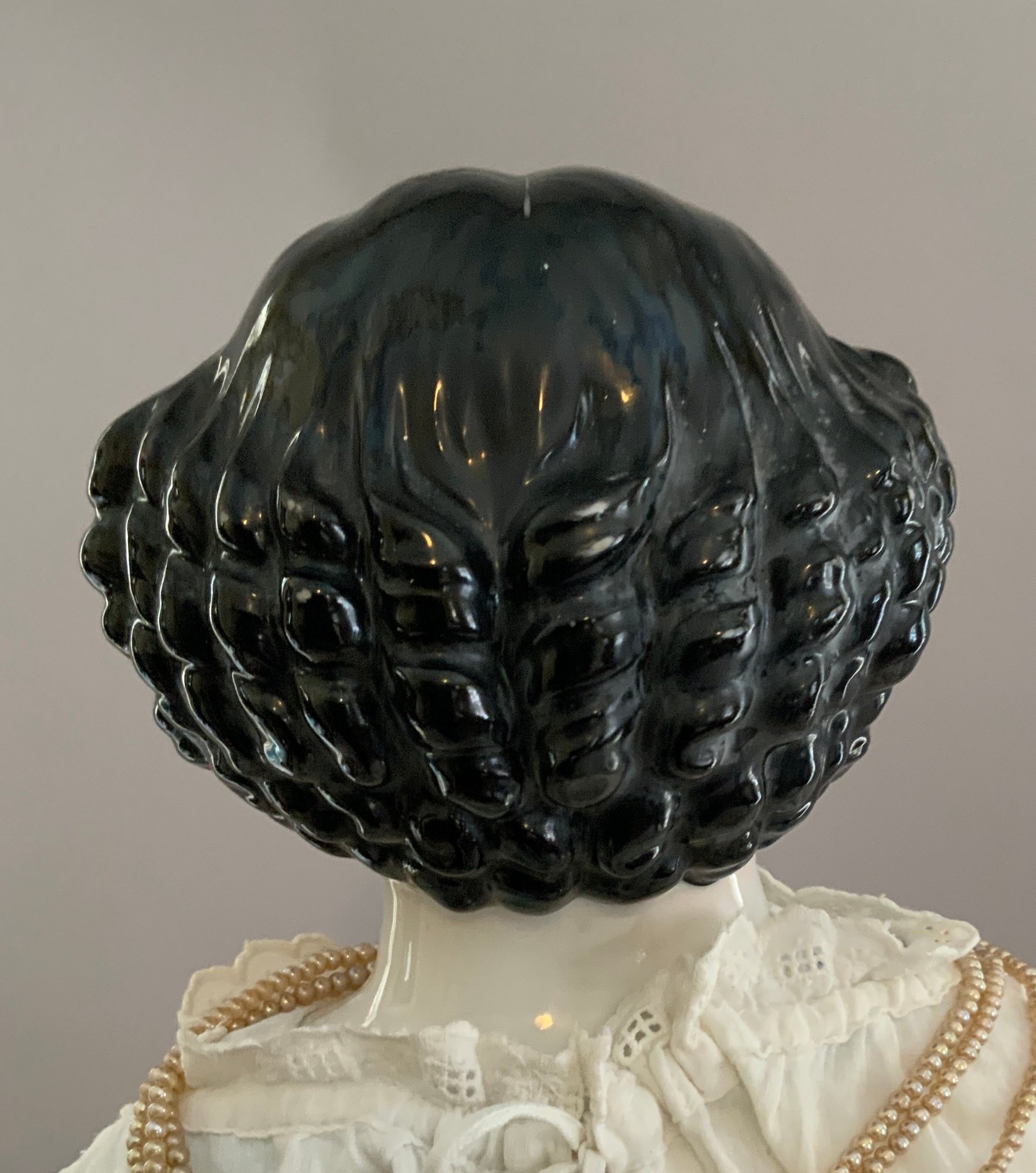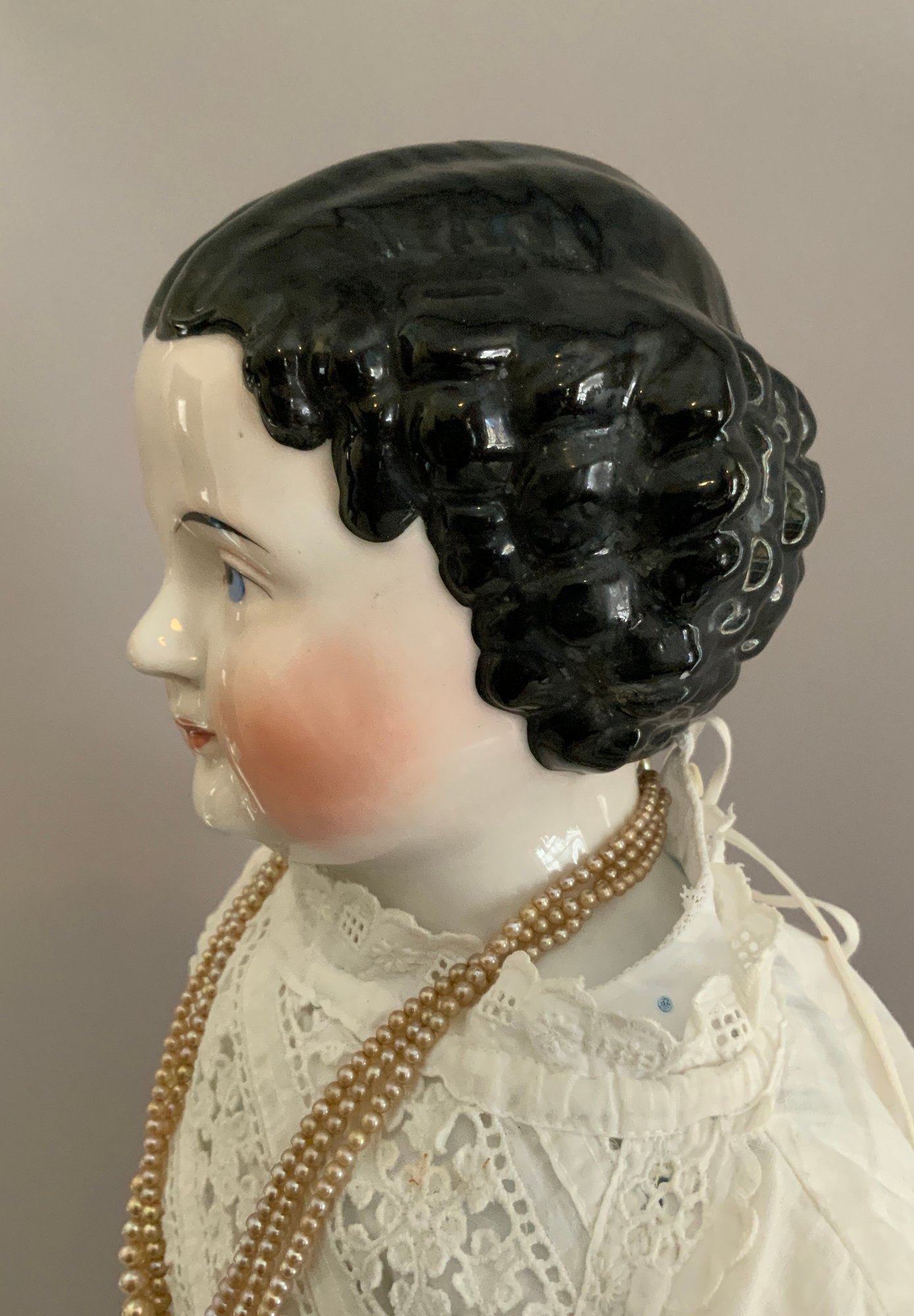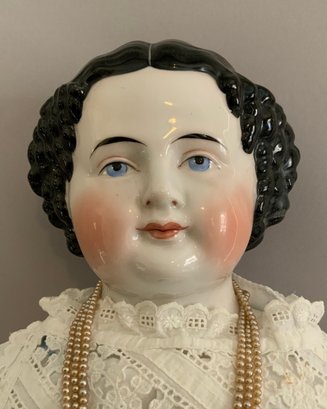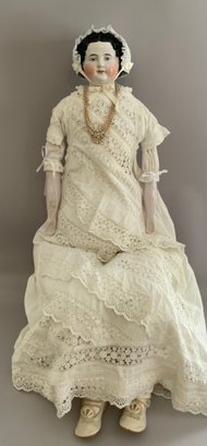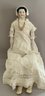 42” Black hair china, center part sculpted hair, painted features, cloth body with china limbs, long white dress