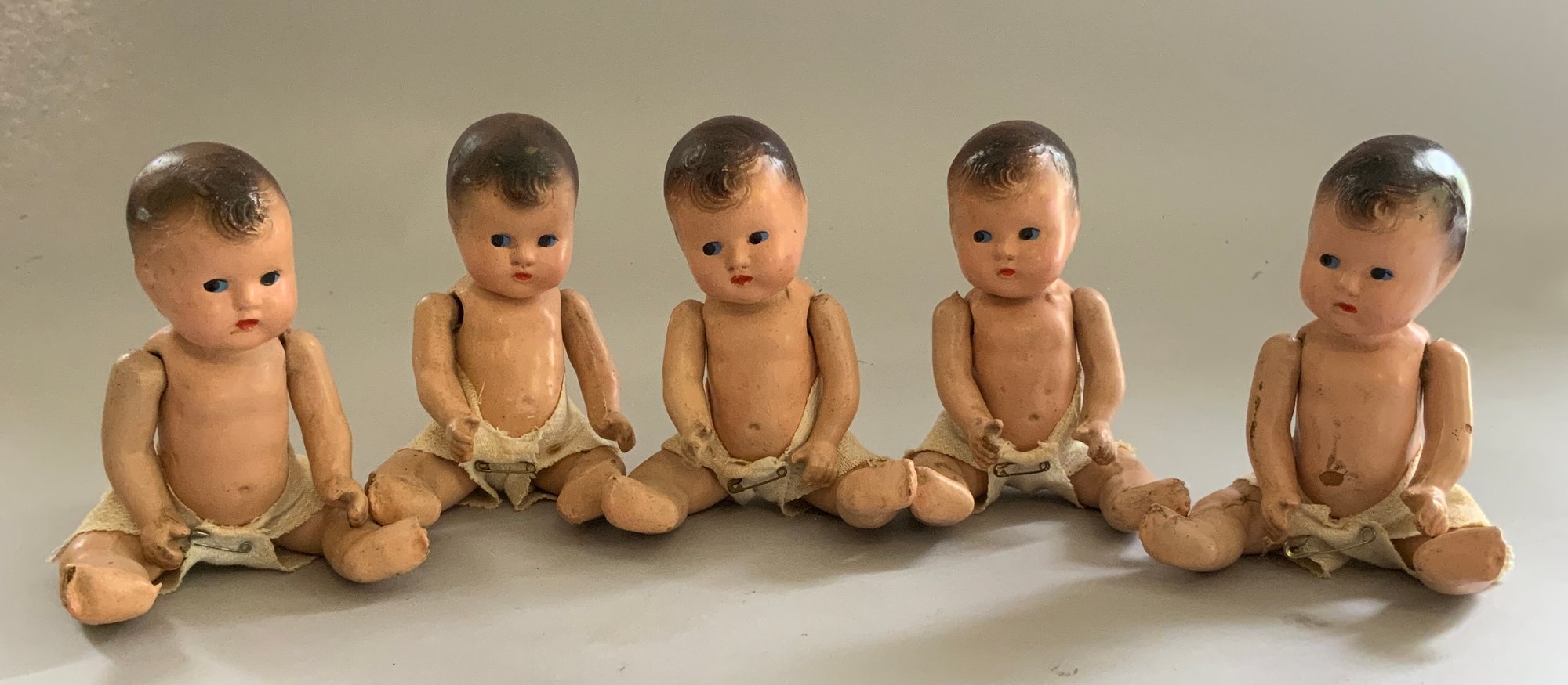 5 – 6” Dionne Quints composition dolls, unmarked, painted features, (rubs, chips)