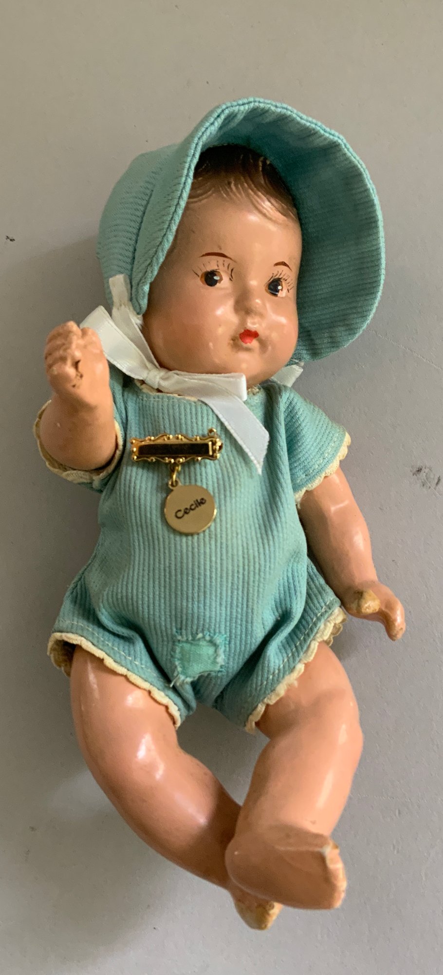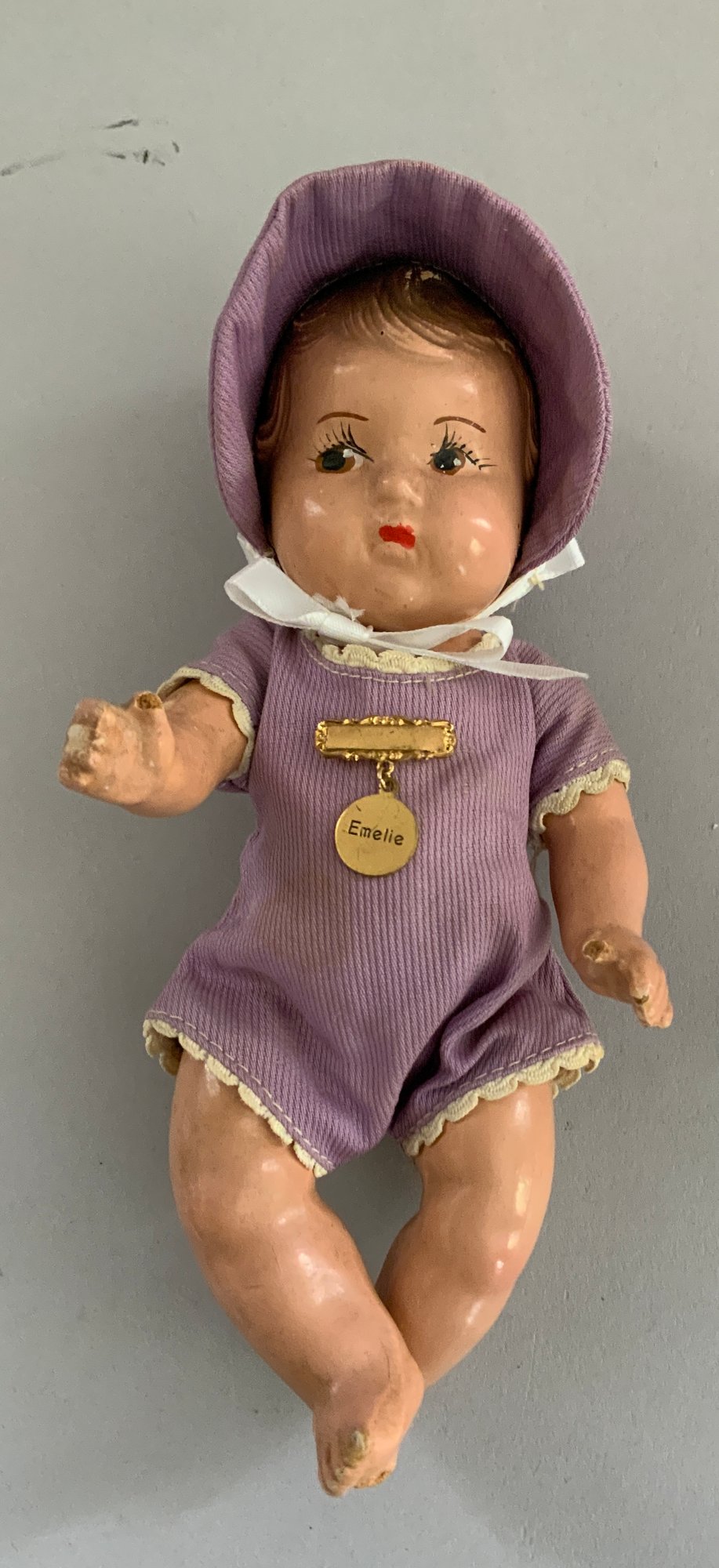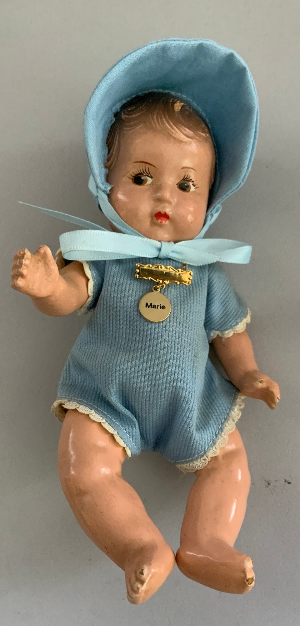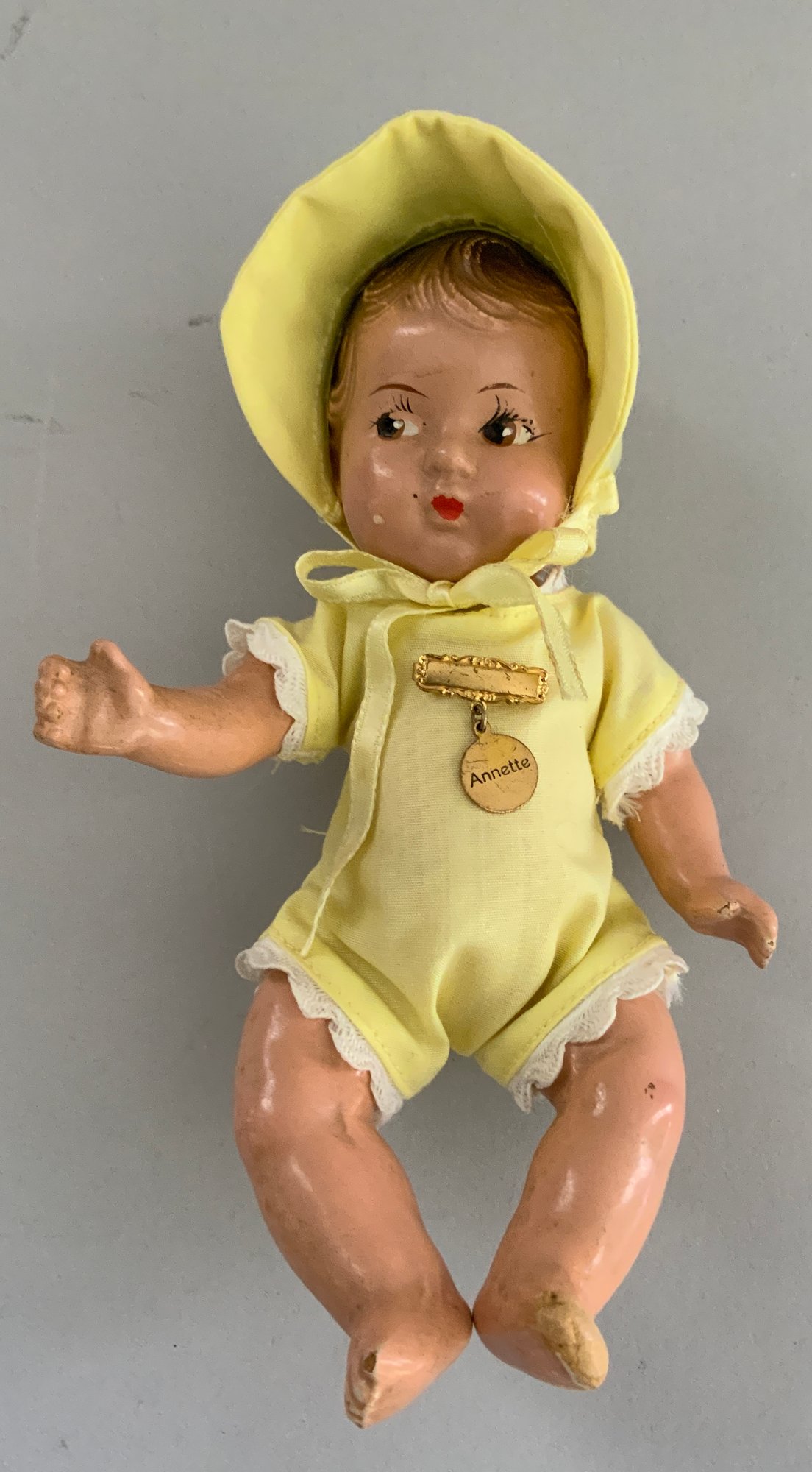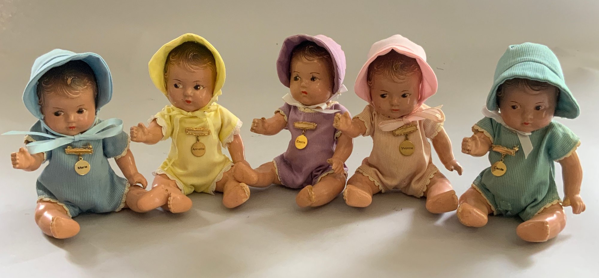 5 – 7” Dionne Quint composition dolls, marked Alexander, painted features, original name tags, Cecile has a left thumb repair, very minor rubs