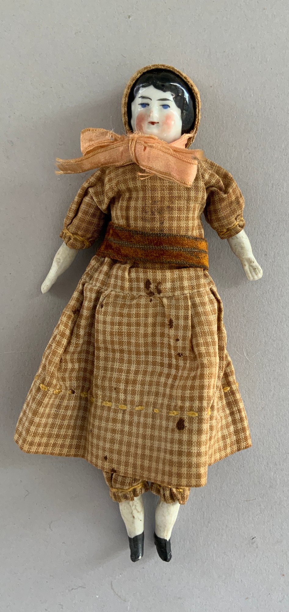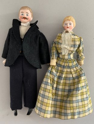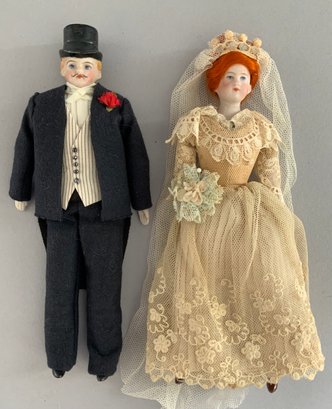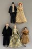 5 Doll House dolls, 6 ½” – 7 ½” tall, 4 bisque head, 1 china head, 2 – couples & 1 woman, bride & groom & various outfits, china head has spots on dress