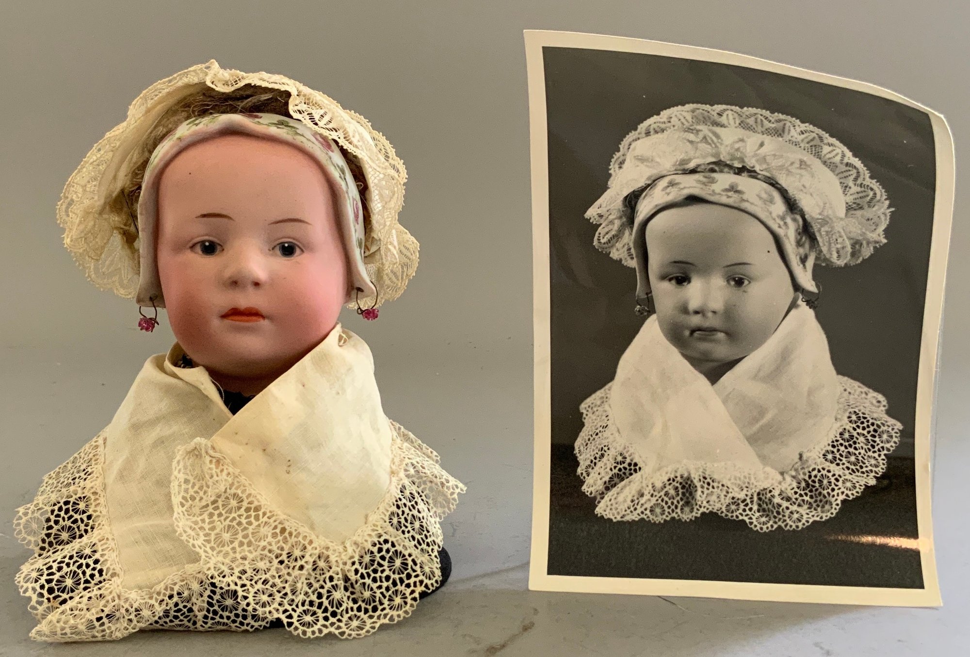 5” Heubach Baby Stewart Bonnet-Head, “half doll” (head only, no body), (pincushion doll perhaps?) painted blue, intaglio eyes, molded bonnet is attached, but cut out at the crown & stuffed, Heubach square mark, (#8326? Number not found), shoulder head on stuffed cardboard base covered with black cloth, marked Germany, painted features, lace- trimmed white shawl & head wrap