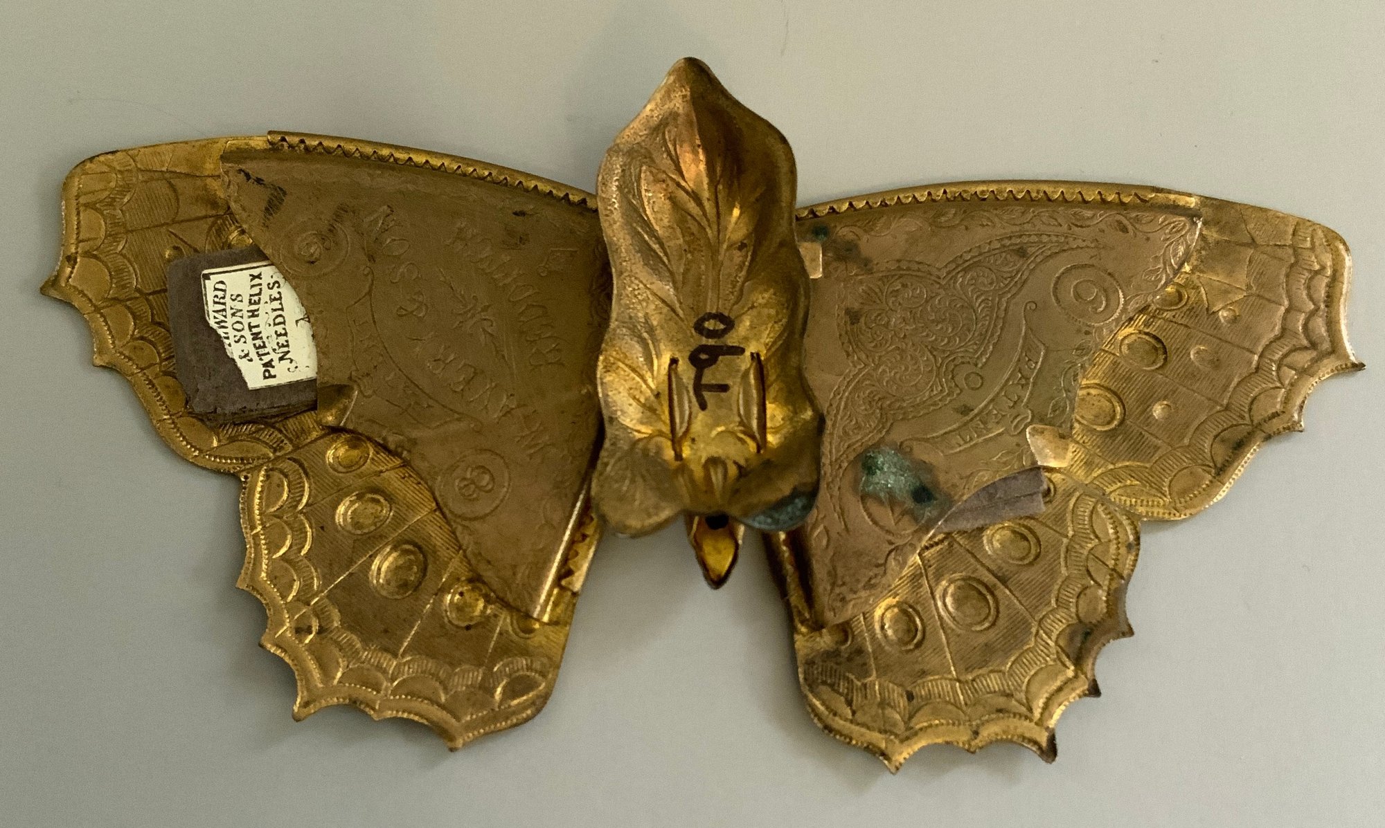5” Long Victorian novelty brass needle case in the form of a butterfly Marked "W Avery & Son Redditch" under one of the wings. Still contains 2 packets of Avery needles, few dark spots (broken antennas ?)