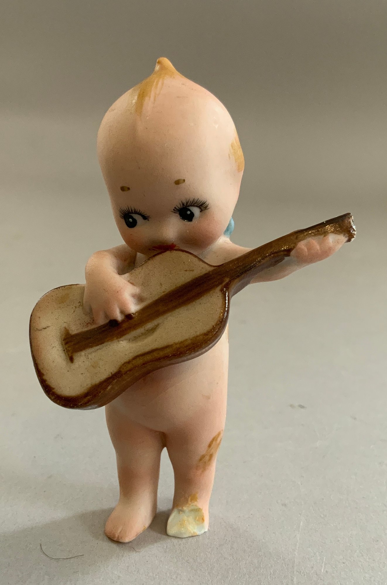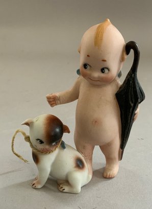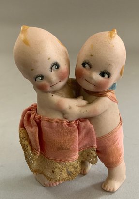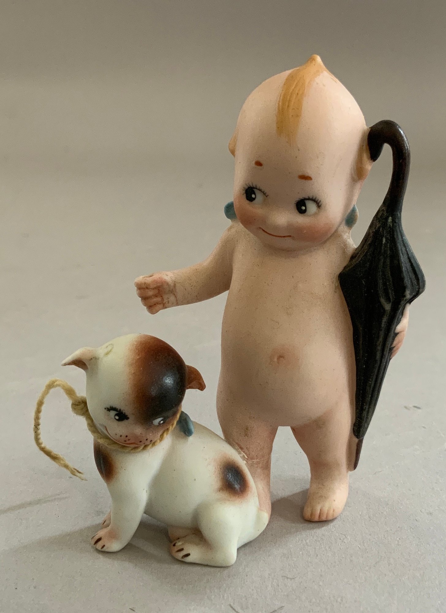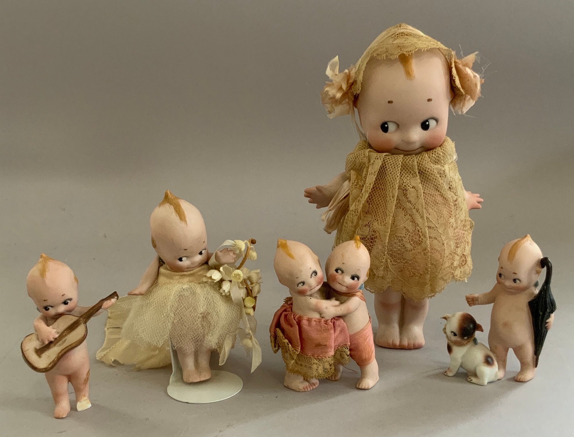 5 – Rose O’Neil Kewpie bisque figures, 1 – 8” Googly in lace dress, 1 – 3 ½” Doodle dog & boy with umbrella, 1 – 4 ¼” wedding, 1 – 4” twins, & 1 – 3 ¼” ukulele strumming (broken left foot)