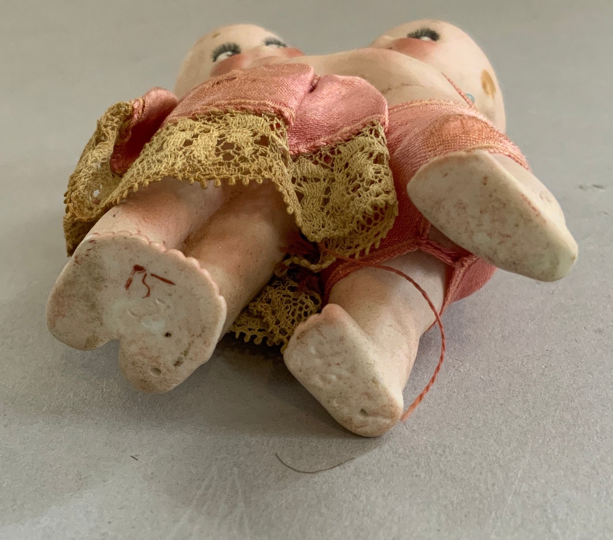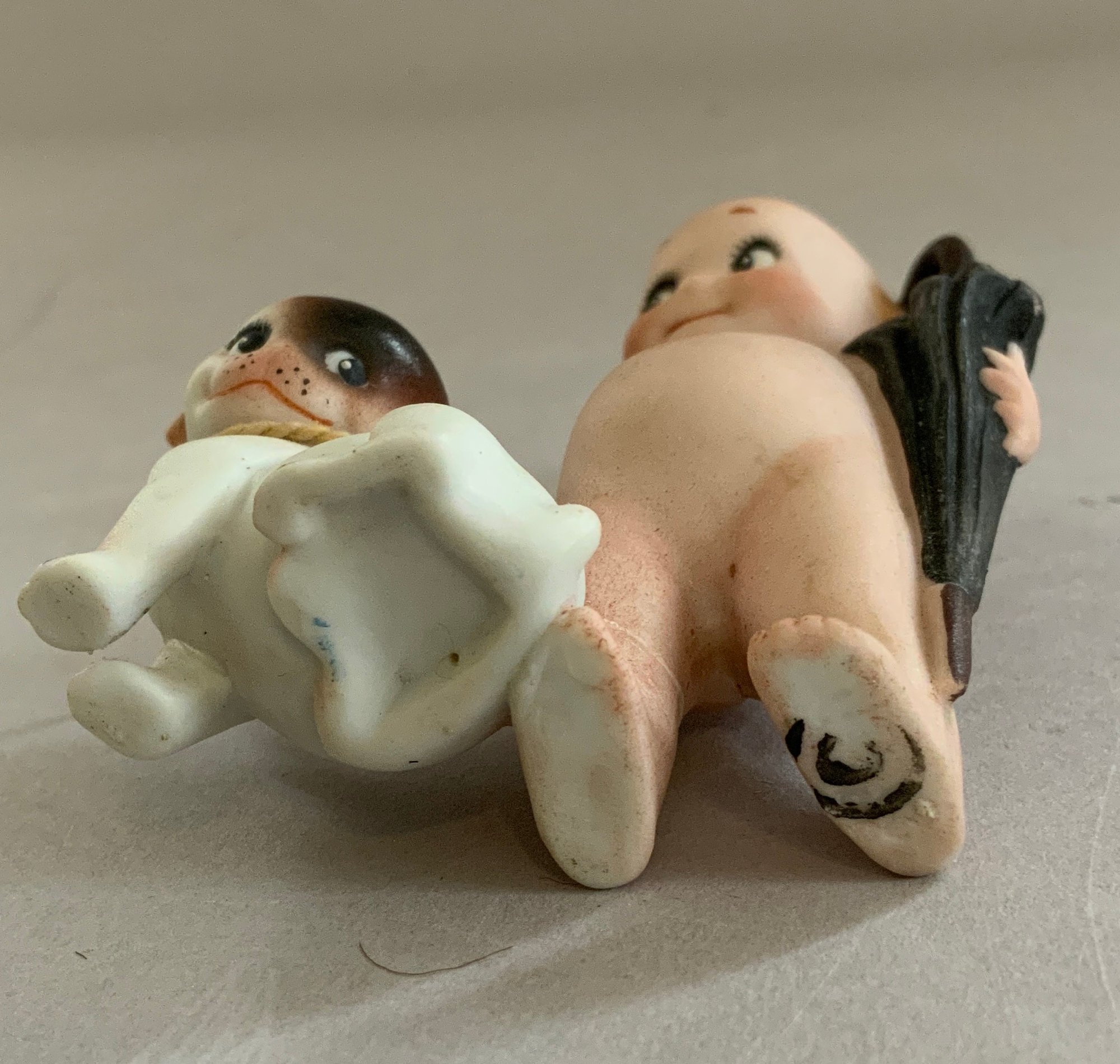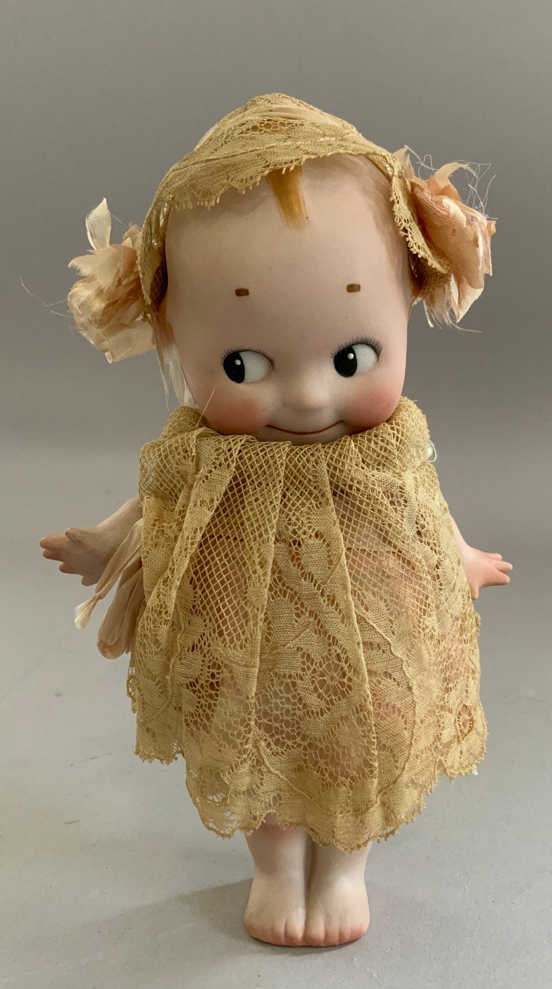 5 – Rose O’Neil Kewpie bisque figures, 1 – 8” Googly in lace dress, 1 – 3 ½” Doodle dog & boy with umbrella, 1 – 4 ¼” wedding, 1 – 4” twins, & 1 – 3 ¼” ukulele strumming (broken left foot)