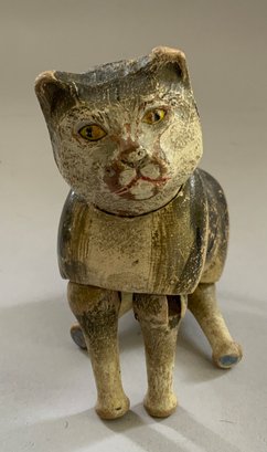5 ½” Schoenhut wood cat, painted features, moveable head, leather tail, carved ears, (rubs & wear)