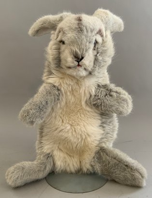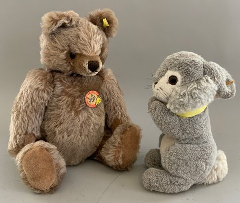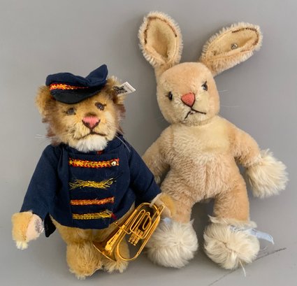 5 – Steiff animals, 18” Jolly Hase rabbit hand puppet, silver button in ear, 7” Lion with trombone in blue, tag & button, 14” brown mohair bear with tag & button, 9” gray rabbit with button, & 11” blonde standing rabbit, all good condition