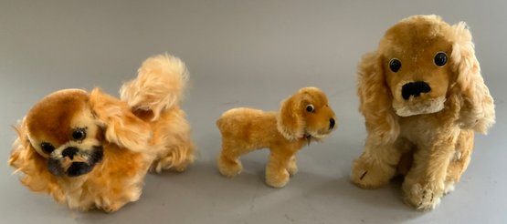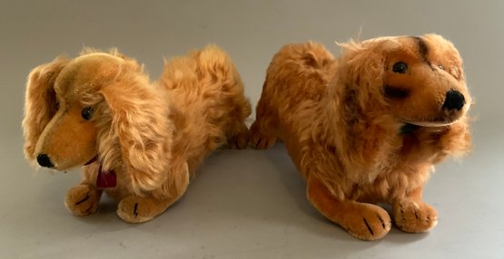 5 – Steiff dogs, 2 – 14” long Dachshund’s Waldi type, buttons in ear, red hair, 7” seated spaniel, no button, gold, 5 ½” standing Spaniel button & tag, gold, & 4 ½” standing Spaniel button & tag, gold, all overall good condition