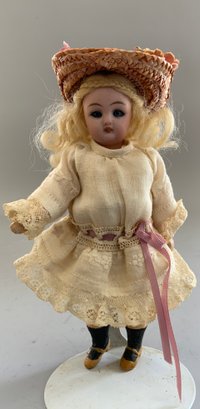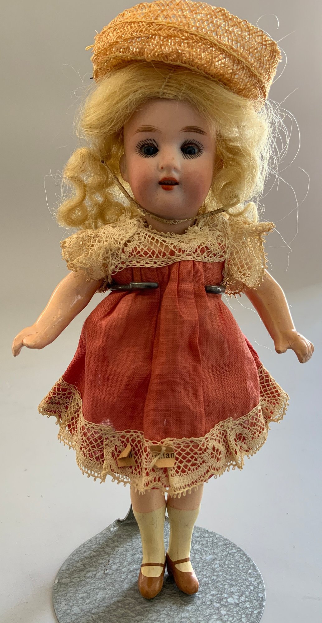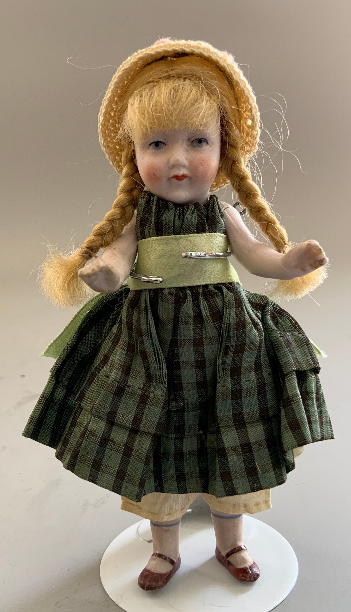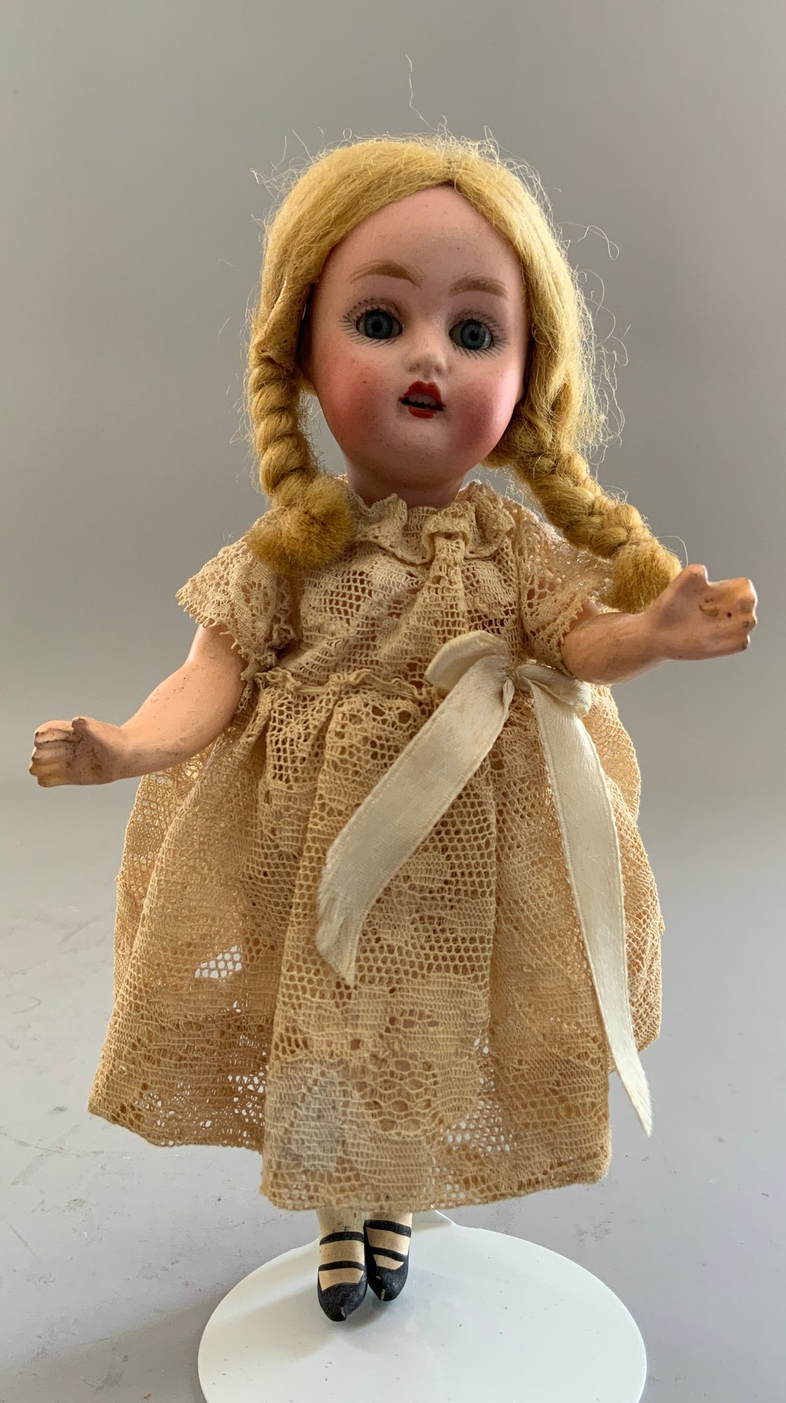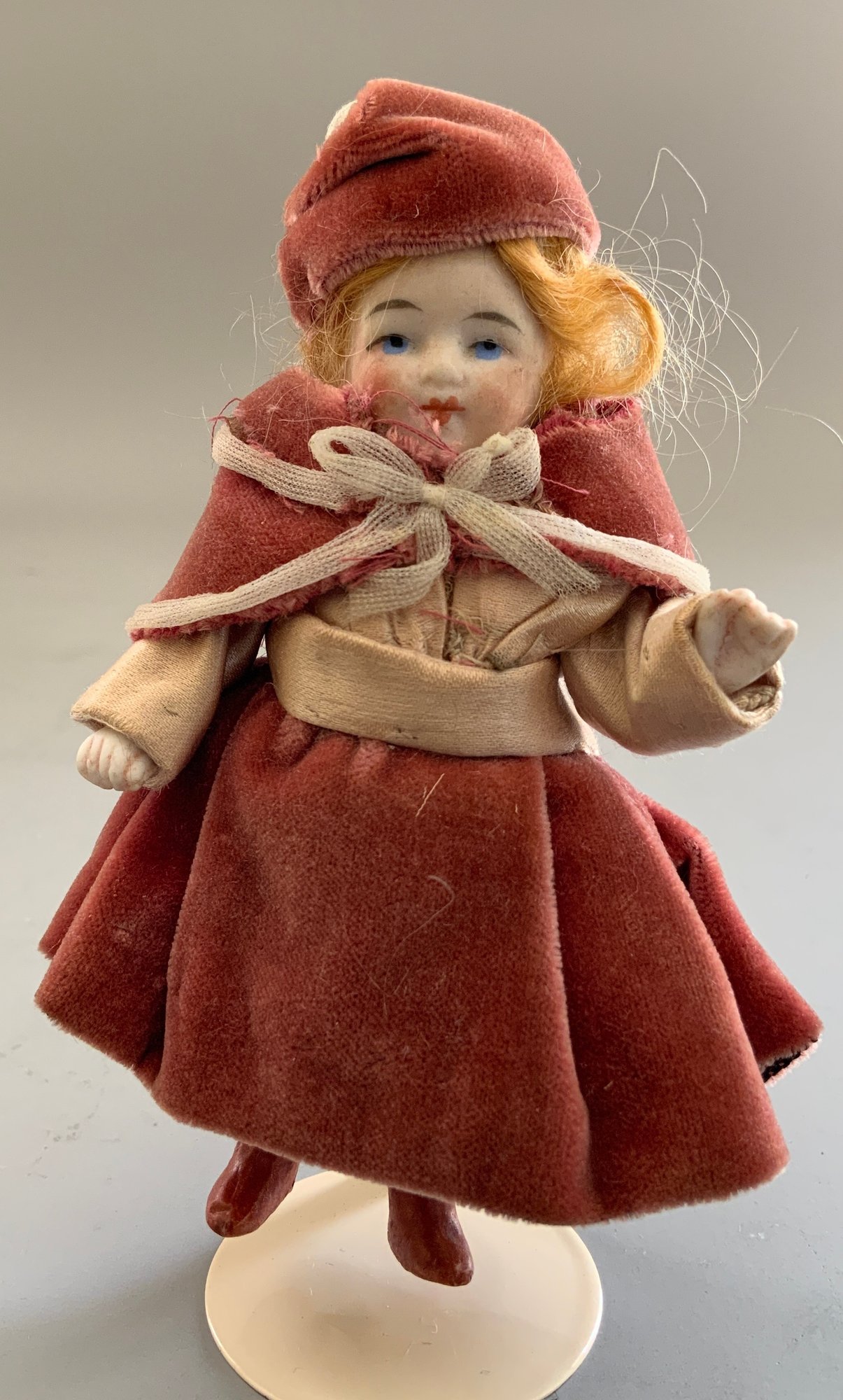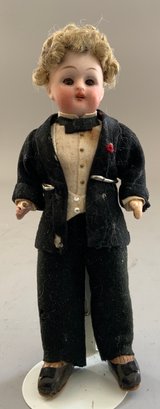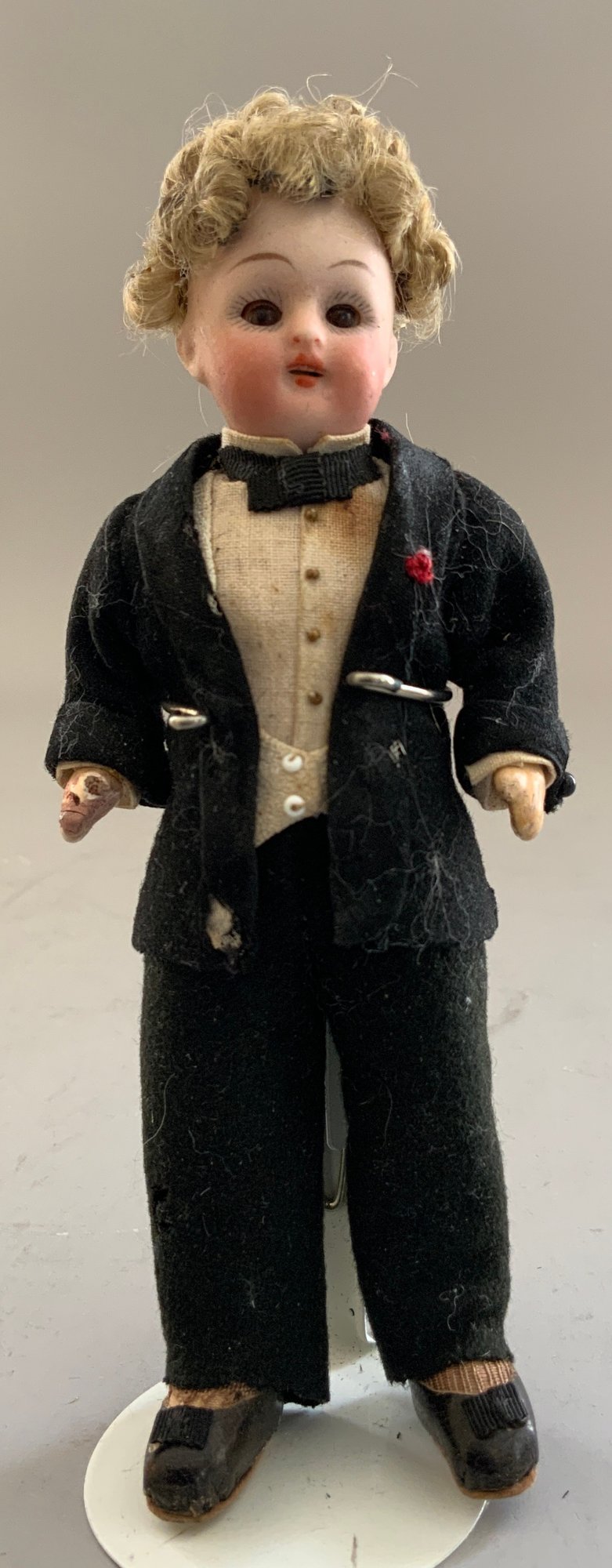 6 – Assorted bisque small dolls, 4” – 6”, mohair wigs, 3 – all bisque, 3 – compo bodies, 1 – red lace incised 395, tuxedo boy has moth holes, various outfits