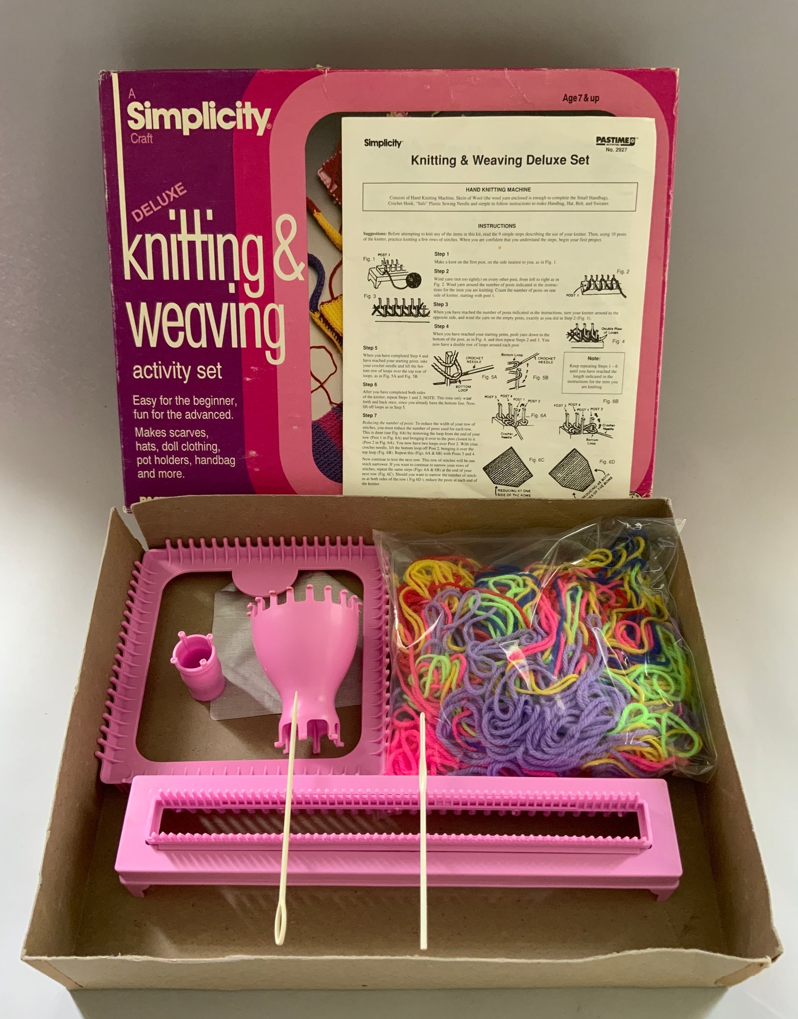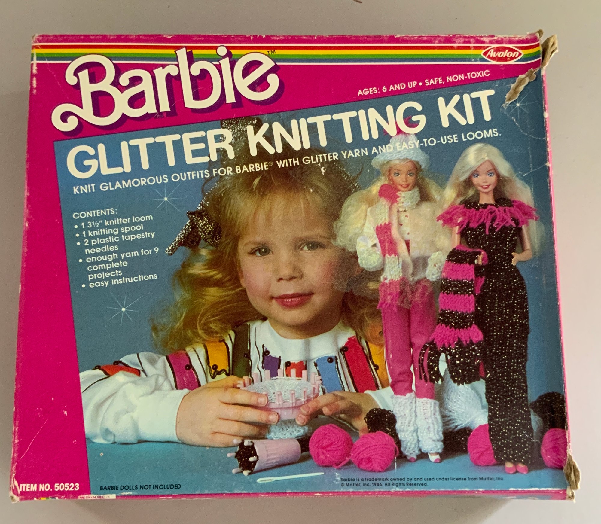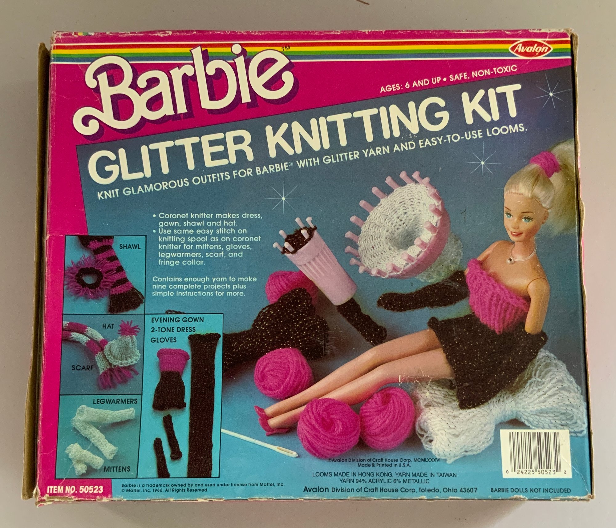 6 – Knitting & Crochet Sets, Barbie Glitter Knitting Kit #50523 Avalon 1986, Crafts Mate #9110A/B, Mountains Plastic Factory, Simplicty Knitting & Weaving # 2927, Pastime Industries 1992, Knit Wit Starter Kit, Yankee Homecraft, 1965, Deluxe Needlecraft Chest, Avalon 1980, Knitting Fun Dolly & Me Knitting Kit, #2923, Pastime Industries, 1996
