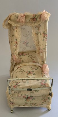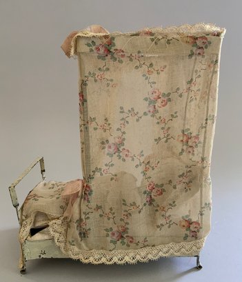 6 ¼” Long tin corner bed, with floral & lace corner canopy & bed coverings