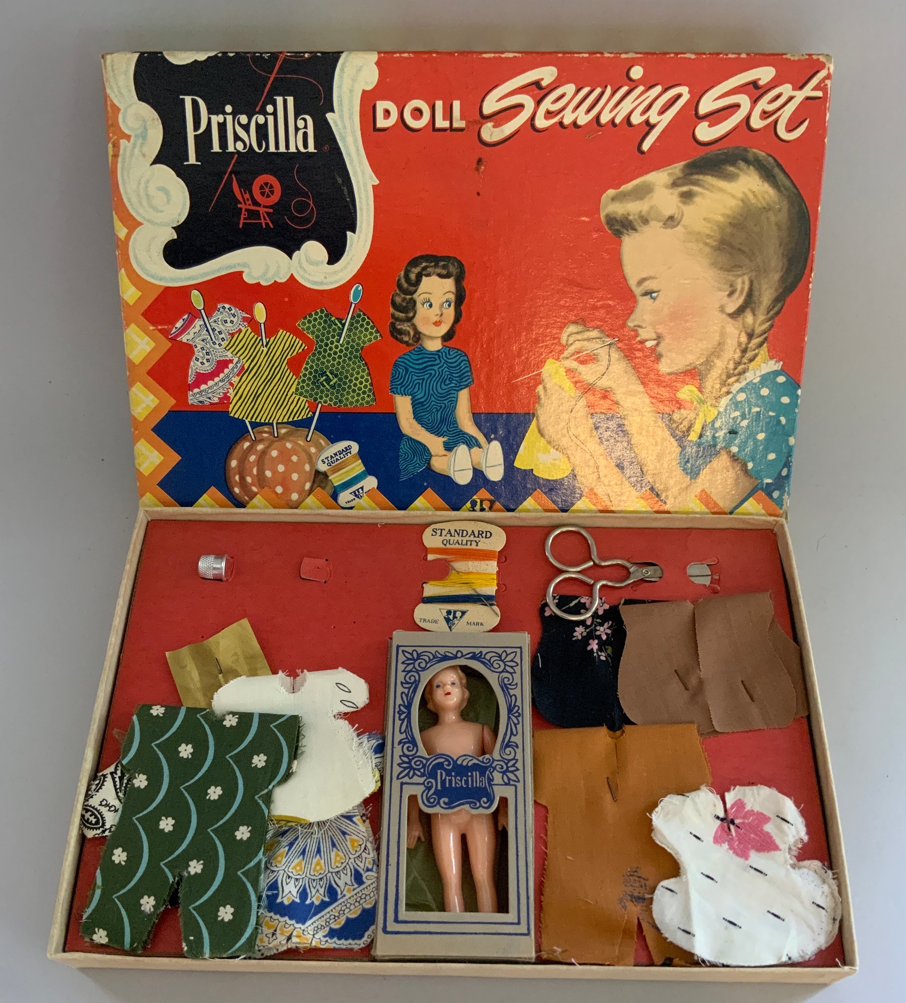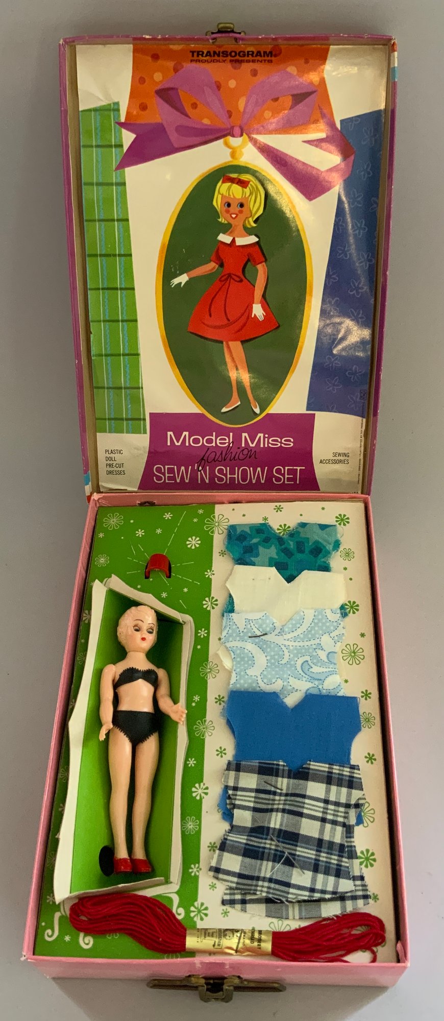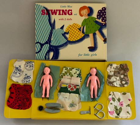 6 – Plastic Doll Sewing Sets, The Little Dress Maker, Model Miss Fashion Sew n Show, Priscilla Doll Sewing Set, Jackie Doll Sewing Set, Packard Toys Sewing Set, & Little Miss w/2 dolls Set, original boxes some wear