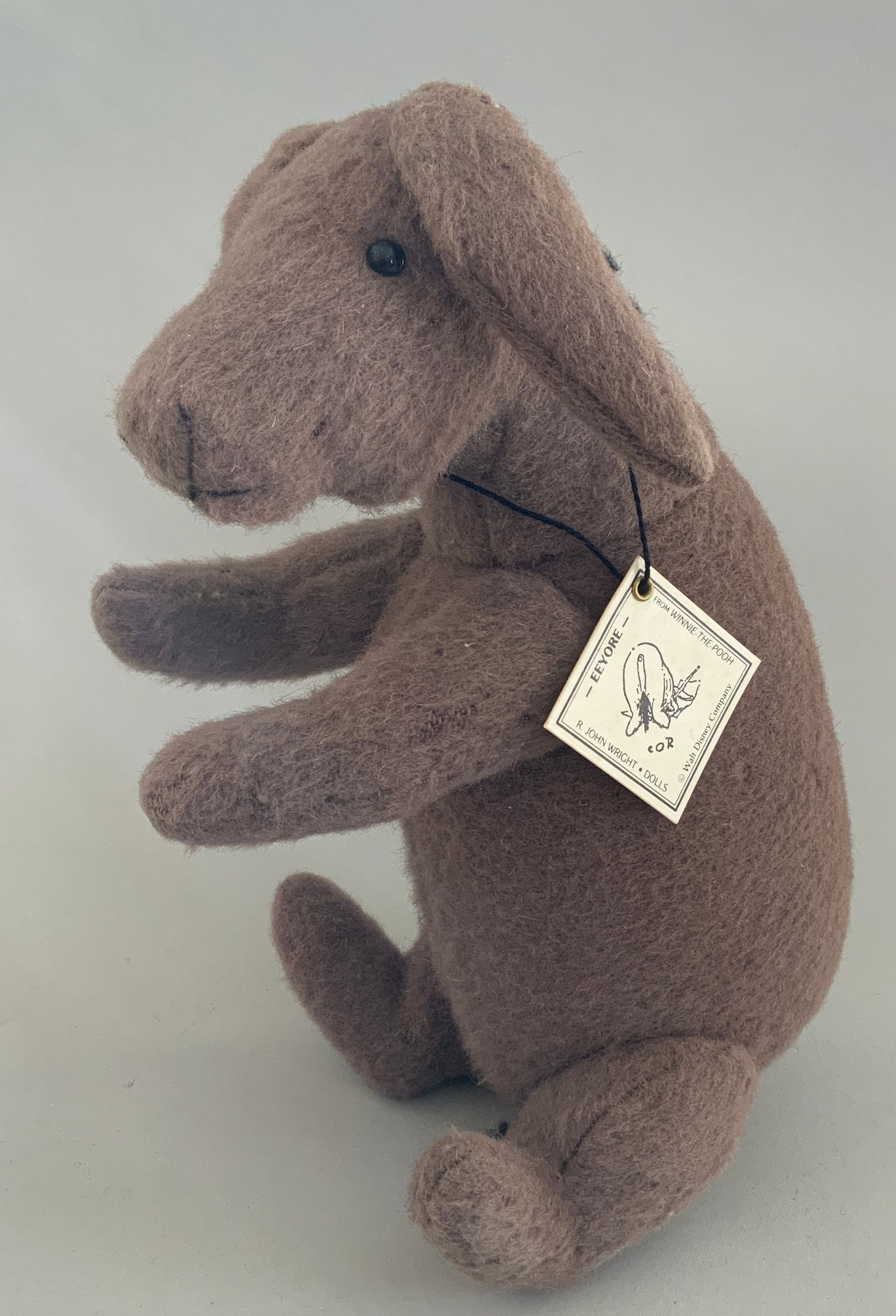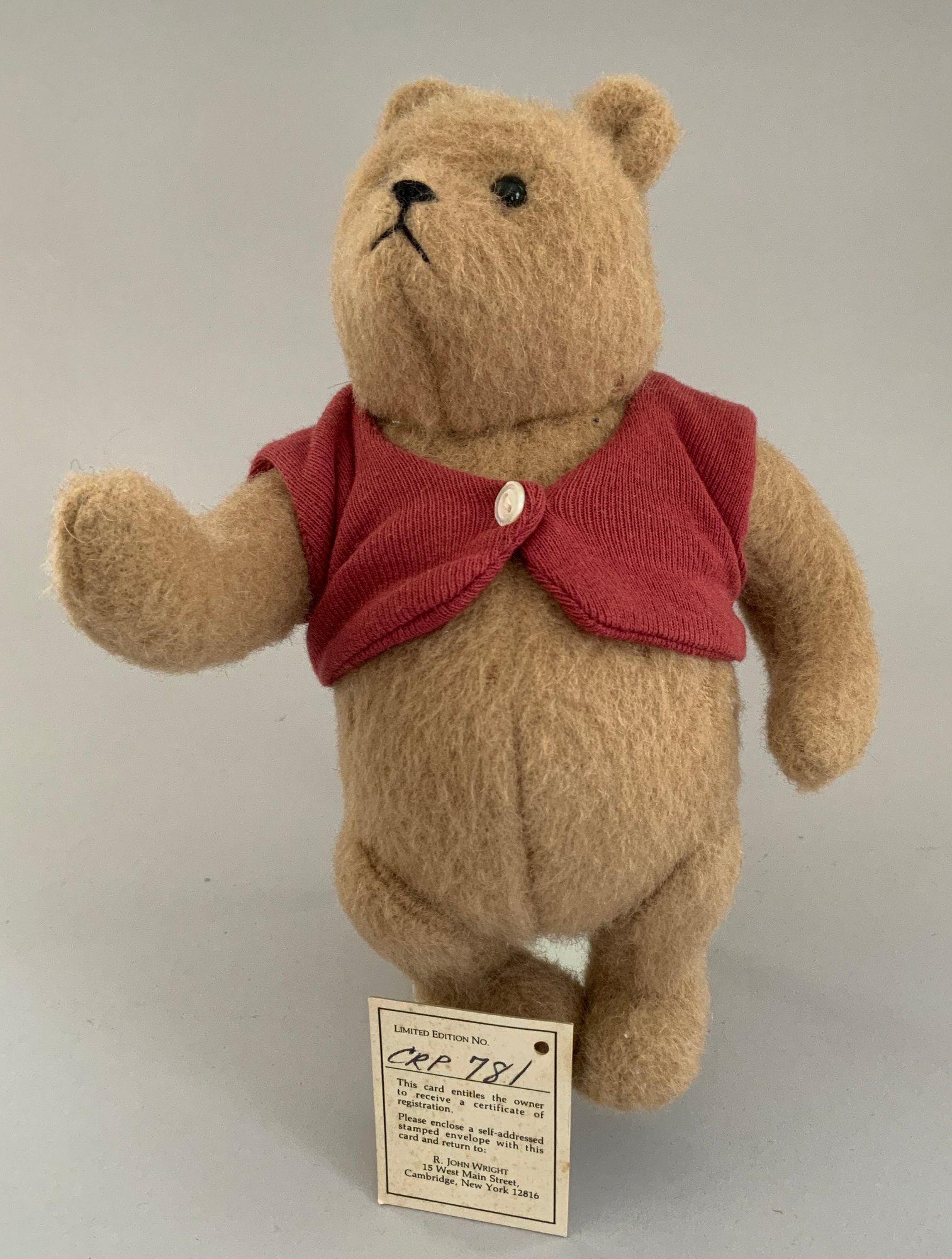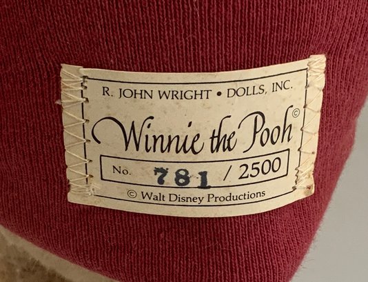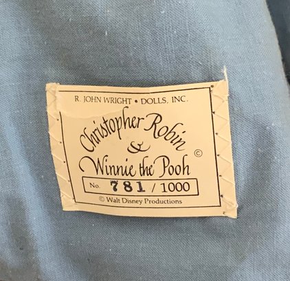 6 – R John Wright doll/animals, 17” Christopher Robin 781/100, painted features, (lightly soiled outfit, 1 – 5 “ Piglet 583/1000 good condition, 1 – 8” Winnie the Pooh 781/2500 (moth damage), 1 – 8” Tigger 449/1000 (moth damage), 1 – 9” Kanga & Roo 403/1000 (moth damage)