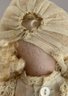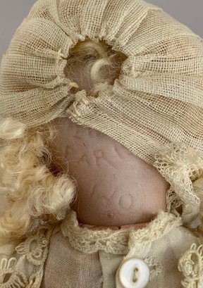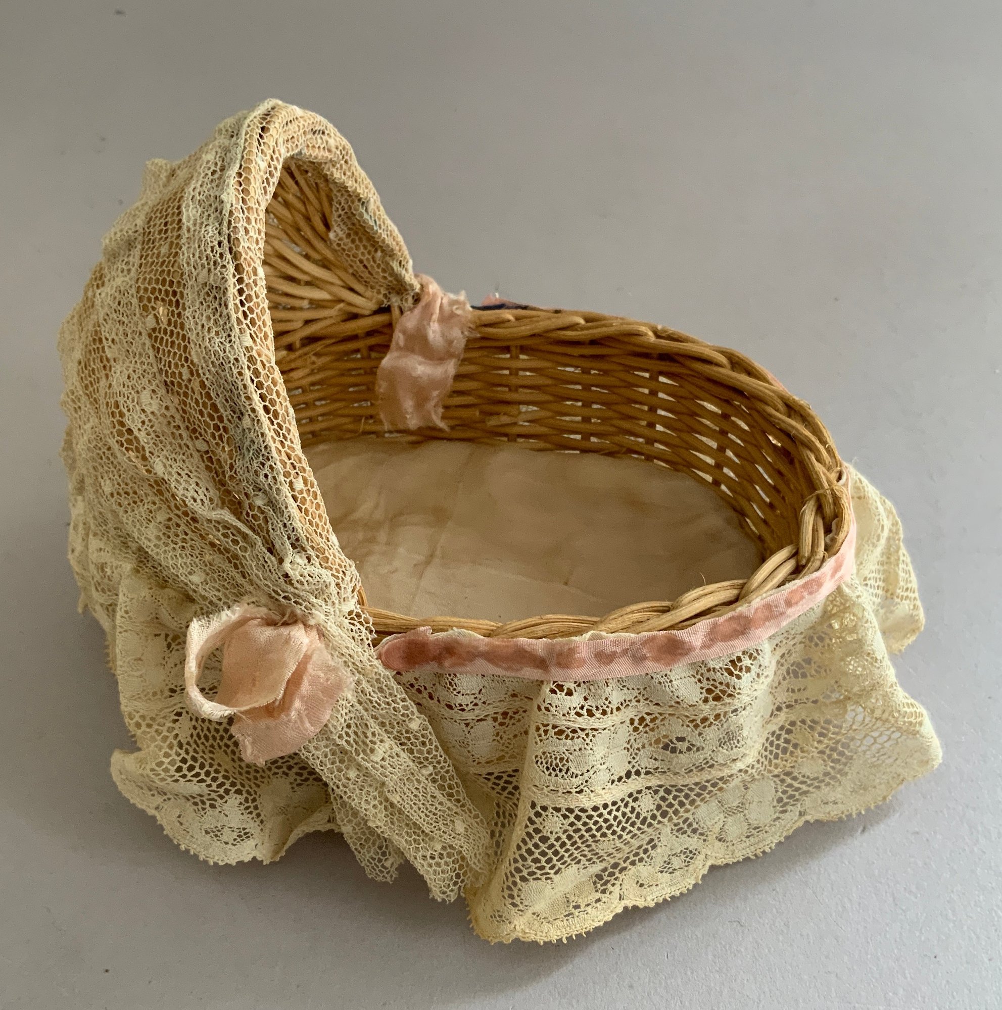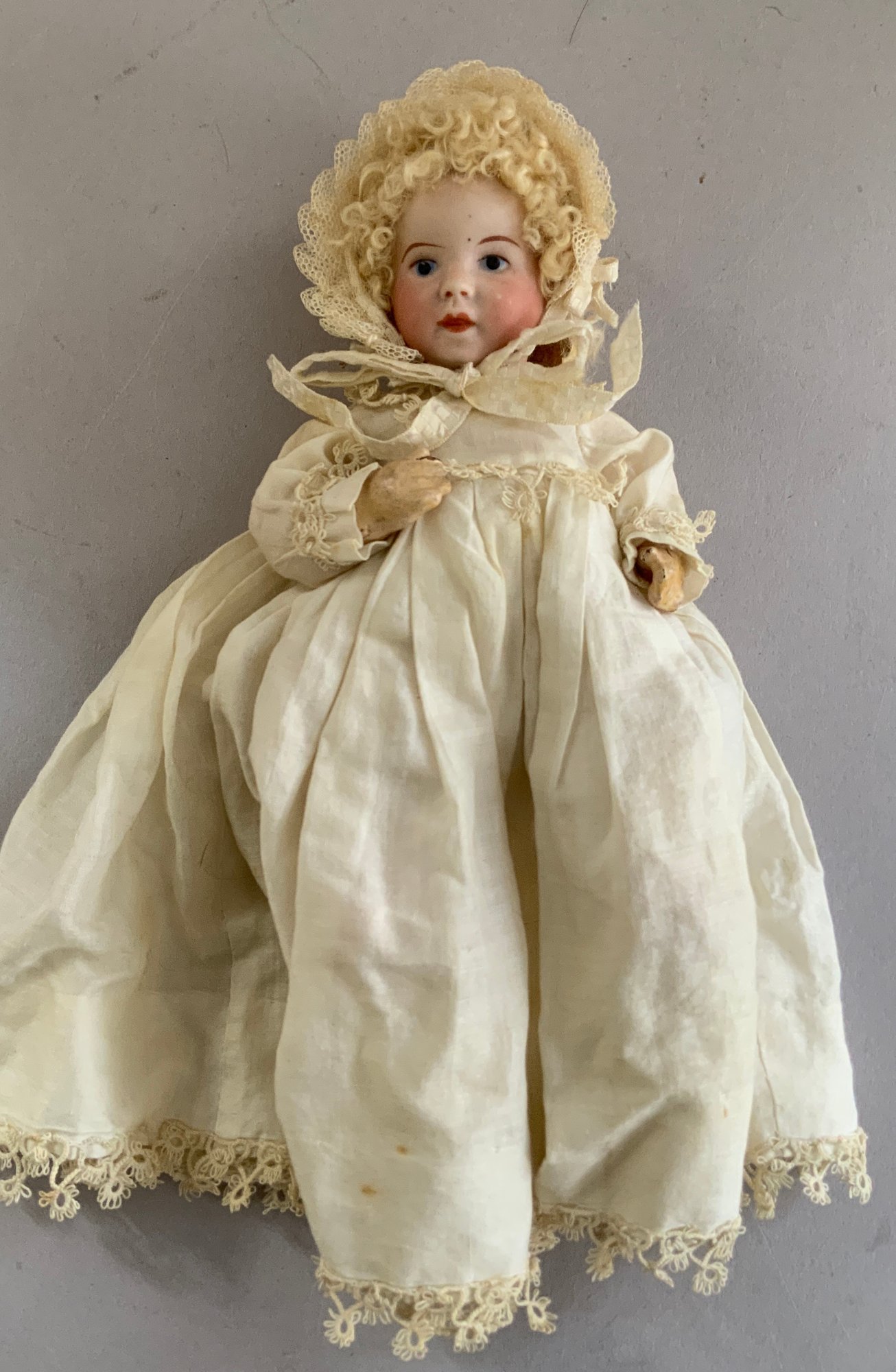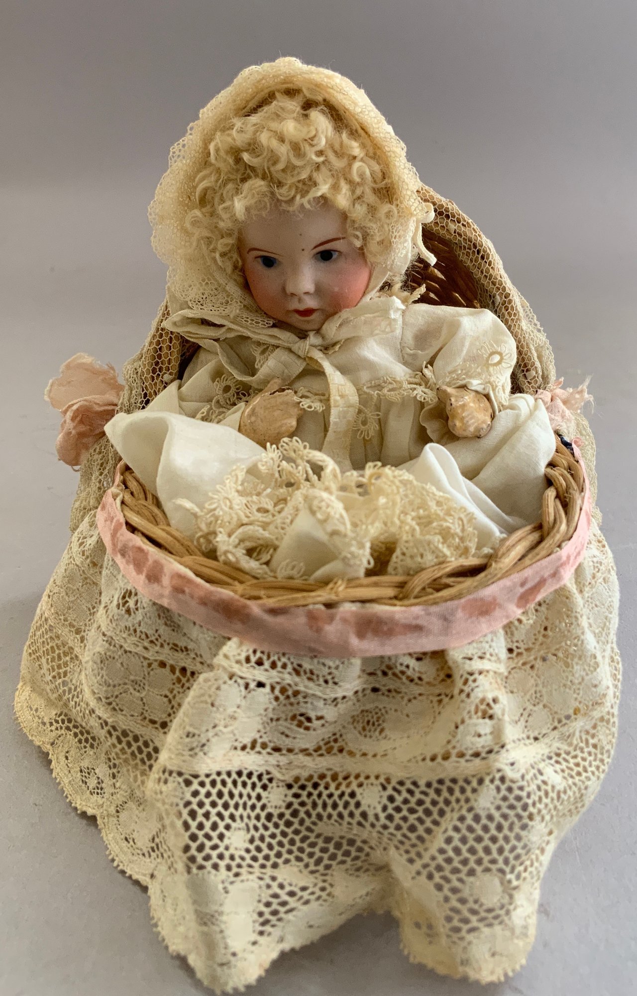 6 ½” SFBJ 247 Paris baby, painted features, CM, blonde mohair wig white dress in presentation basket, (2 tiny black specs on forehead)