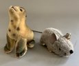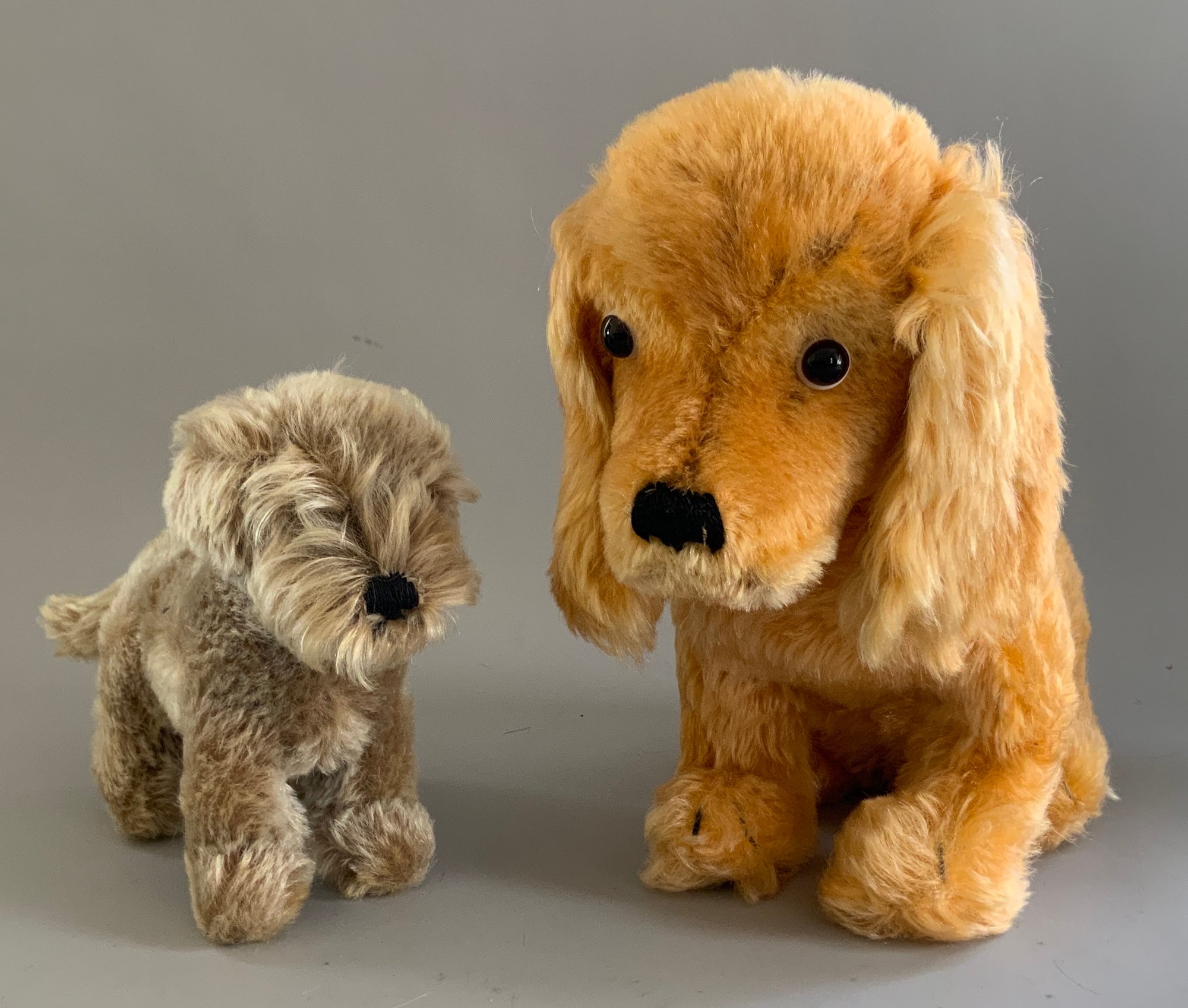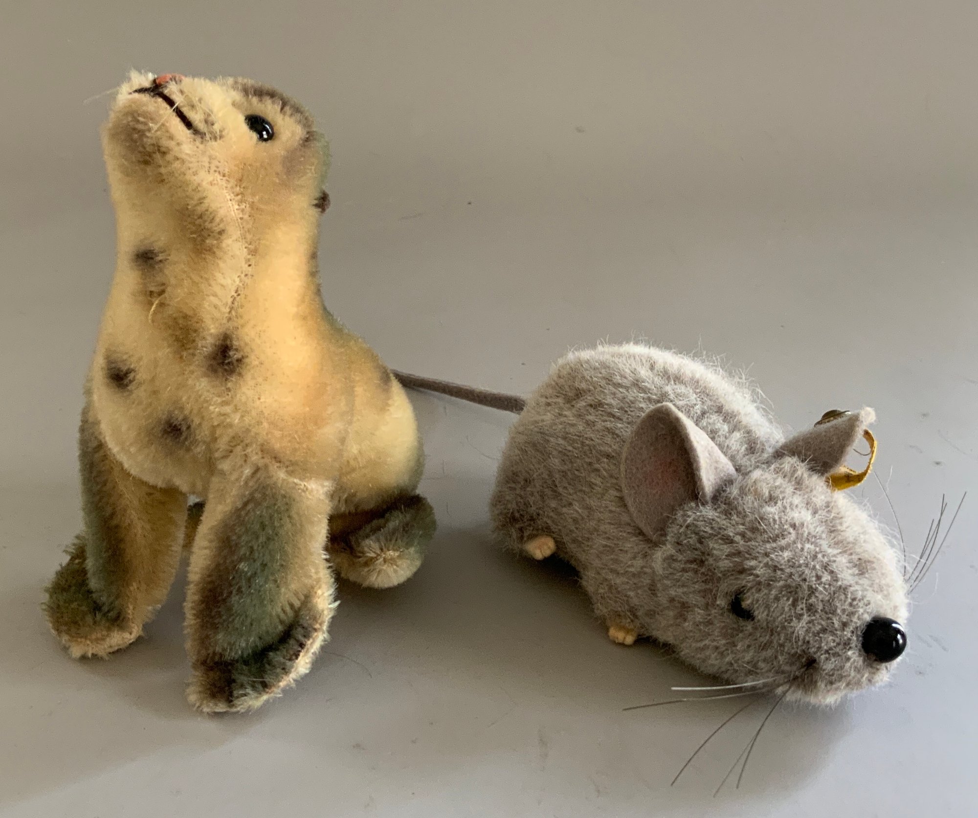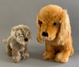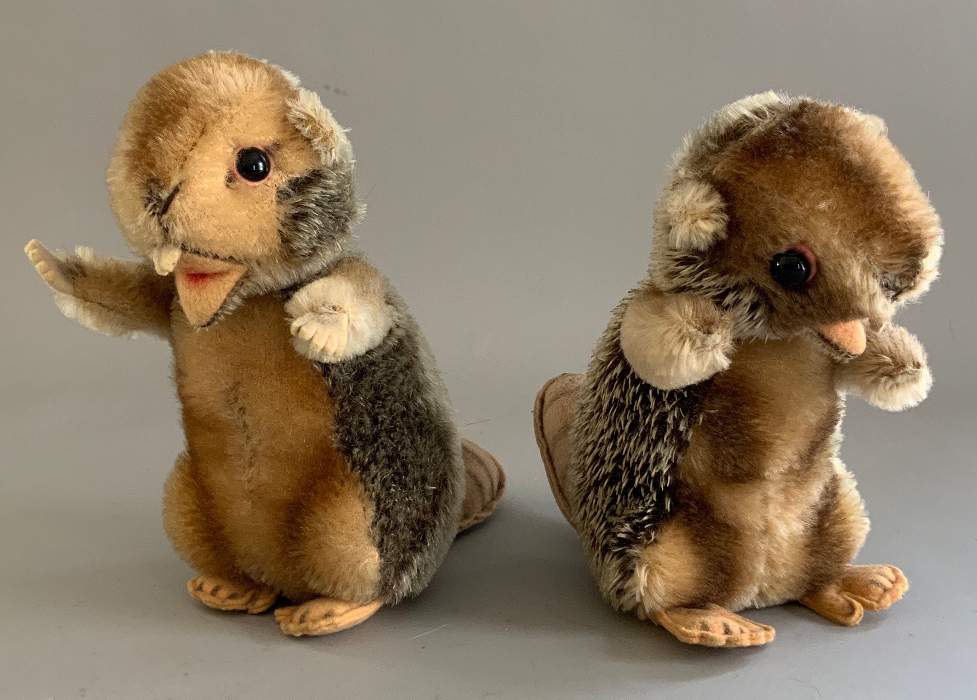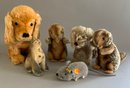 6 – Steiff animals, 1 – 5” tall Seal, button in flipper, 1 – 5” Mouse Fiep, button in ear, 1 – 9” long Dog light brown, 1 – 9” tall seated dog, gold, button in ear, & 2 – 6 ½” tall Nagy Beavers, all in good condition