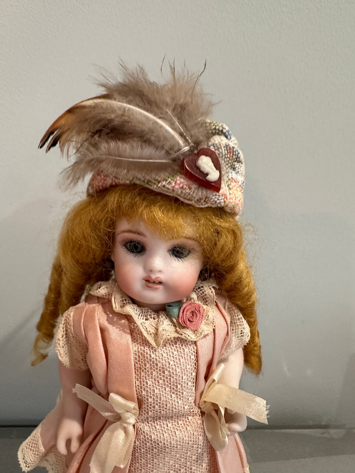 7” Beautiful reproduction Kestner wrestler by Mimi Marchant (Cape Cod doll artist), blue eyes, 2 teeth, beautifully dressed (hat is missing right now)