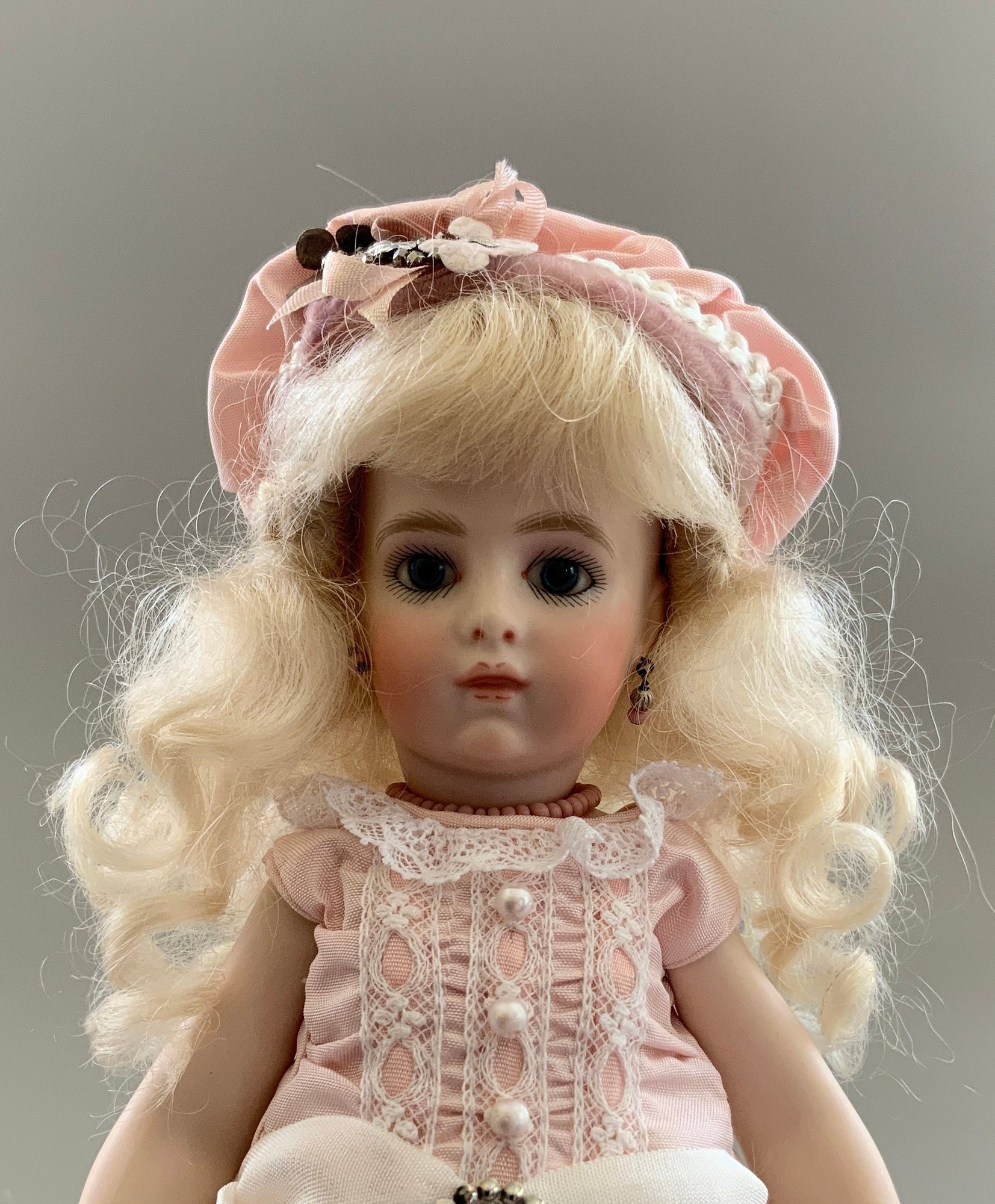7 ½” Darlene Lane Bru artist doll, incised mark 2017, blonde hair, pleated pink outfit, “Chantel” UFDC doll