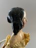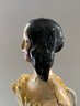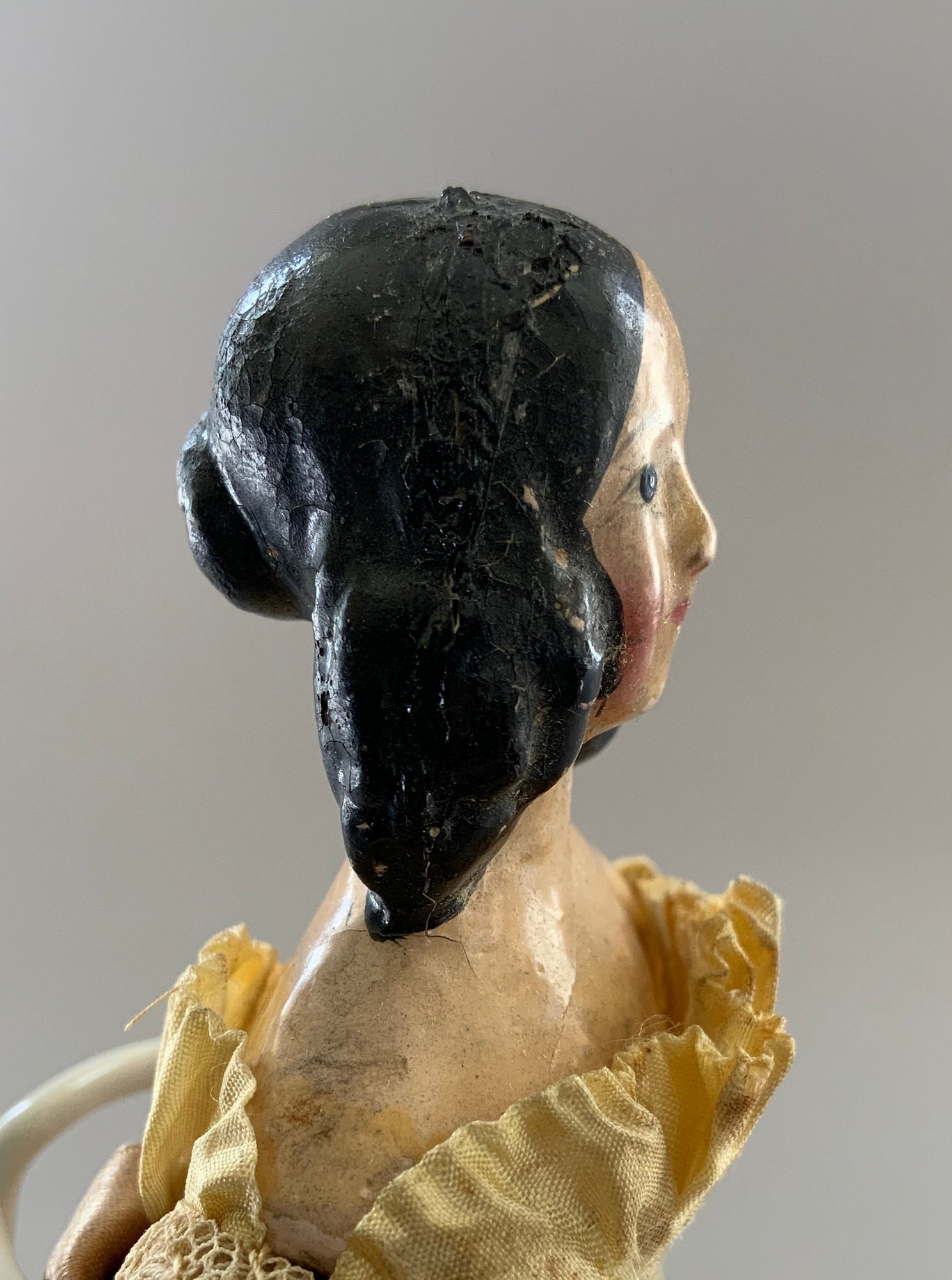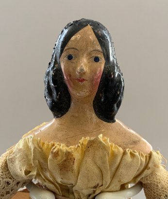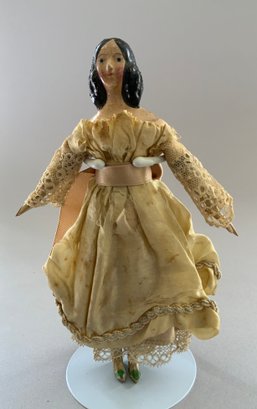 7” Paper mache shoulder head, painted features, long black side curls & back bun, kid body with wood limbs, early silk & lace dress (melting), crazing to shoulder plate,
