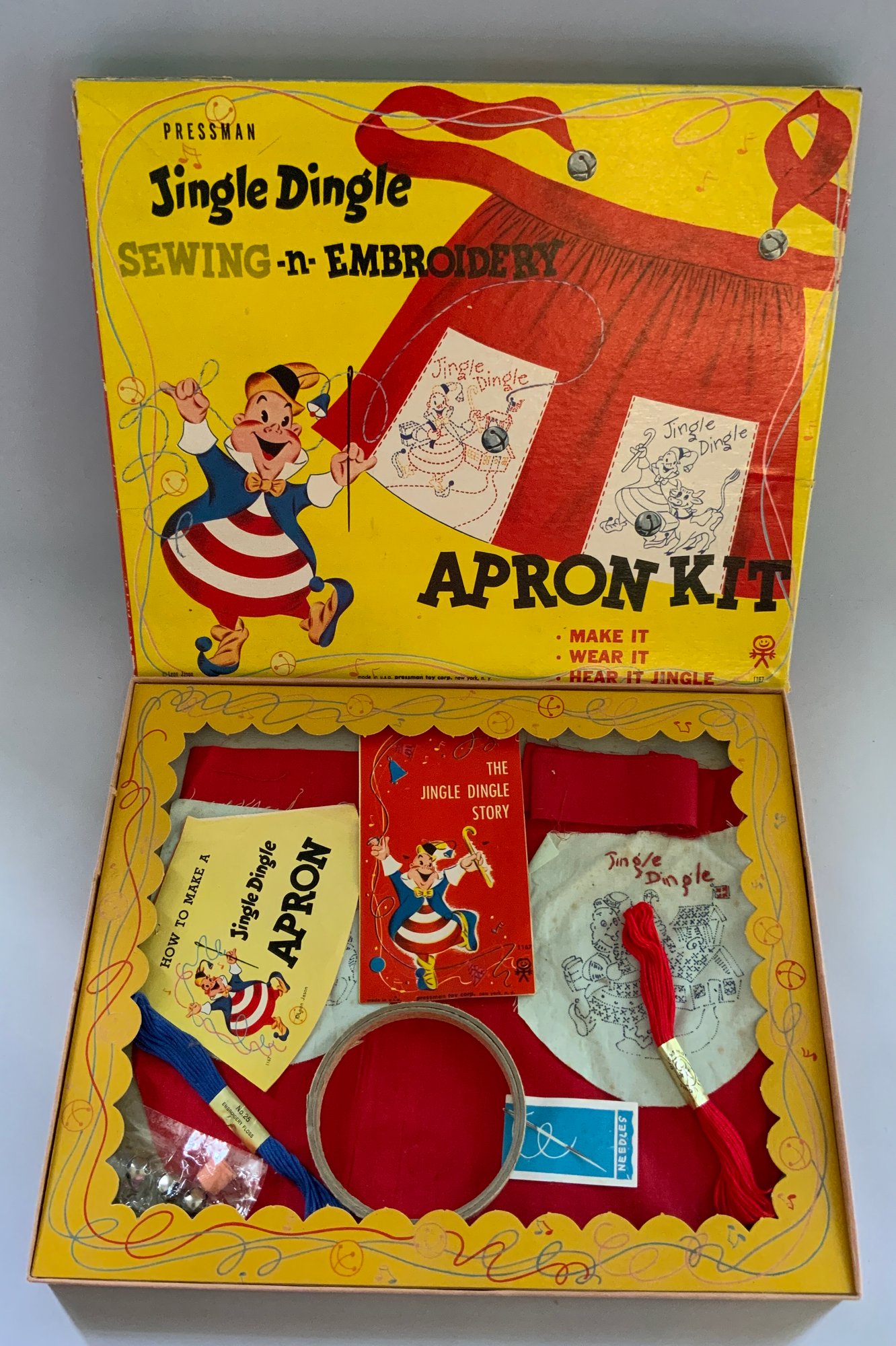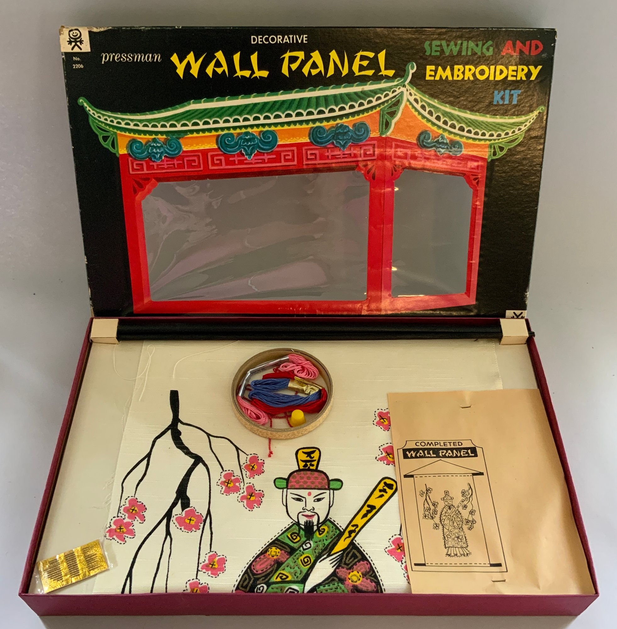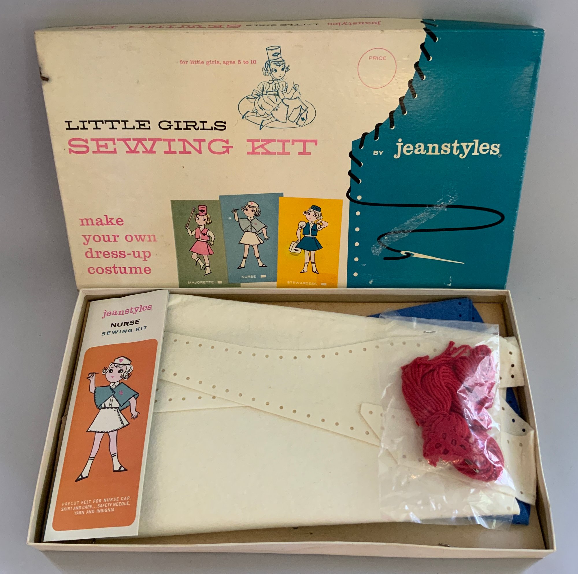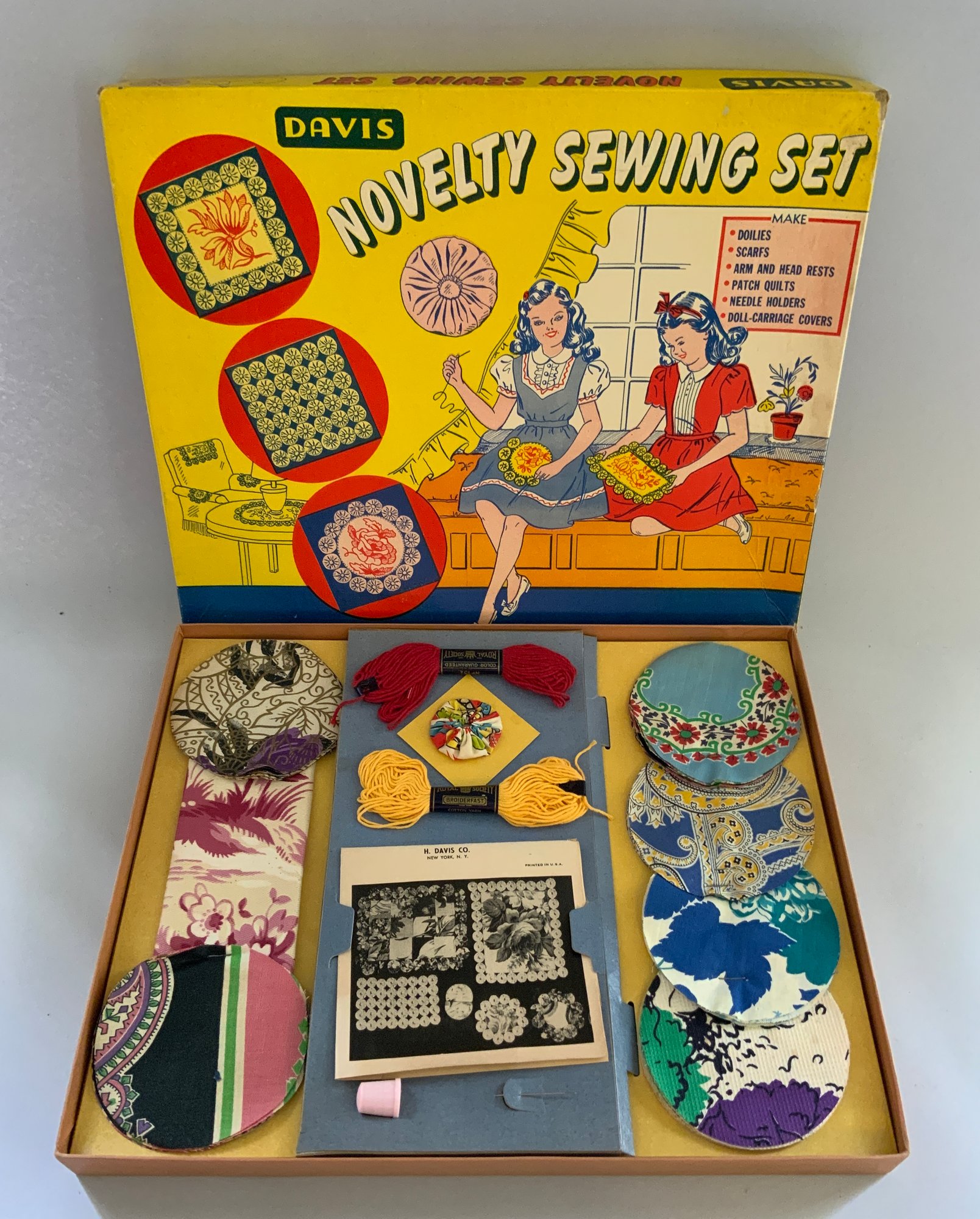 7 – Plain Sewing Sets, Nancy’s Sew-A-Toy, Oriental Sew-Ji Fabric Wall Panel #2206, Cadillac’s Doll Patch Quilt Set No. 170, Little Girl’s Sewing Kit #7000, Jingle Dingle Sewing-n-Embroidery, Davis Novelty Sewing Se, Hasbro Dipsy Doodle Bag, original boxes some wear