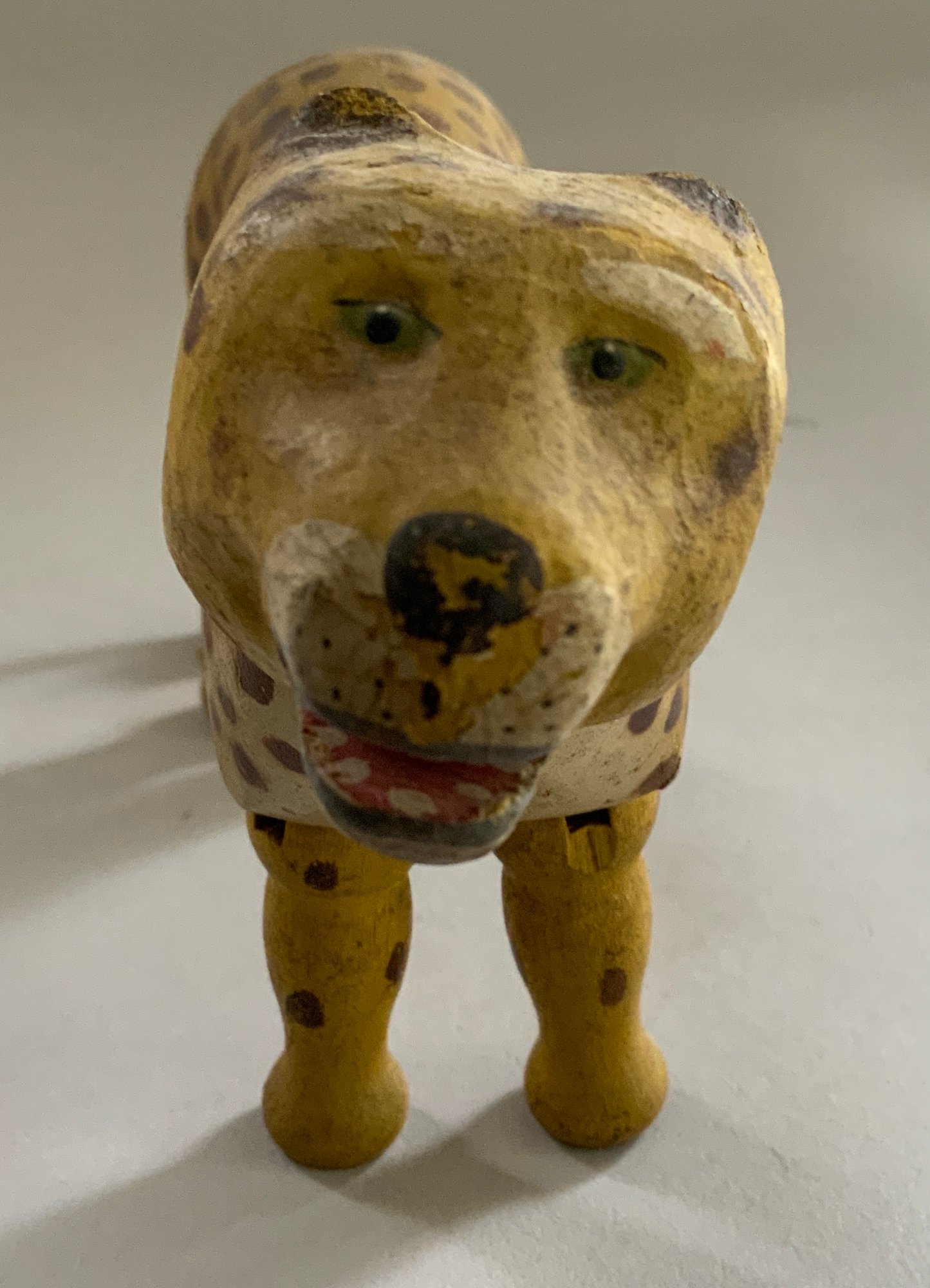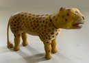 7 ½” Schoenhut wood Leopard, painted features, single jointed neck, open mouth with painted teeth, rope tail, (rubs & light wear)