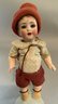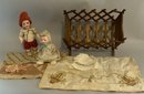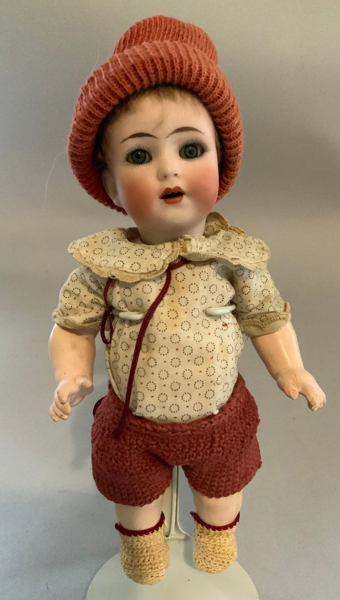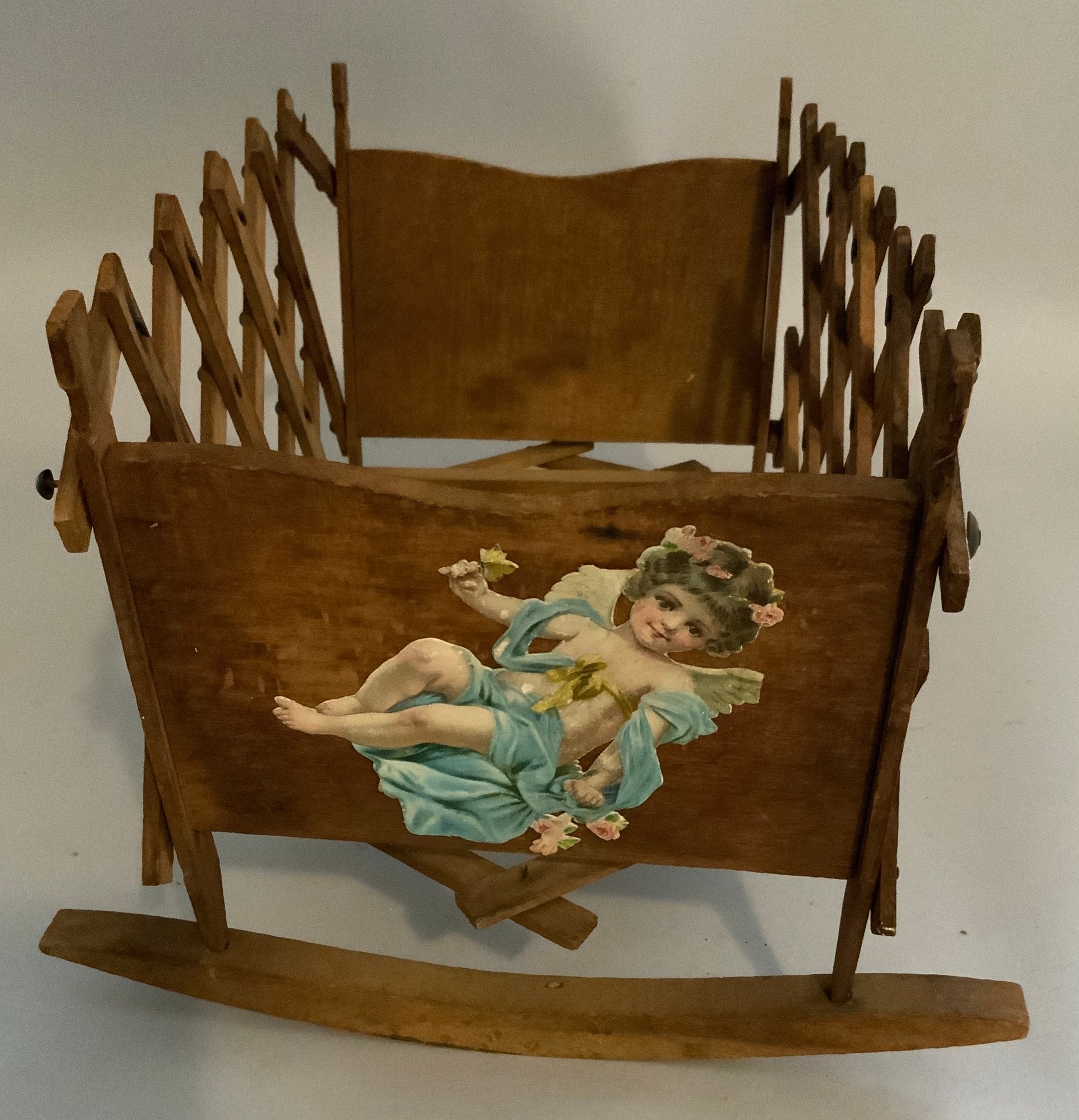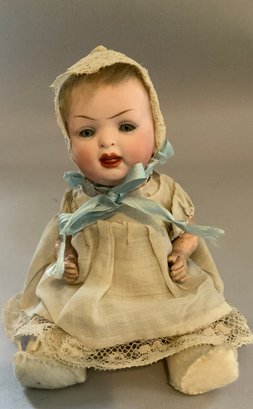 8” Bisque incised 152 3/0 Hertel & Schwab character baby, blue glass eyes, OM with teeth & tongue, blonde mohair wig, compo body, with wood adjustable cradle & quilts