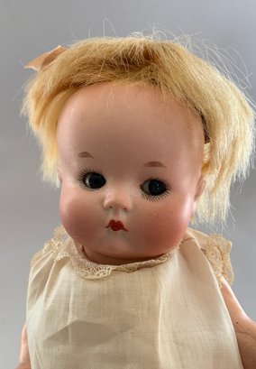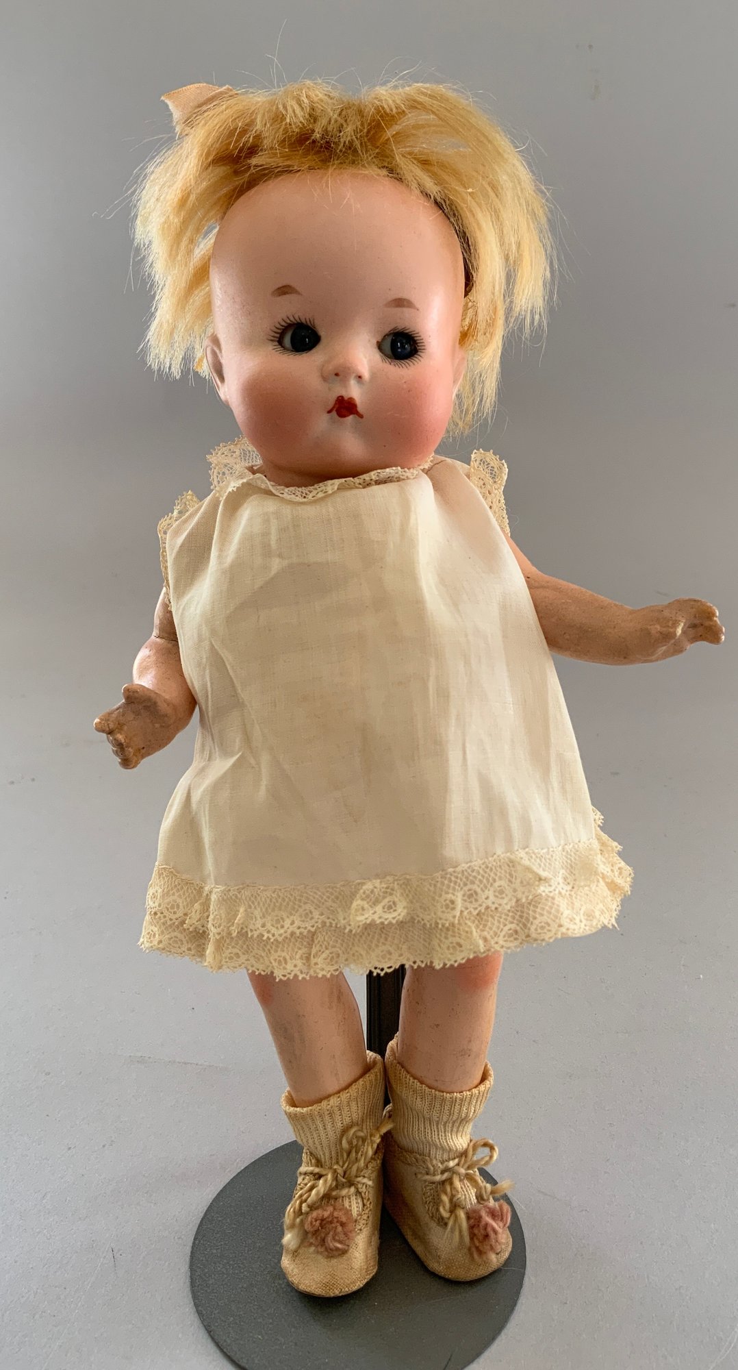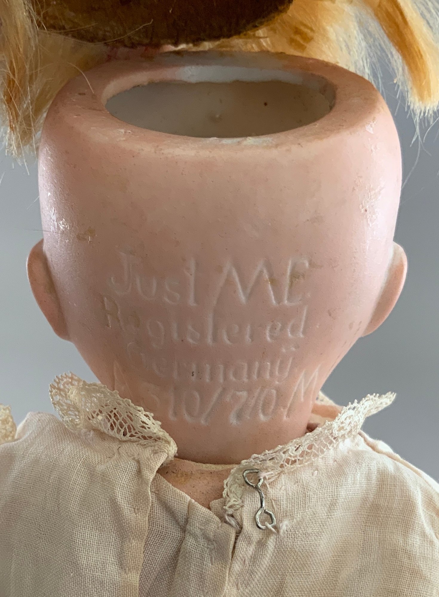 8 ½” Bisque “Just Me” Registered Germany 310/70/M, blue glass sleep eyes, CM, blonde mohair wig, compo body (light leg crazing), off white outfit