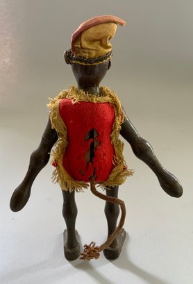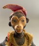 8” Schoenhut white faced monkey, painted features, red costume with yellow fringe (moth holes in back), 2 color hat, rope tail (rubs & wear)