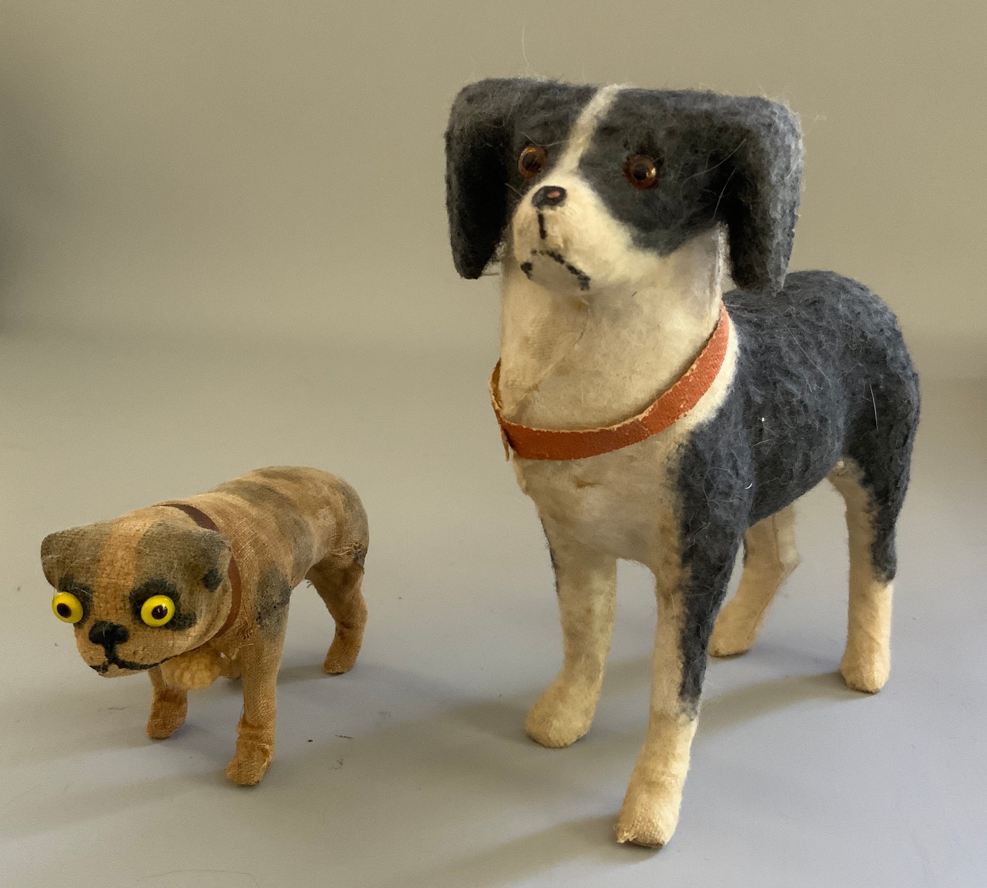 8 Small early animal toys 3” – 5”, Schucco pig playing violin, Bing cat (worn), Steiff cat with ball (worn), yes/no blonde teddy bear, etc.