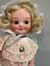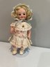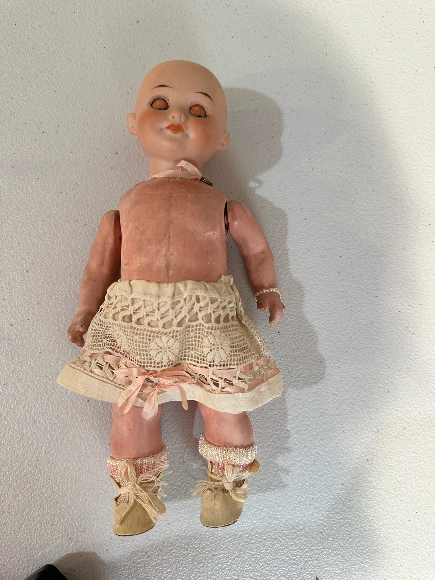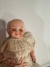 9” AM 323 Googly, sleep blue eyes, antique dress, blonde synthetic wig